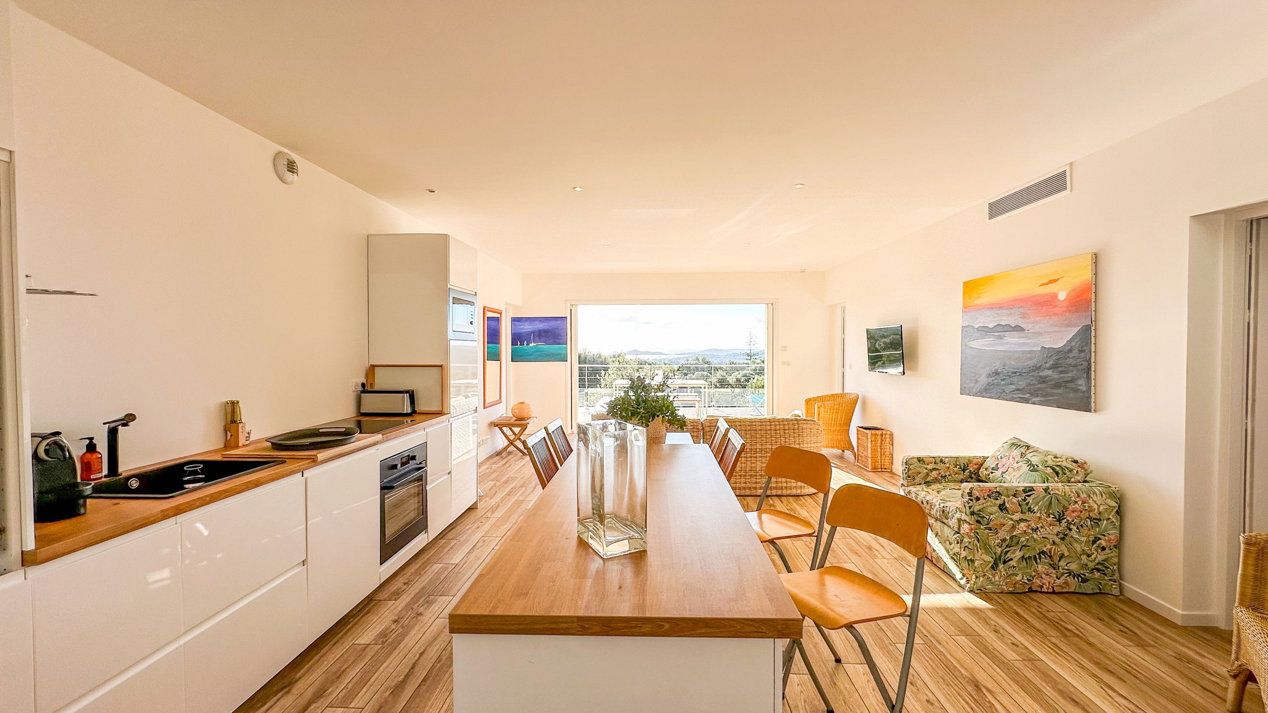 Open-plan kitchen: Modern and fully equipped with dishwasher, microwave, oven, fridge, freezer, coffee machine, blender, and everything needed for cooking.