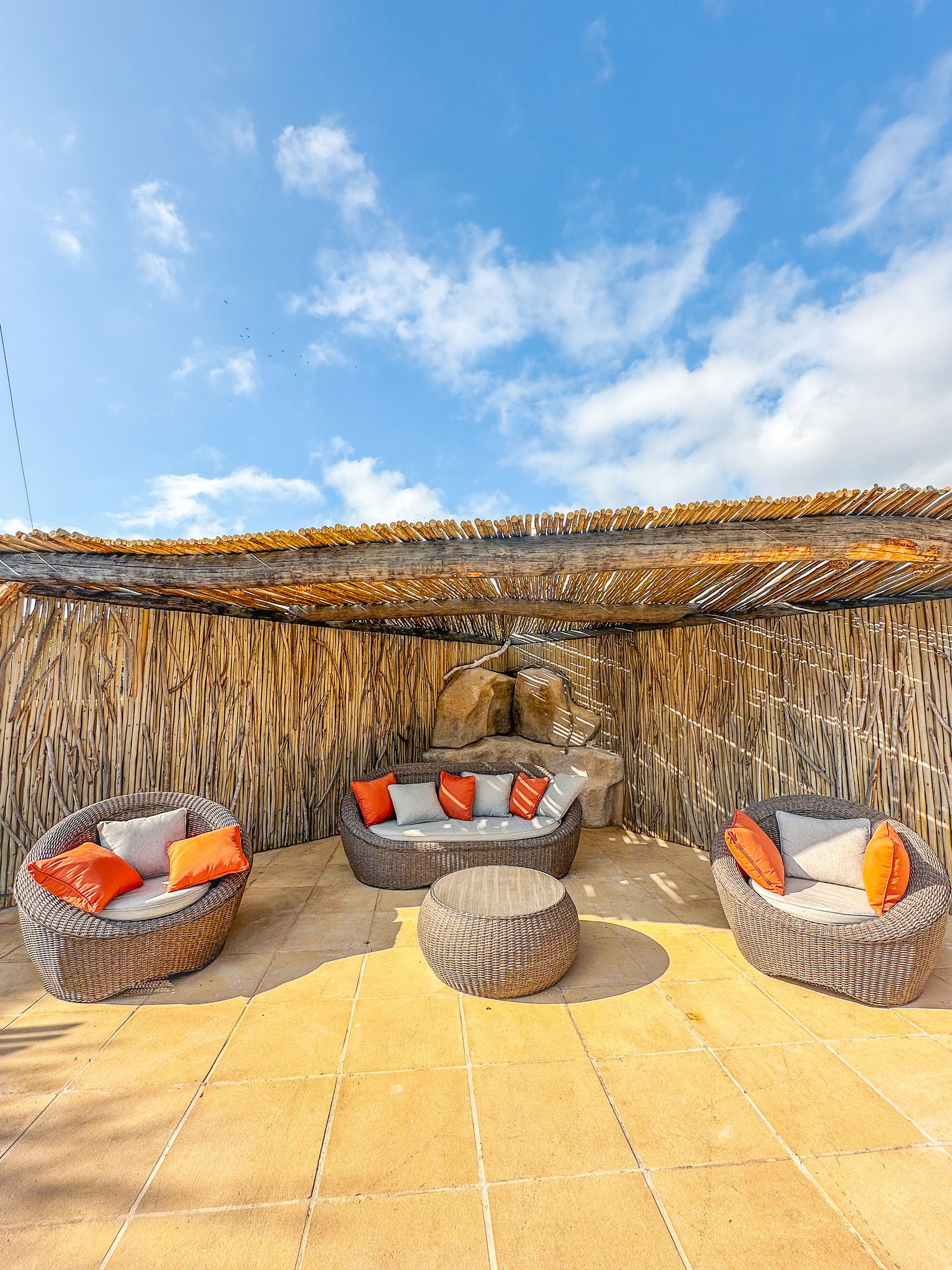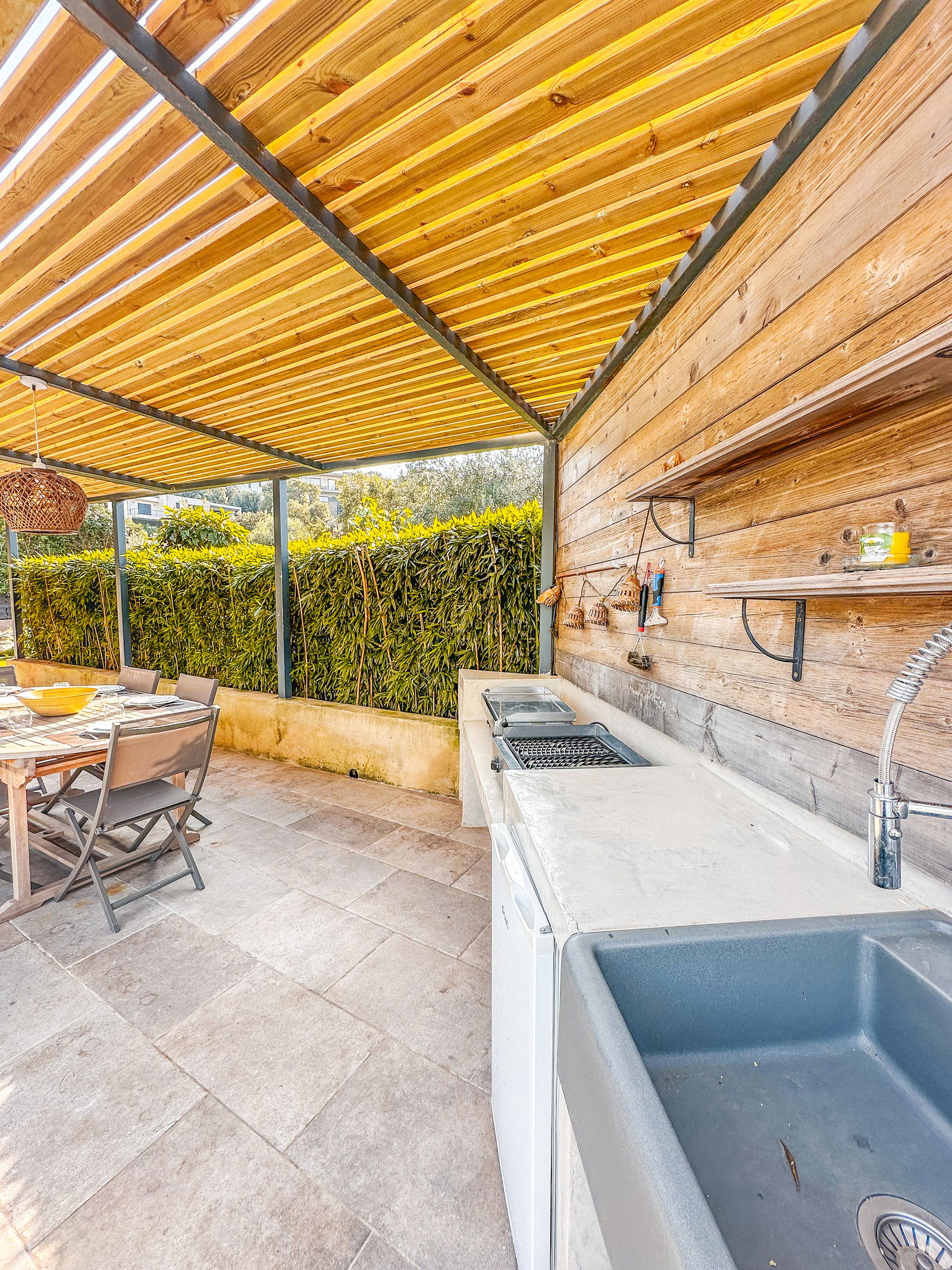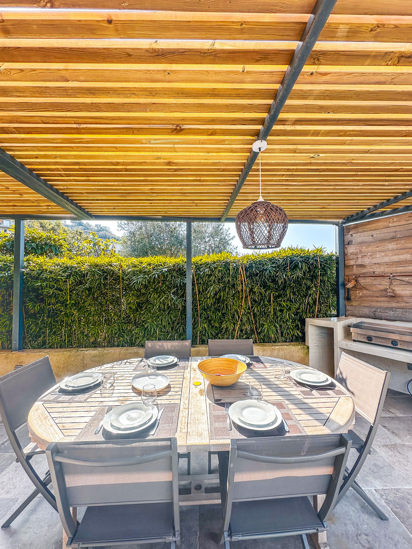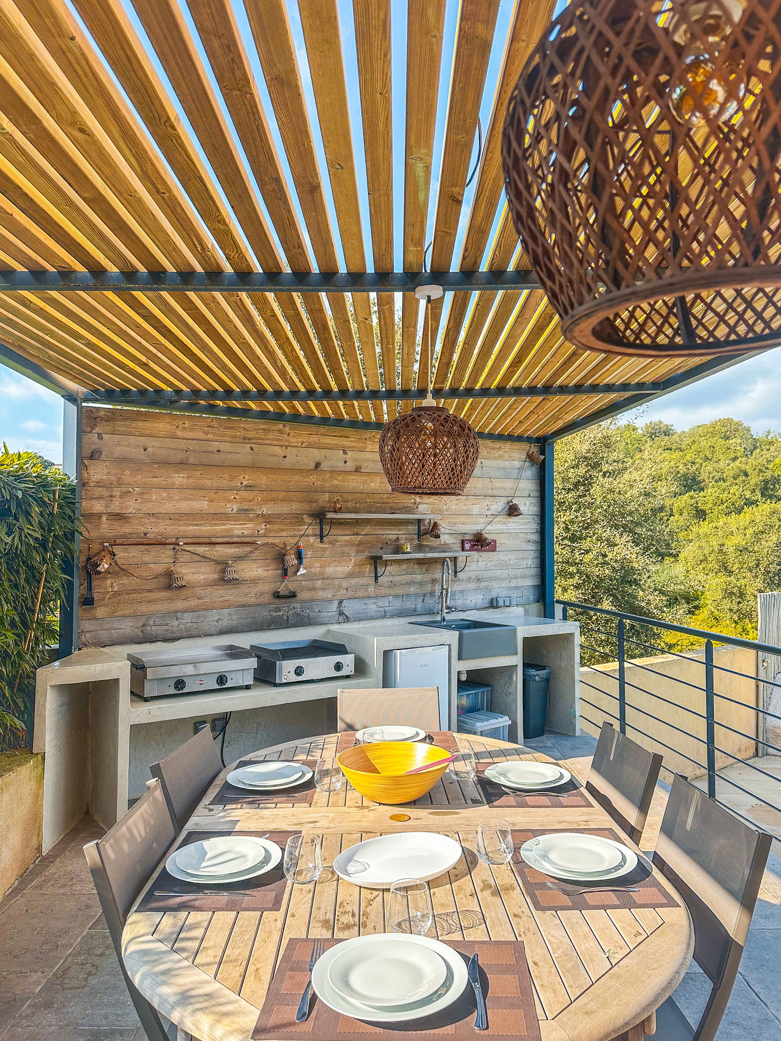 Dining area and outdoor lounge with barbecue and plancha for al fresco dining.