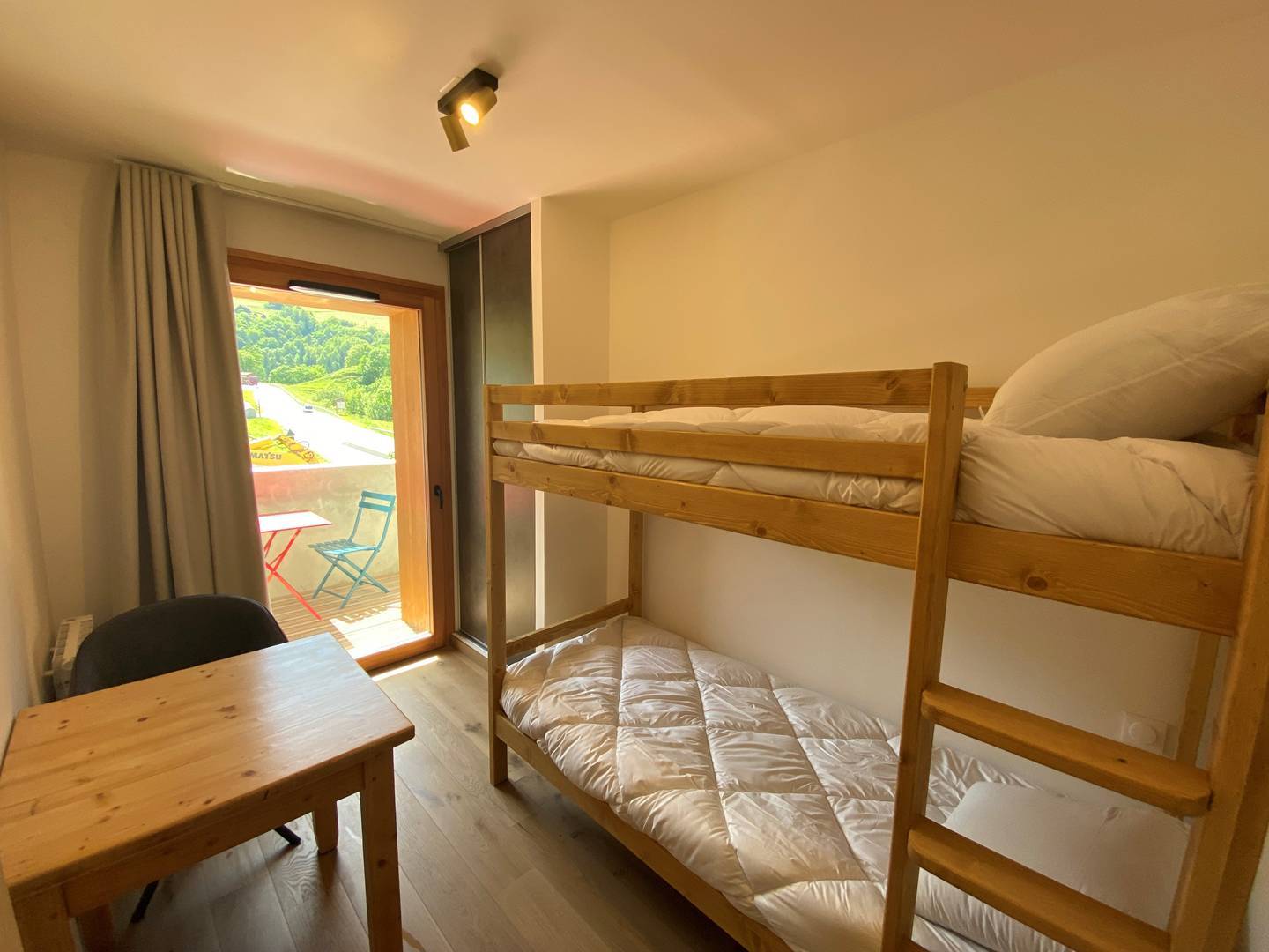 The cabin bedroom: a set of 90 bunk beds (2 beds), French window giving access to the balcony.