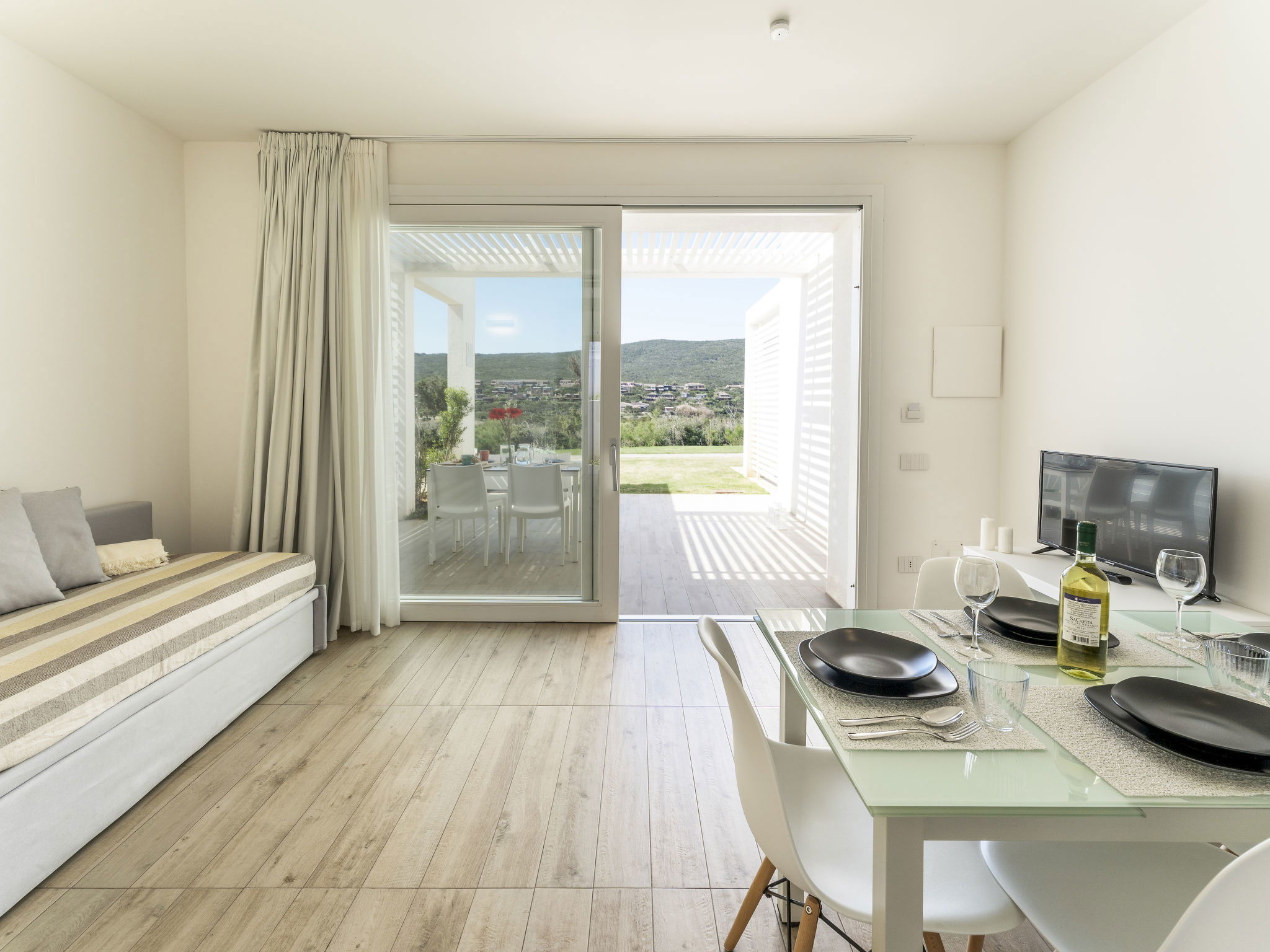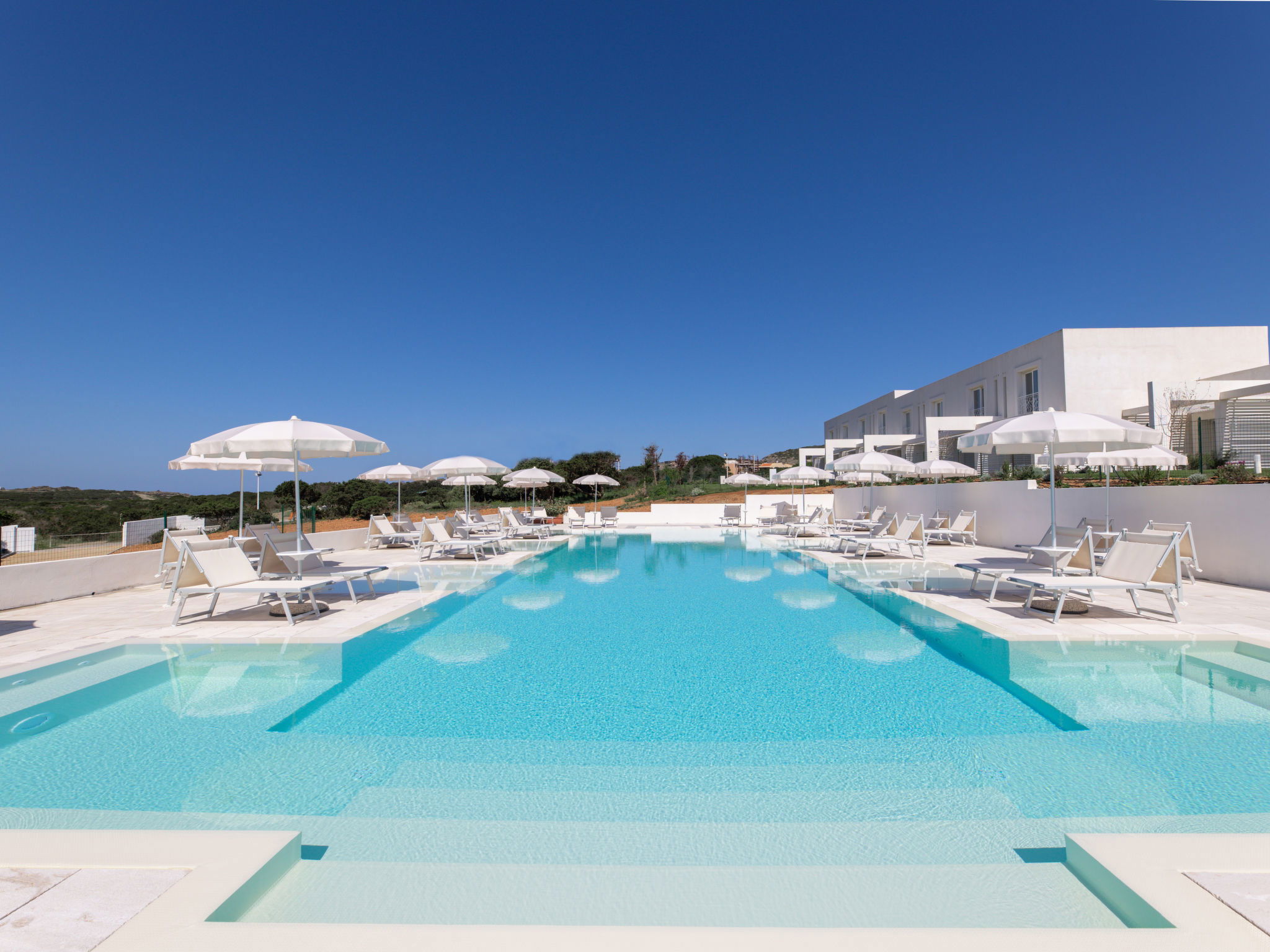 Modern, beautiful residence "Capo Falcone Charming Apartments". 54 apartments in the residence. 4 km from the centre of Stintino, 30 km from the centre of Porto Torres, 250 m from the sea, 250 m from the beach. For shared use: property, garden with lawn and plants, swimming pool (20 x 10 m, depth 150 cm, seasonal availability: 28.Mar. - 30.Oct. pool opening hours: 09:30-19:30). Barbecue, children's playground. In the complex: reception, WiFi, washing machine, tumble dryer (for shared use), bicycle rental. Parking on the premises. Restaurant, bar, café 500 m, bus stop 800 m, ferry "Porto Torres" 30 km, sandy beach "La Pelosa" 250 m, rocky beach "Spiaggia della Pelosetta" 1 km, diving center 3 km. Sports harbour 3 km, surf school 3 km. Nearby attractions: Parco dell'Asinara 13 km. On request: airport transfer to the holiday accommodation. Please note: the photograph shows a typical example. The holiday properties may differ in situation, size and location.