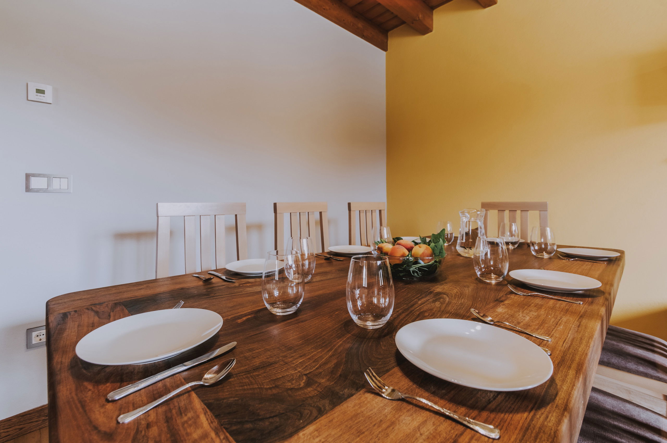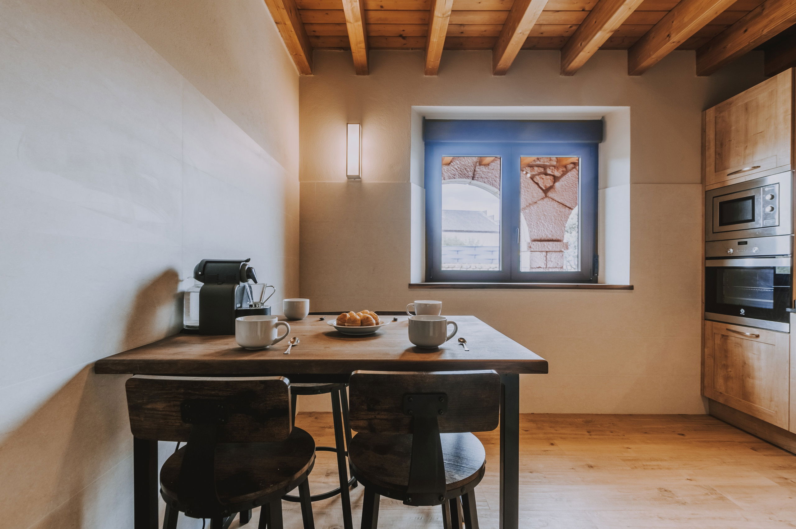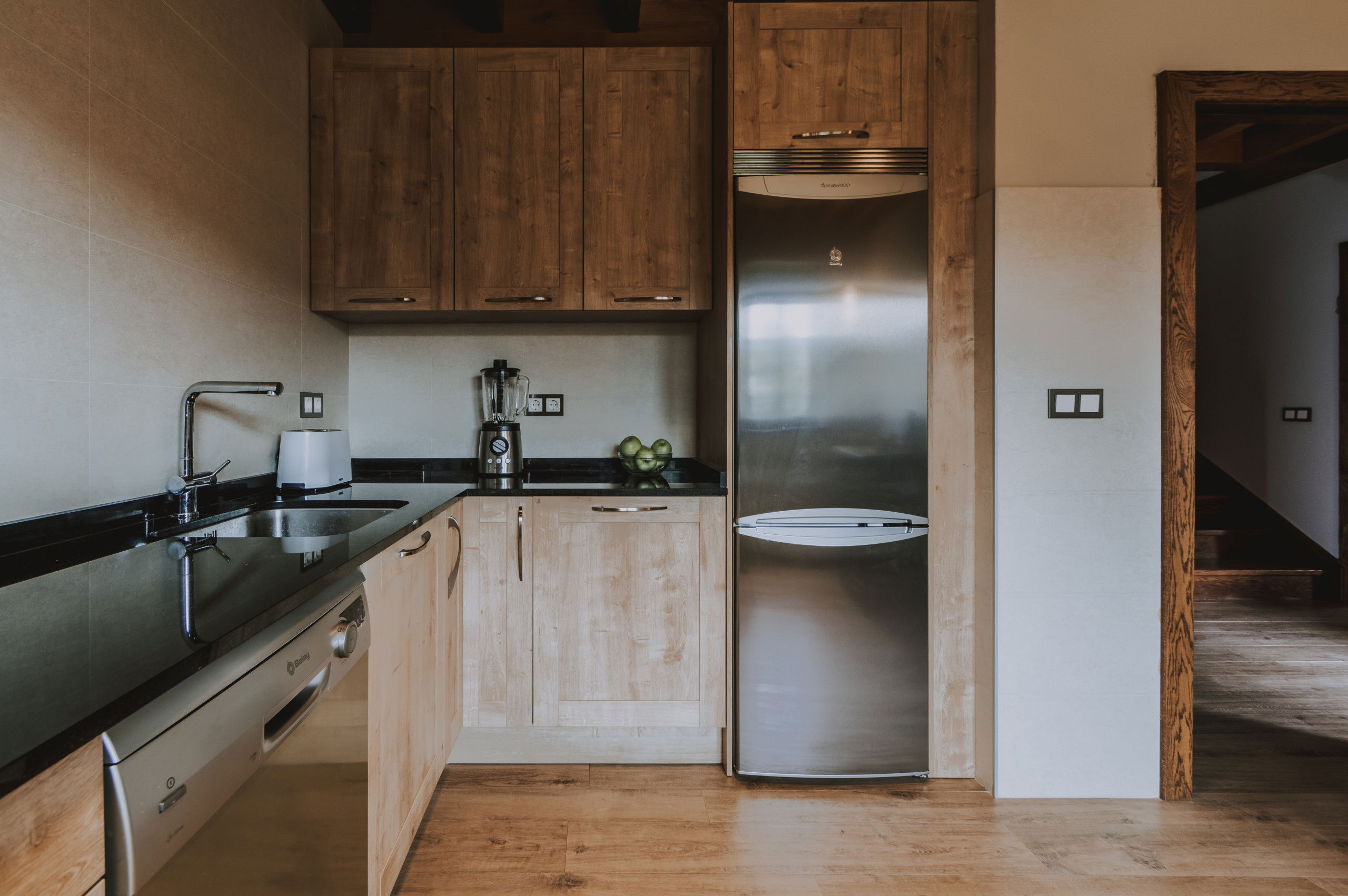 Modern fully equipped kitchen: oven, fridge, microwave, oven. It also has a table, ideal for breakfast.