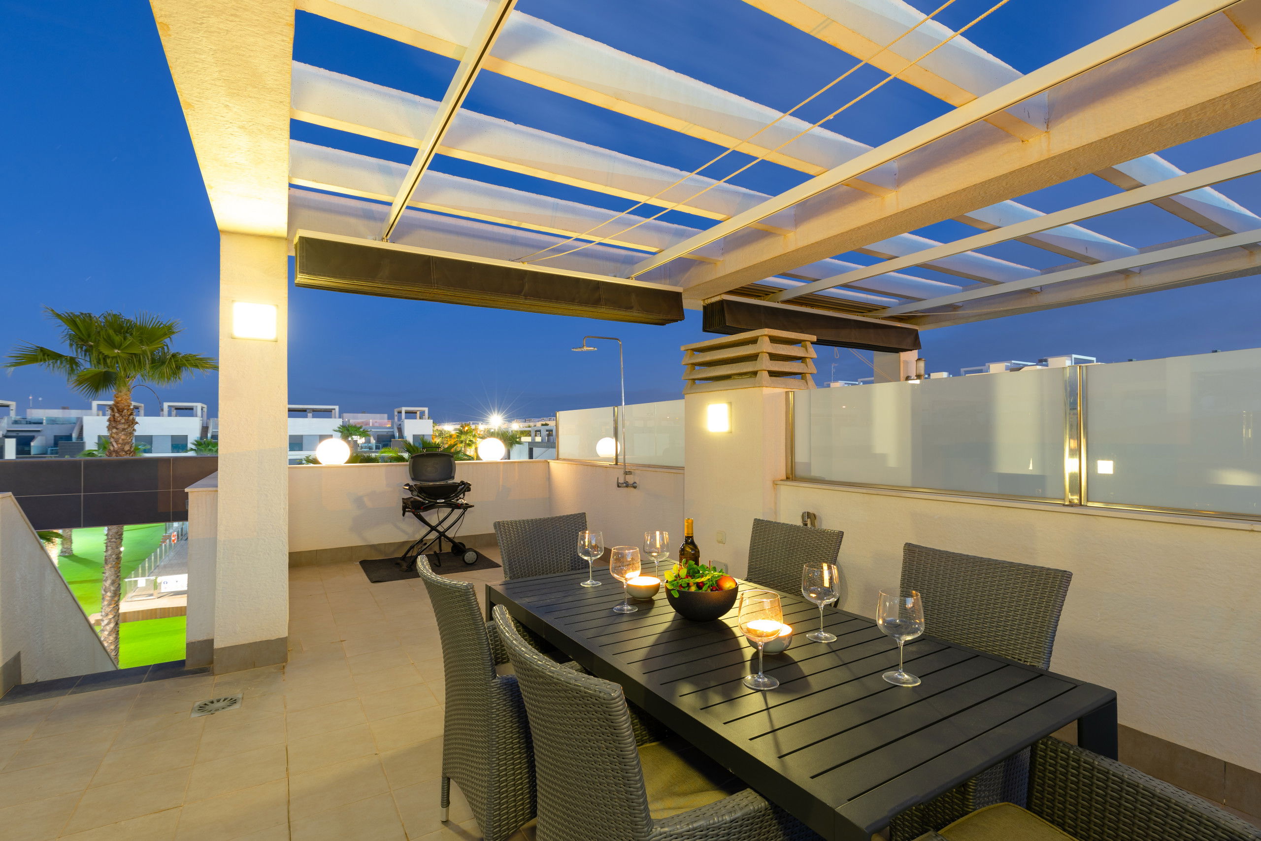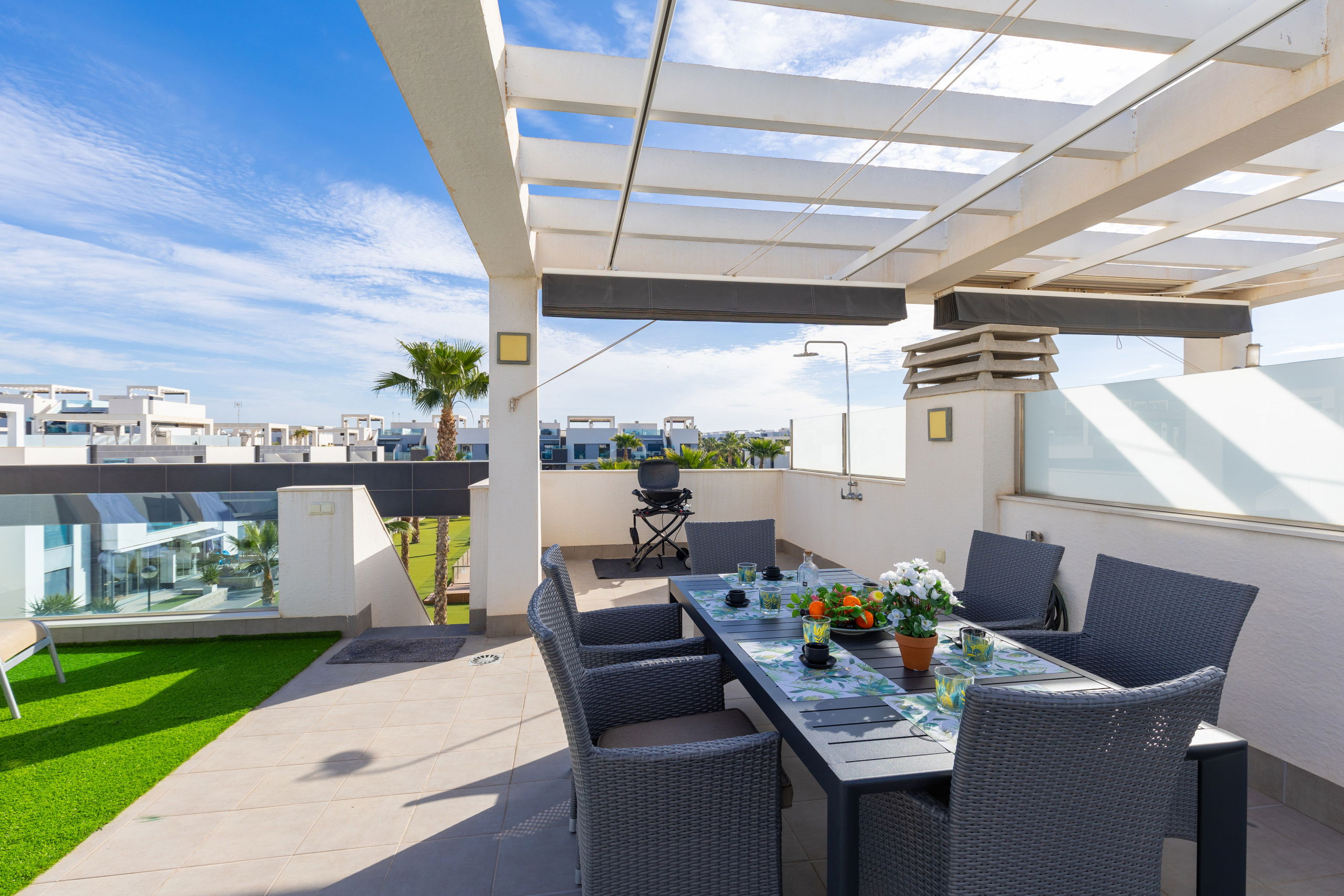 The private terrace also features a barbecue, creating the perfect setting for al fresco dining. The outdoor dining area gives you the opportunity to enjoy delicious meals while breathing in the sea breeze.