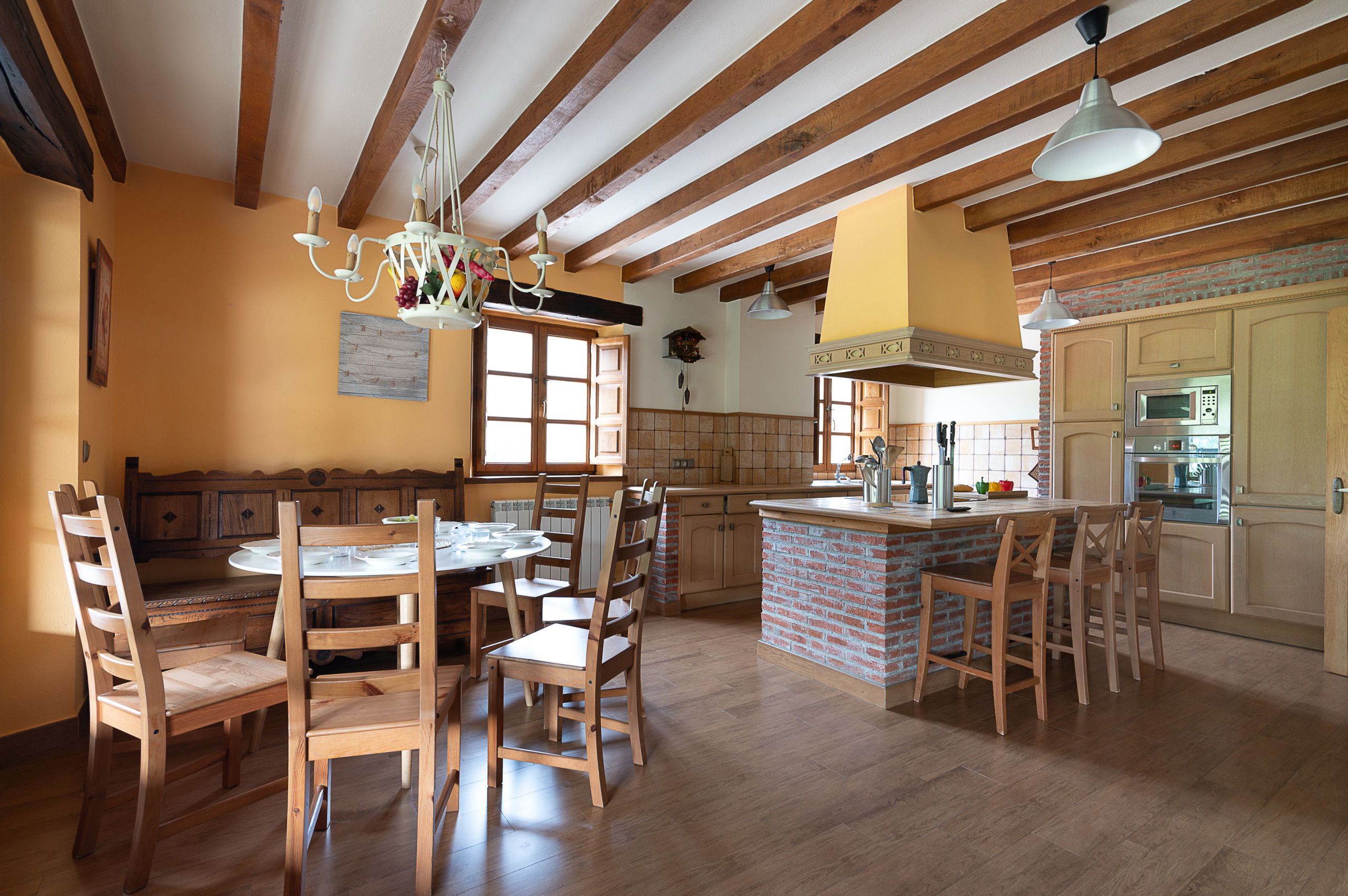 The kitchen has all the appliances (oven, microwave, induction hob, dishwasher) and a large table. It has direct access to a covered porch which also has a large table.