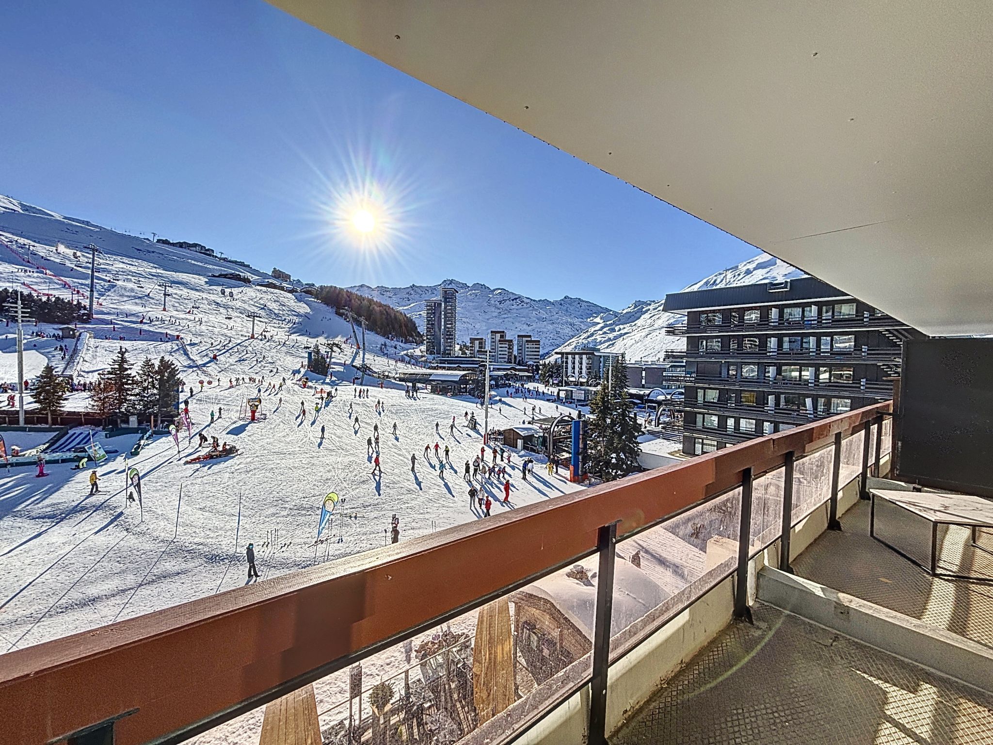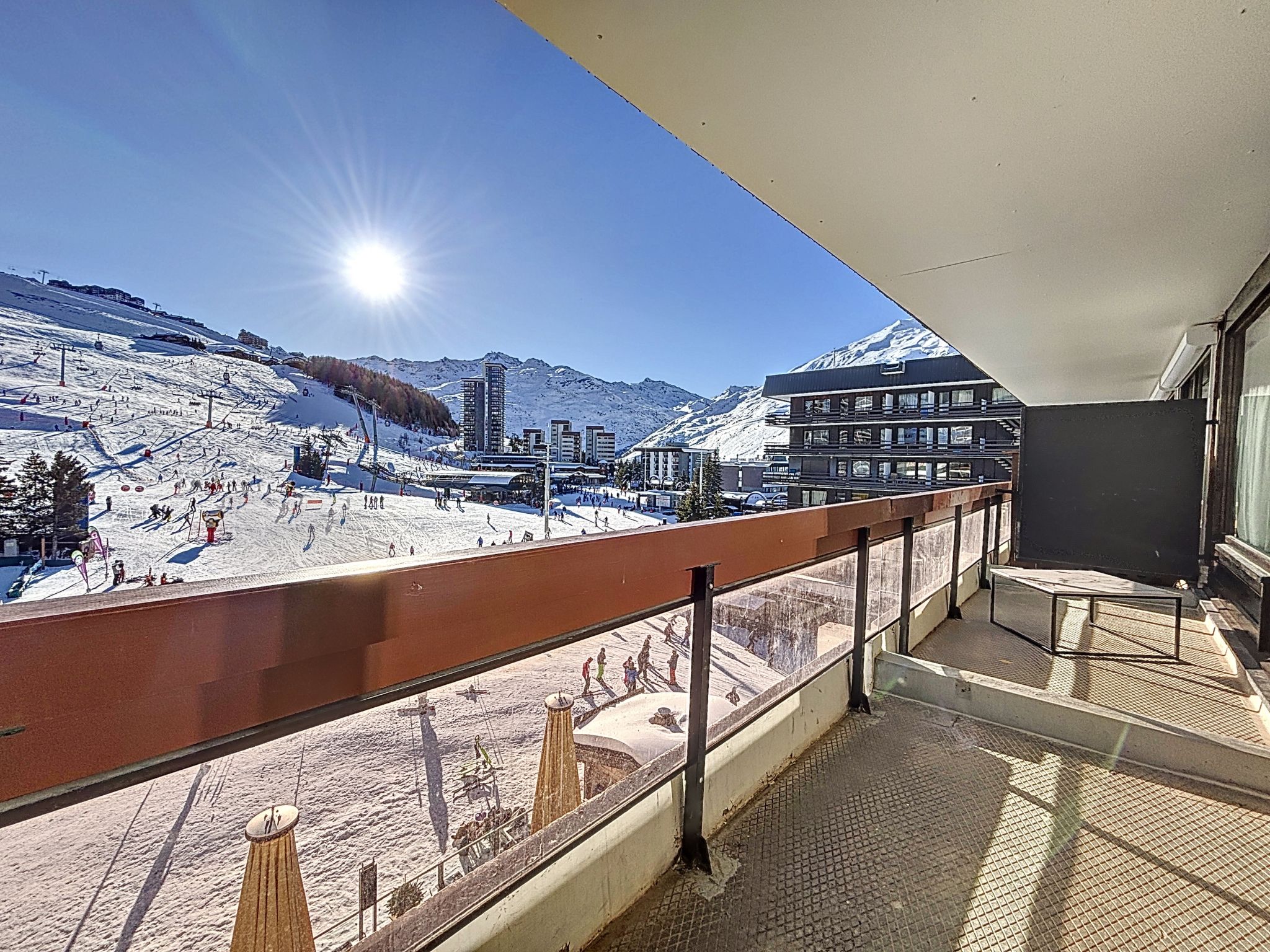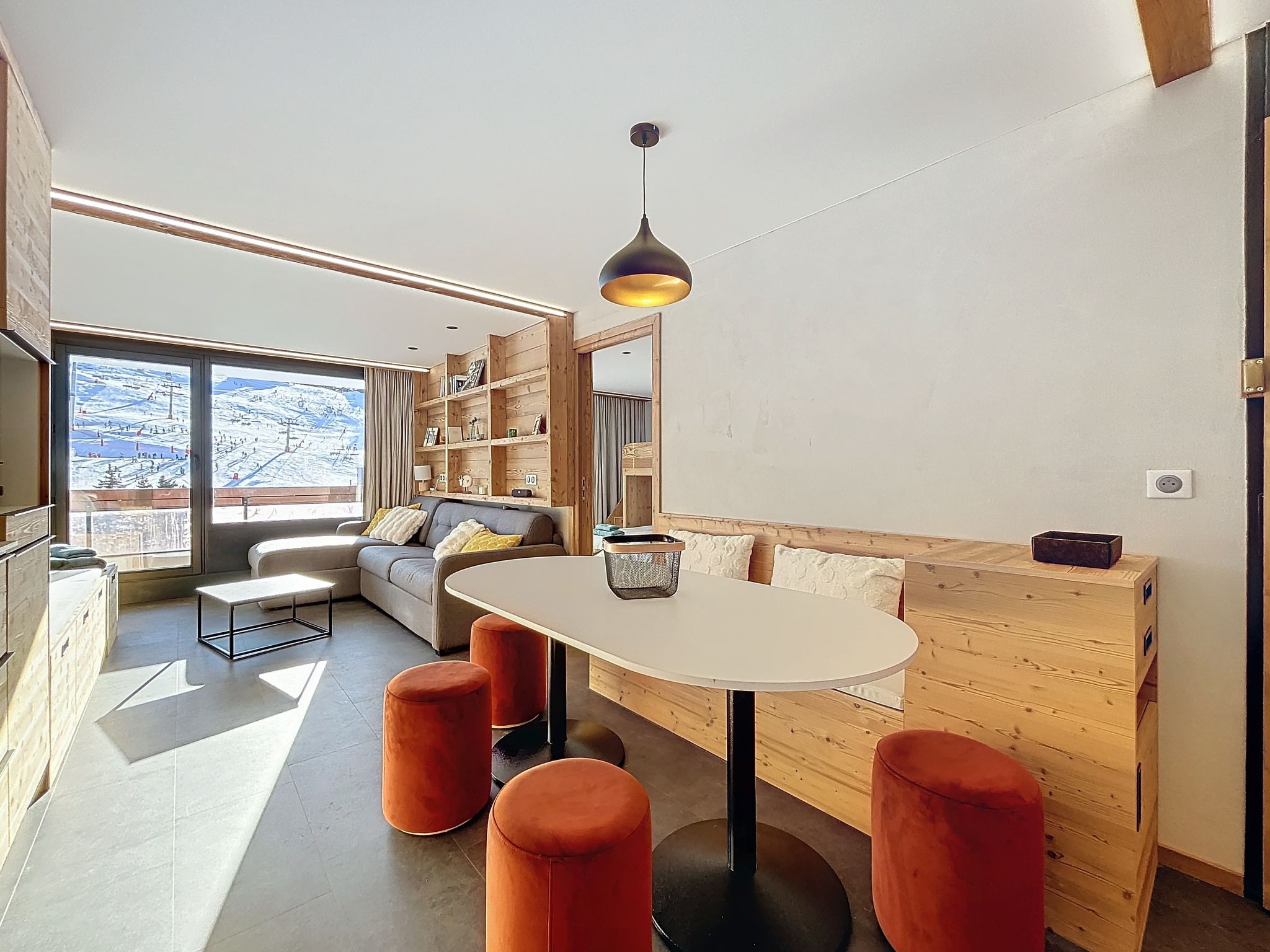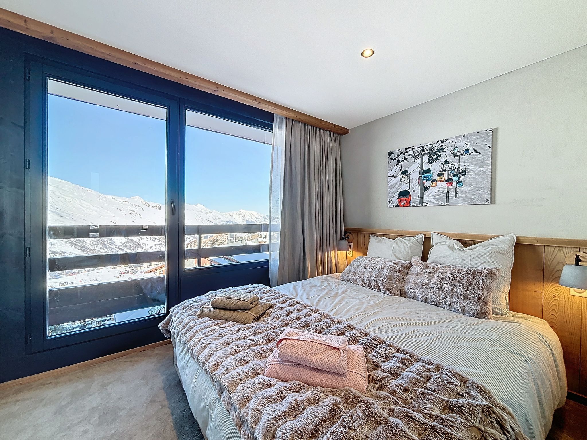"Péclet 305", 3-room apartment 56 m2 on 3rd floor, south facing position. Fully renovated in 2024, very beautiful and modern furnishings: living/dining room with 1 double sofabed (160 cm, length 190 cm), TV (flat screen). Exit to the balcony, south facing position. 1 room with 1 french bed (160 cm, length 200 cm). Exit to the balcony, north facing position. 1 room with 3 beds (90 cm, length 200 cm), bath/WC. Exit to the balcony, south facing position. Kitchen (dishwasher, 4 induction hot plates, toaster, kettle, electric coffee machine, Capsules for coffee machine (Nespresso) extra, raclette grill, combination microwave). Shower, sep. WC. Electric heating. Parquet floors, carpet. Very beautiful view of the mountains and the ski run. Facilities: Internet (WiFi). Please note: non-smokers only. Smoke alarm. Offer by a commercial proprietor according to Art. 155, IV, CGI 73257005775MX