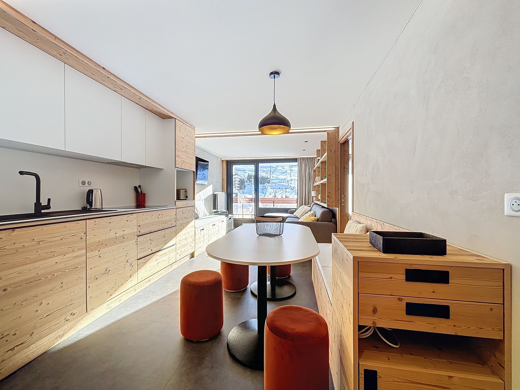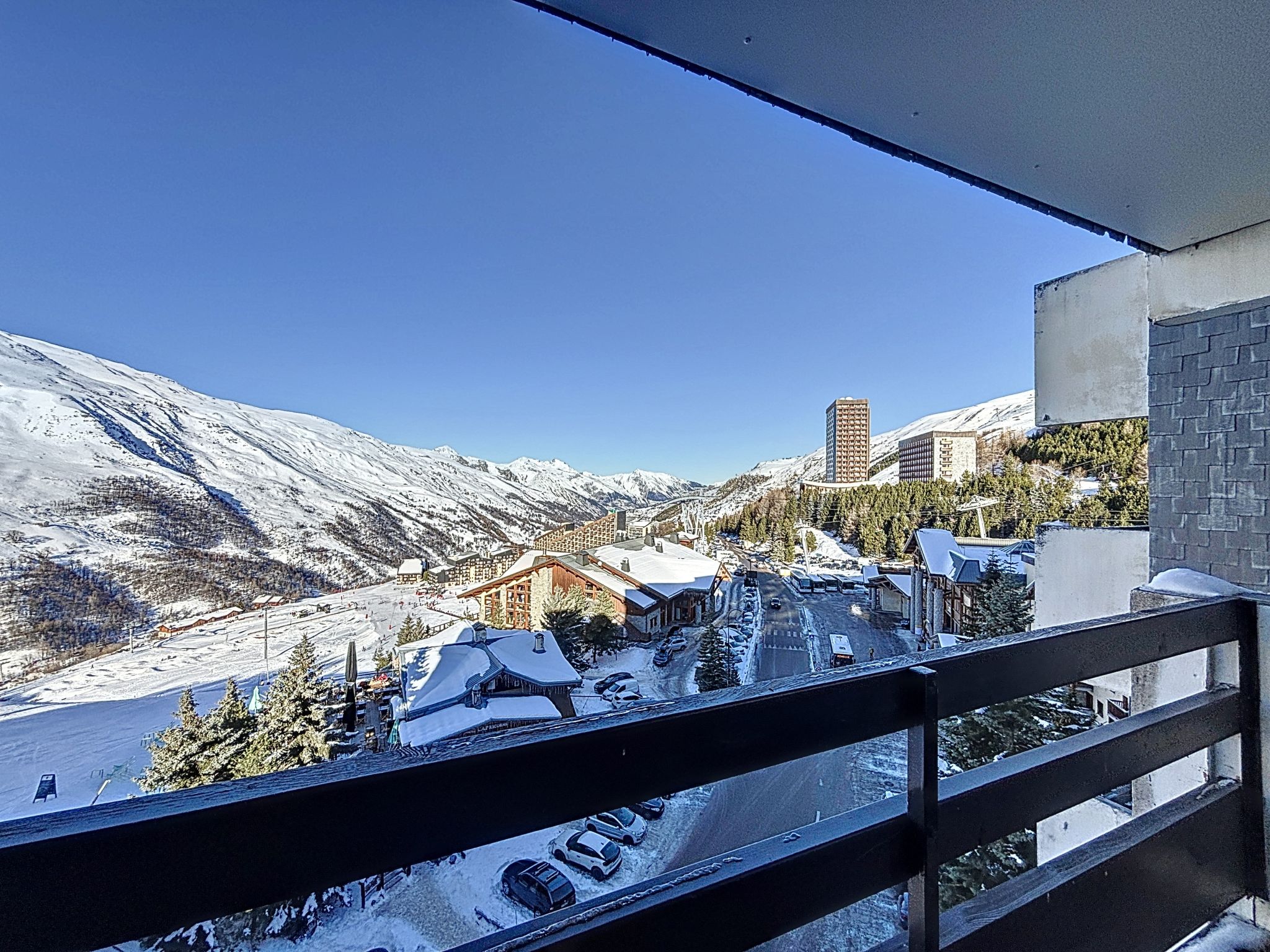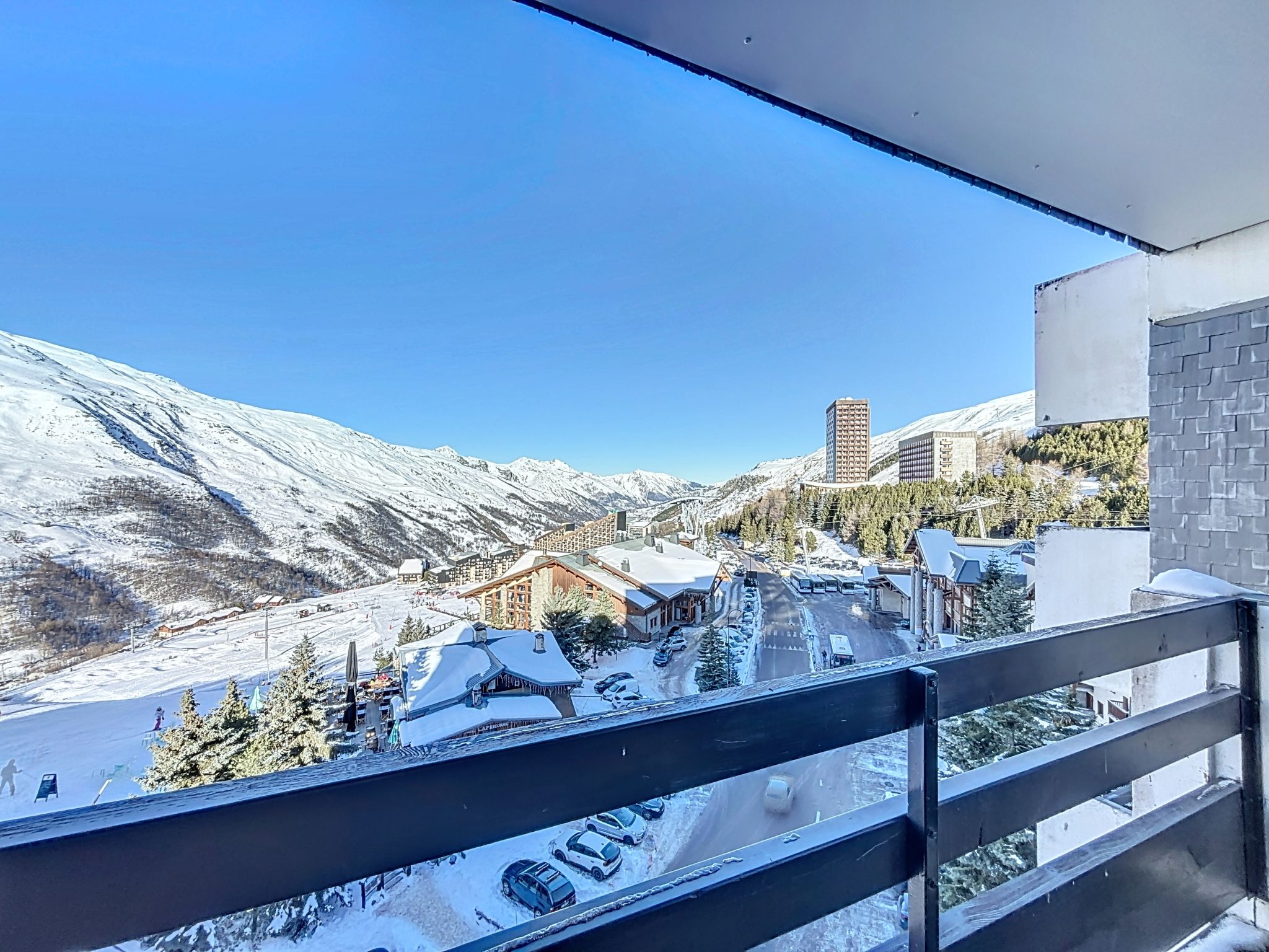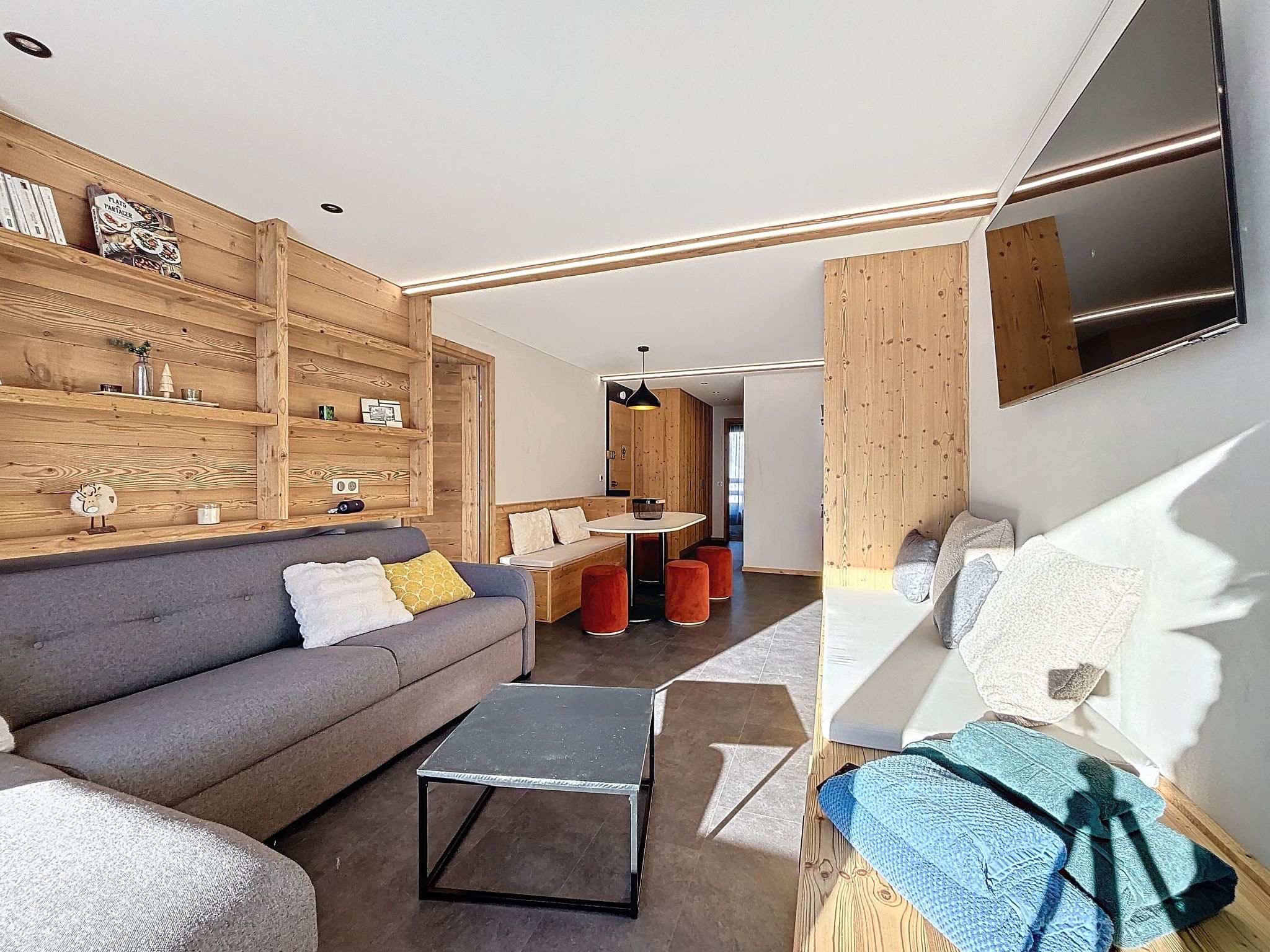 "Péclet 305", 3-room apartment 56 m2 on 3rd floor, south facing position. Fully renovated in 2024, very beautiful and modern furnishings: living/dining room with 1 double sofabed (160 cm, length 190 cm), TV (flat screen). Exit to the balcony, south facing position. 1 room with 1 french bed (160 cm, length 200 cm). Exit to the balcony, north facing position. 1 room with 3 beds (90 cm, length 200 cm), bath/WC. Exit to the balcony, south facing position. Kitchen (dishwasher, 4 induction hot plates, toaster, kettle, electric coffee machine, Capsules for coffee machine (Nespresso) extra, raclette grill, combination microwave). Shower, sep. WC. Electric heating. Parquet floors, carpet. Very beautiful view of the mountains and the ski run. Facilities: Internet (WiFi). Please note: non-smokers only. Smoke alarm. Offer by a commercial proprietor according to Art. 155, IV, CGI 73257005775MX