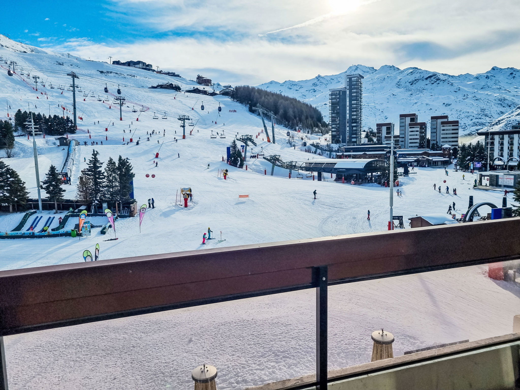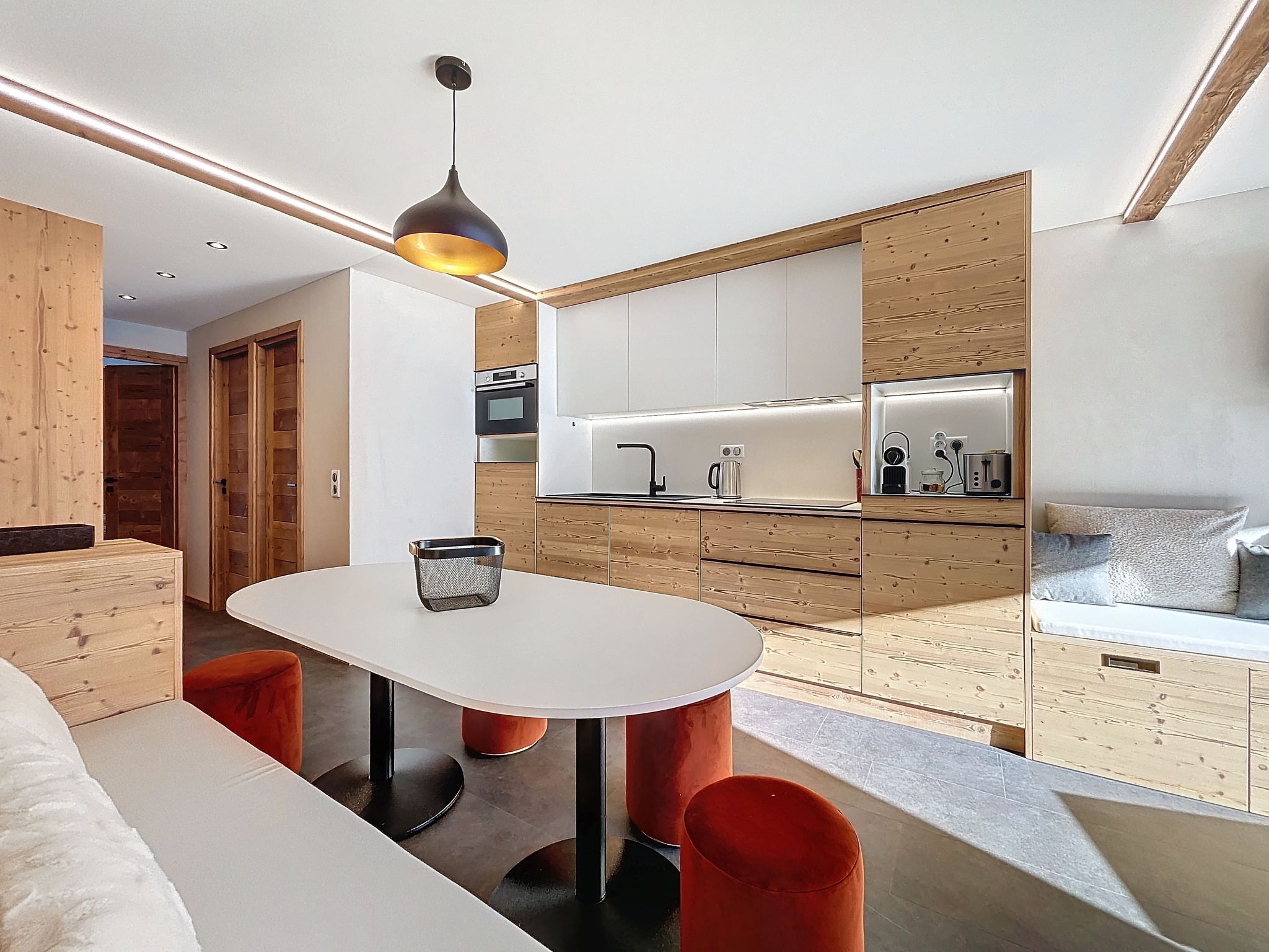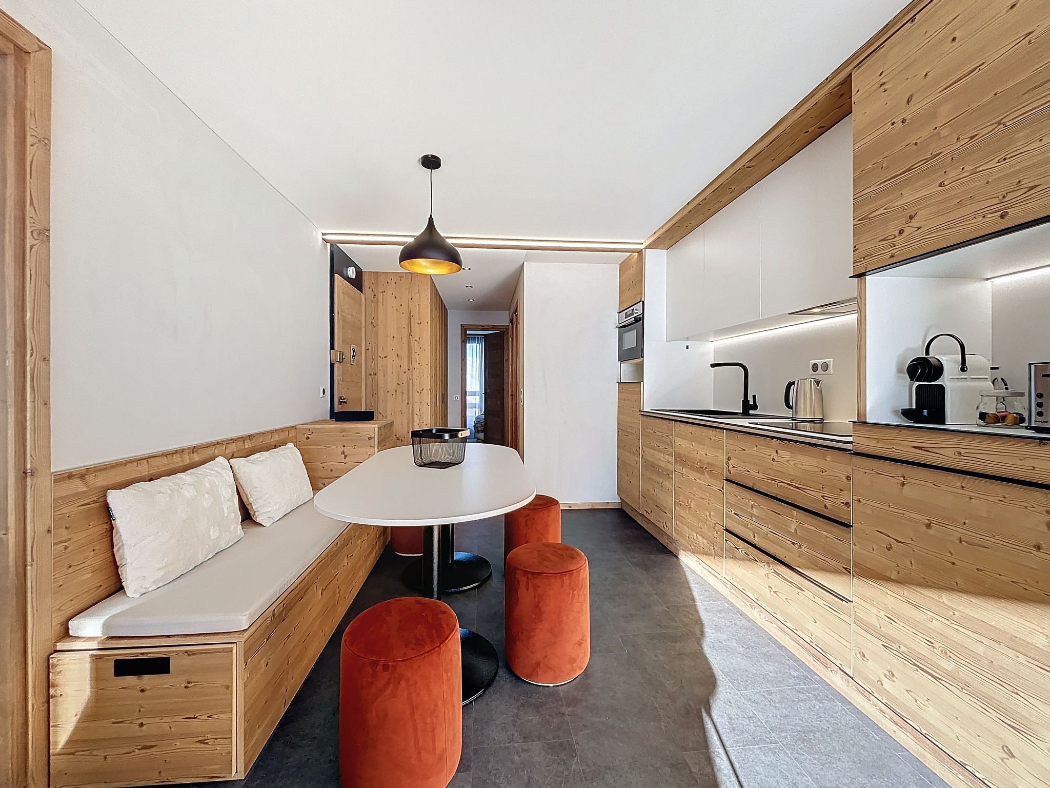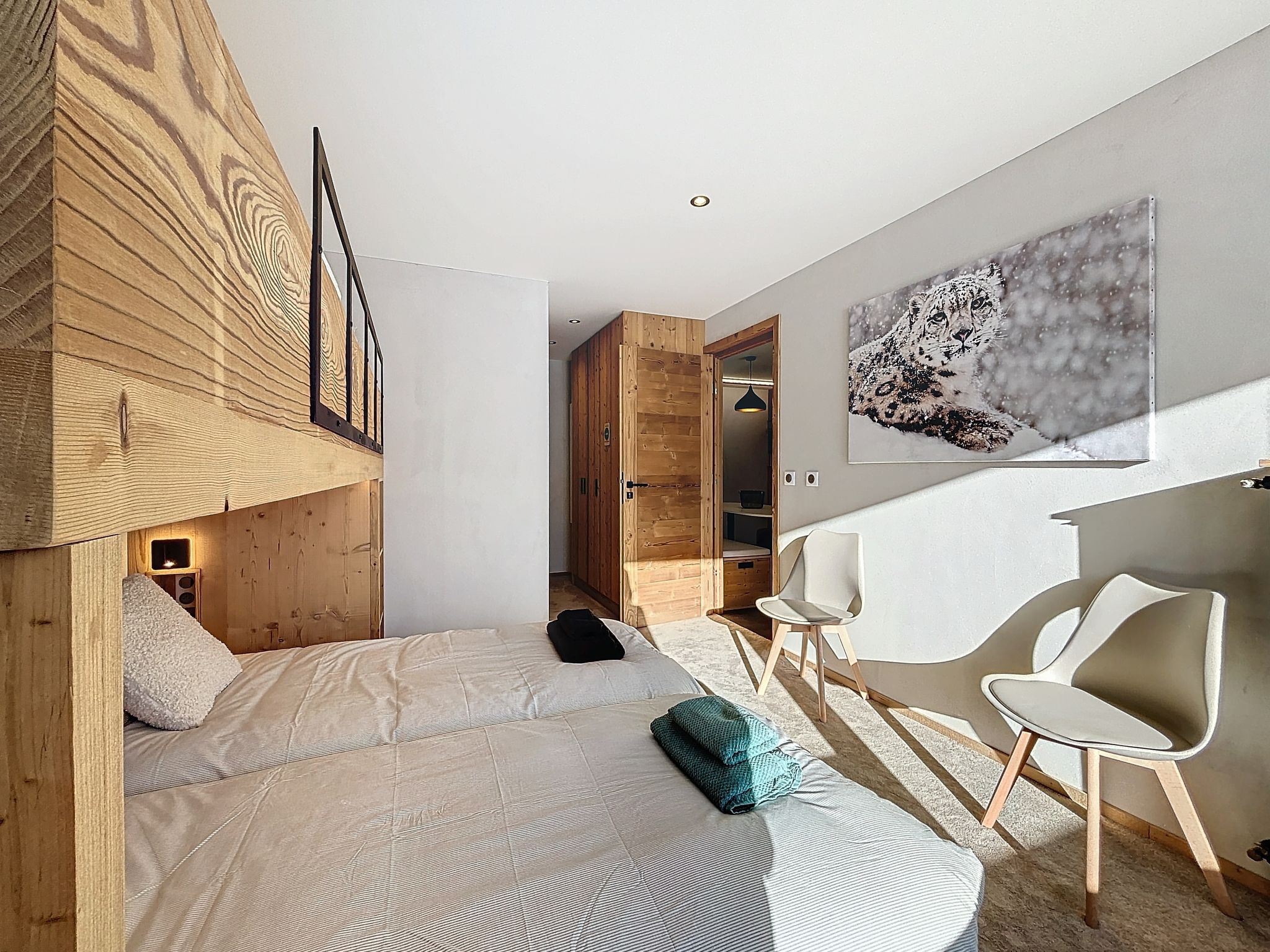 "Péclet 305", 3-room apartment 56 m2 on 3rd floor, south facing position. Fully renovated in 2024, very beautiful and modern furnishings: living/dining room with 1 double sofabed (160 cm, length 190 cm), TV (flat screen). Exit to the balcony, south facing position. 1 room with 1 french bed (160 cm, length 200 cm). Exit to the balcony, north facing position. 1 room with 3 beds (90 cm, length 200 cm), bath/WC. Exit to the balcony, south facing position. Kitchen (dishwasher, 4 induction hot plates, toaster, kettle, electric coffee machine, Capsules for coffee machine (Nespresso) extra, raclette grill, combination microwave). Shower, sep. WC. Electric heating. Parquet floors, carpet. Very beautiful view of the mountains and the ski run. Facilities: Internet (WiFi). Please note: non-smokers only. Smoke alarm. Offer by a commercial proprietor according to Art. 155, IV, CGI 73257005775MX