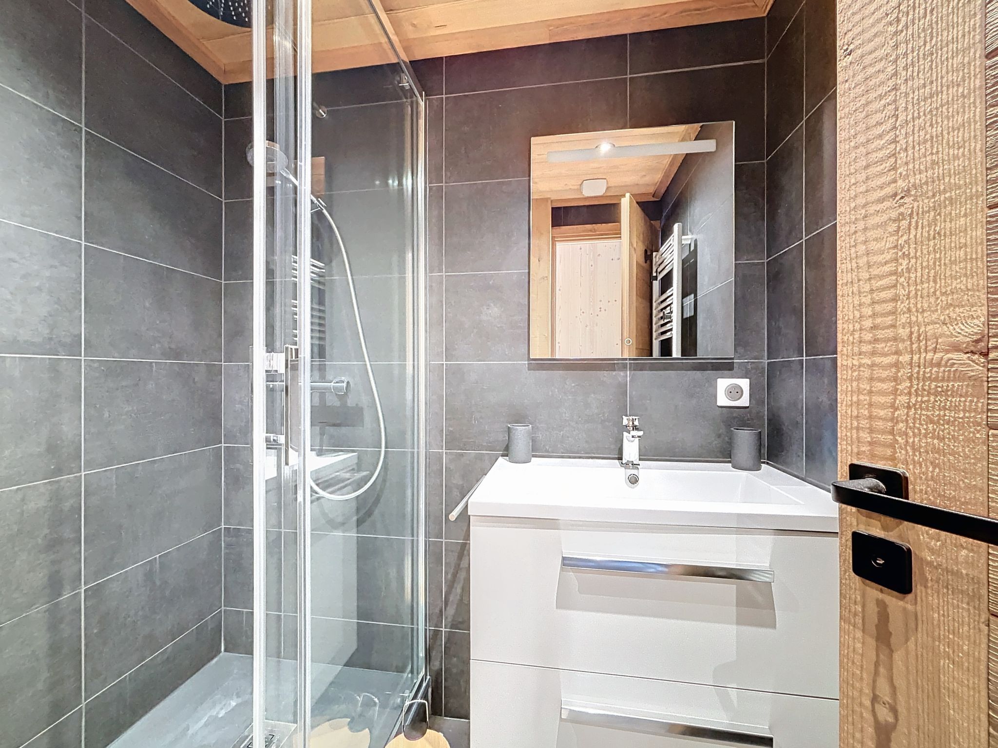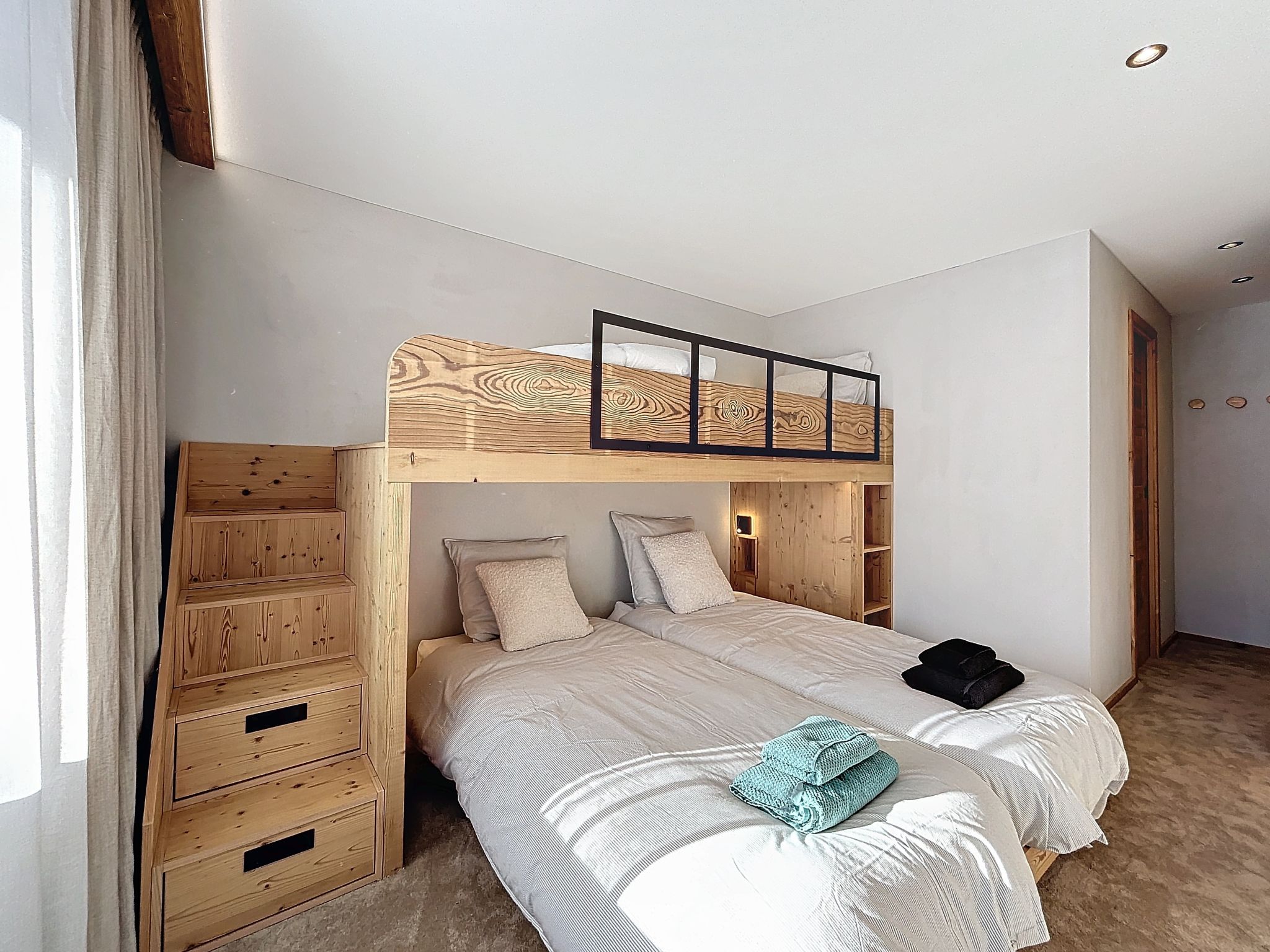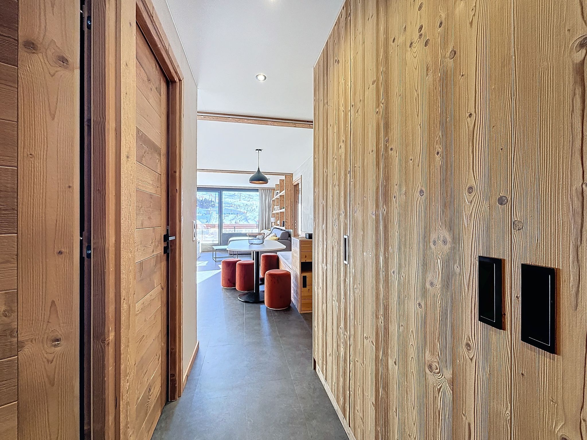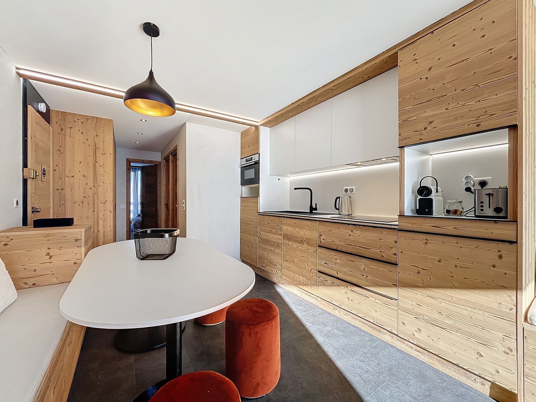 "Péclet 305", 3-room apartment 56 m2 on 3rd floor, south facing position. Fully renovated in 2024, very beautiful and modern furnishings: living/dining room with 1 double sofabed (160 cm, length 190 cm), TV (flat screen). Exit to the balcony, south facing position. 1 room with 1 french bed (160 cm, length 200 cm). Exit to the balcony, north facing position. 1 room with 3 beds (90 cm, length 200 cm), bath/WC. Exit to the balcony, south facing position. Kitchen (dishwasher, 4 induction hot plates, toaster, kettle, electric coffee machine, Capsules for coffee machine (Nespresso) extra, raclette grill, combination microwave). Shower, sep. WC. Electric heating. Parquet floors, carpet. Very beautiful view of the mountains and the ski run. Facilities: Internet (WiFi). Please note: non-smokers only. Smoke alarm. Offer by a commercial proprietor according to Art. 155, IV, CGI 73257005775MX