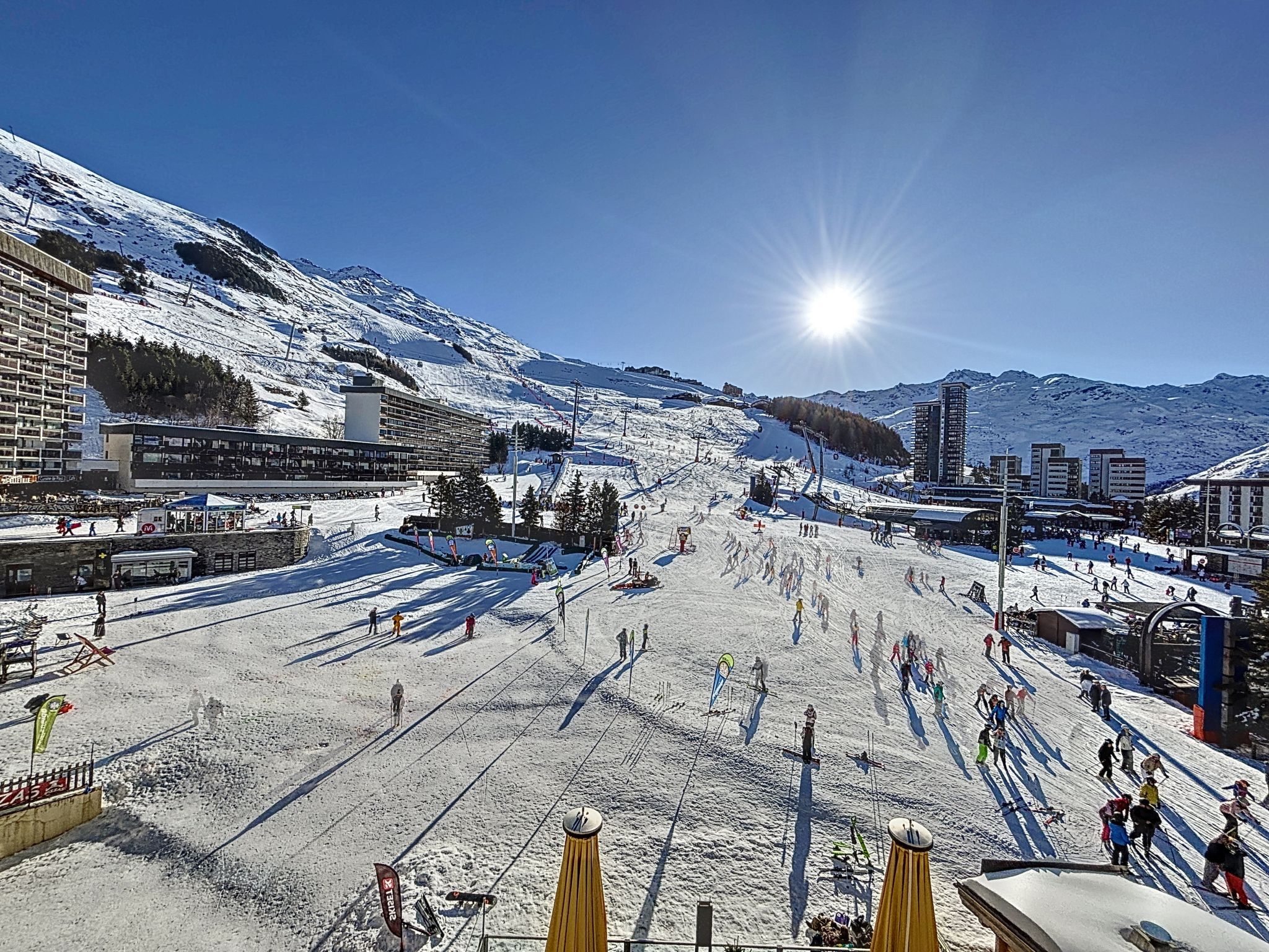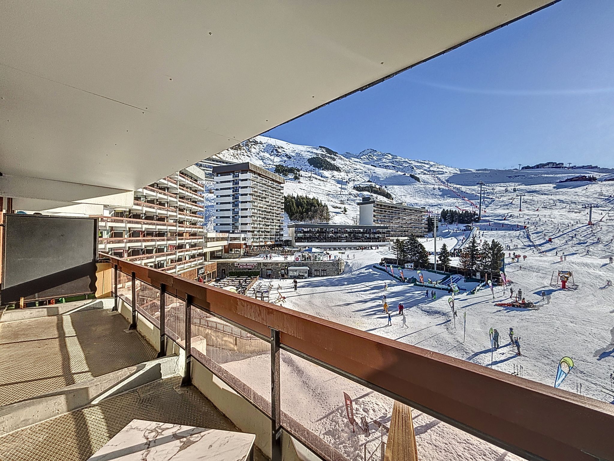 Small residence "Péclet La Croisette", 4 storeys. In the centre of La Croisette, in a central, busy position, directly by the skiing area. In the complex: lift, storage room for skis, central heating system. Shop, supermarket, shopping centre, restaurant, bakery 10 m, bus stop "Gare routière Les Menuires" 10 m. Sports centre 30 m, skisport facilities, slopes, ski rental, ski school 10 m, ski-kindergarten 50 m. Well-known ski regions can easily be reached: 3 Vallées 10 m. The owner does not accept any groups. The owner does not accept any youth groups.