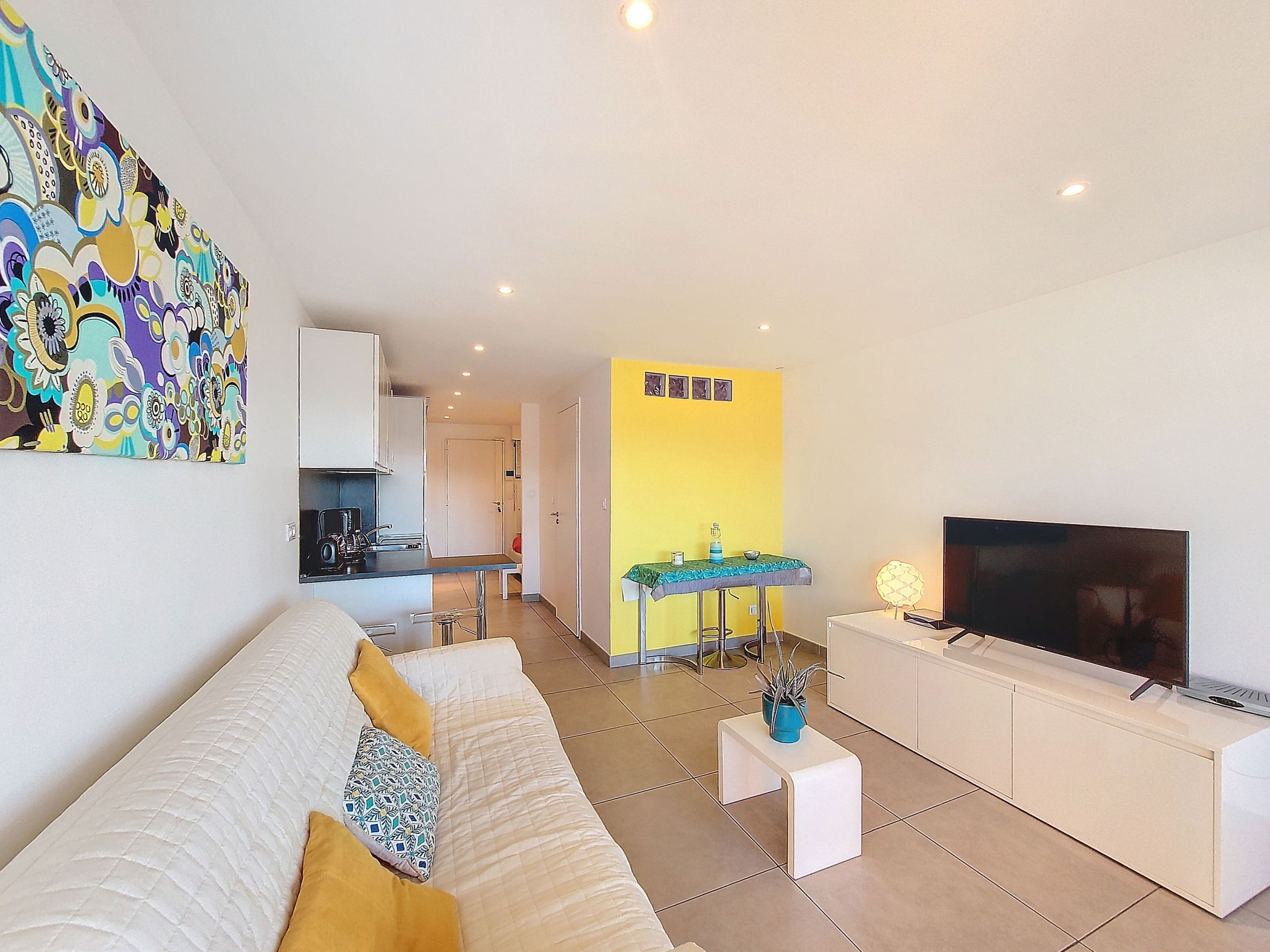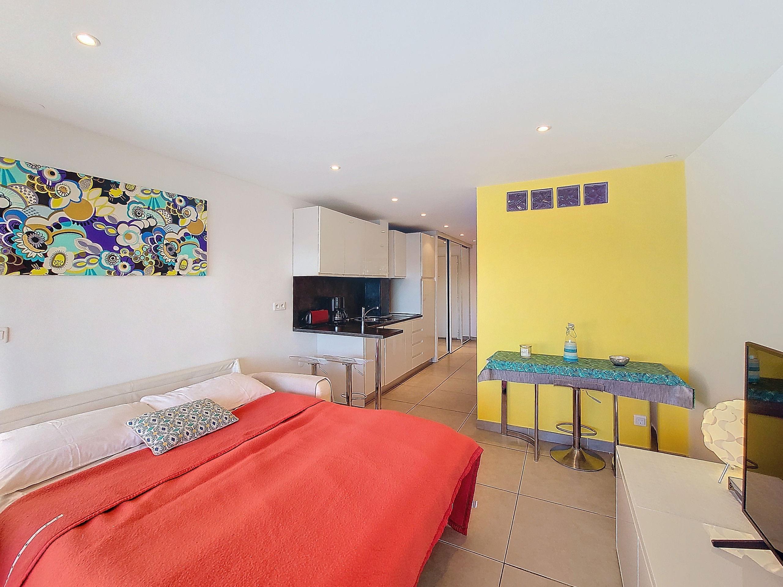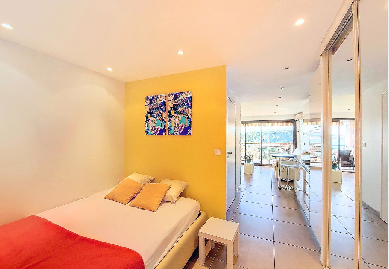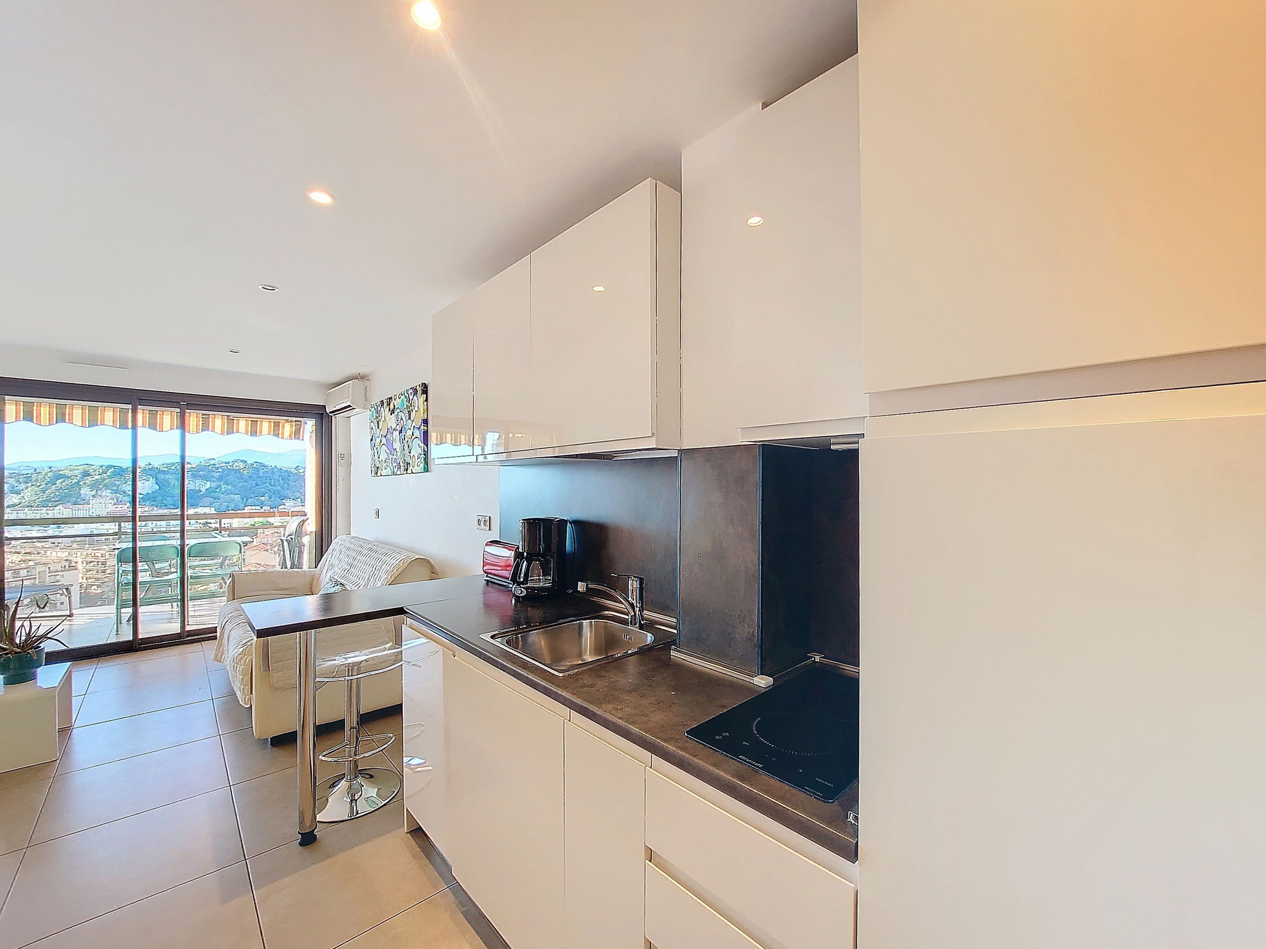 It features a lounge that opens onto the terrace with views of the sea and the colorful city of Nice. There is a functional American-style kitchen and a sleeping area with a double bed, as well as a sofa bed in the living room for one person. The apartment also includes a bathroom with a toilet.