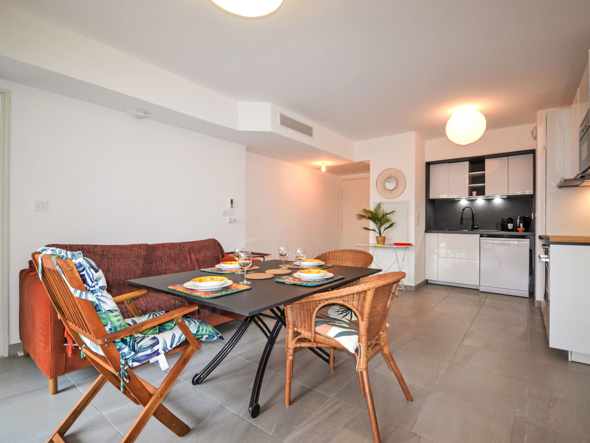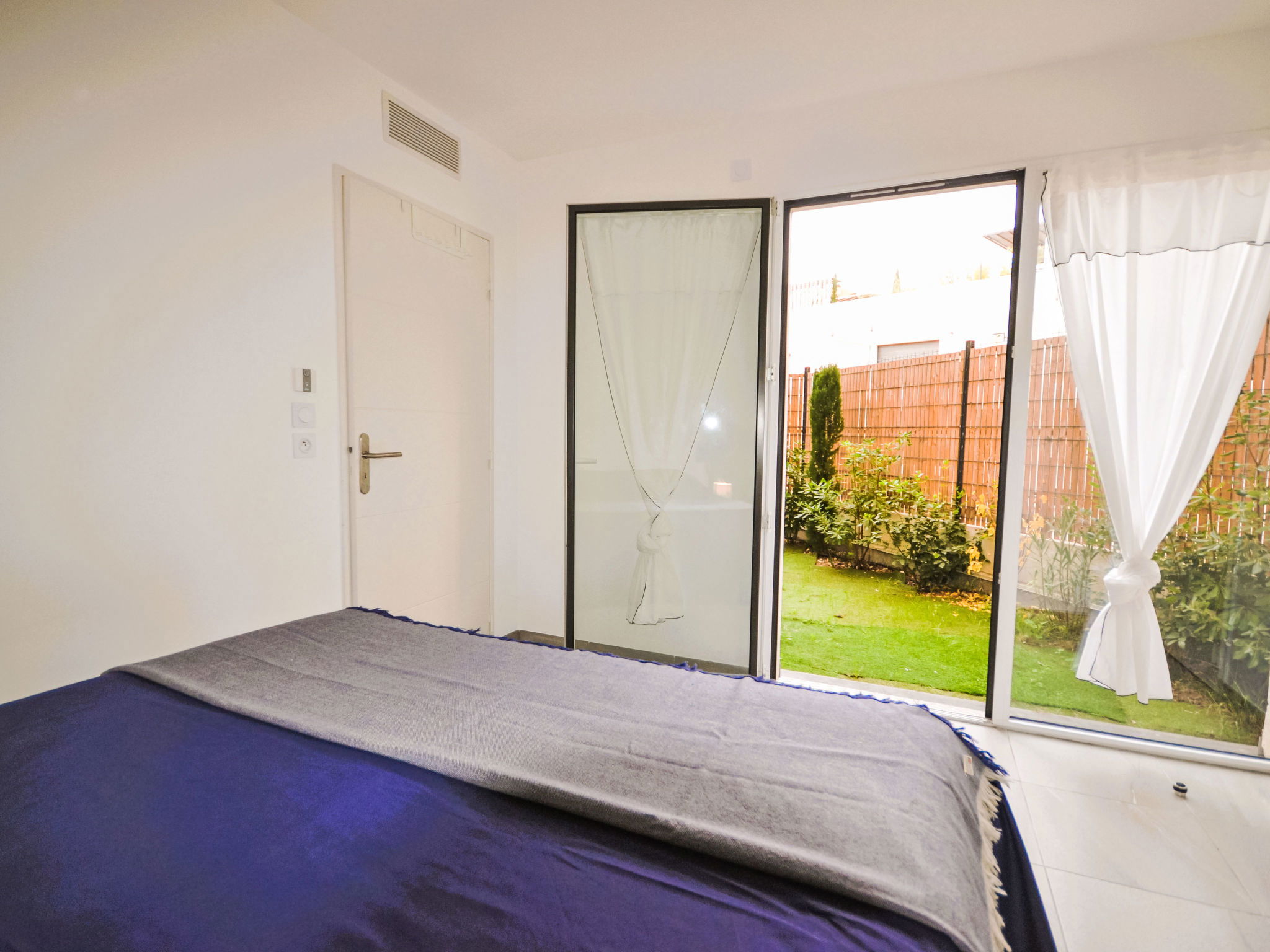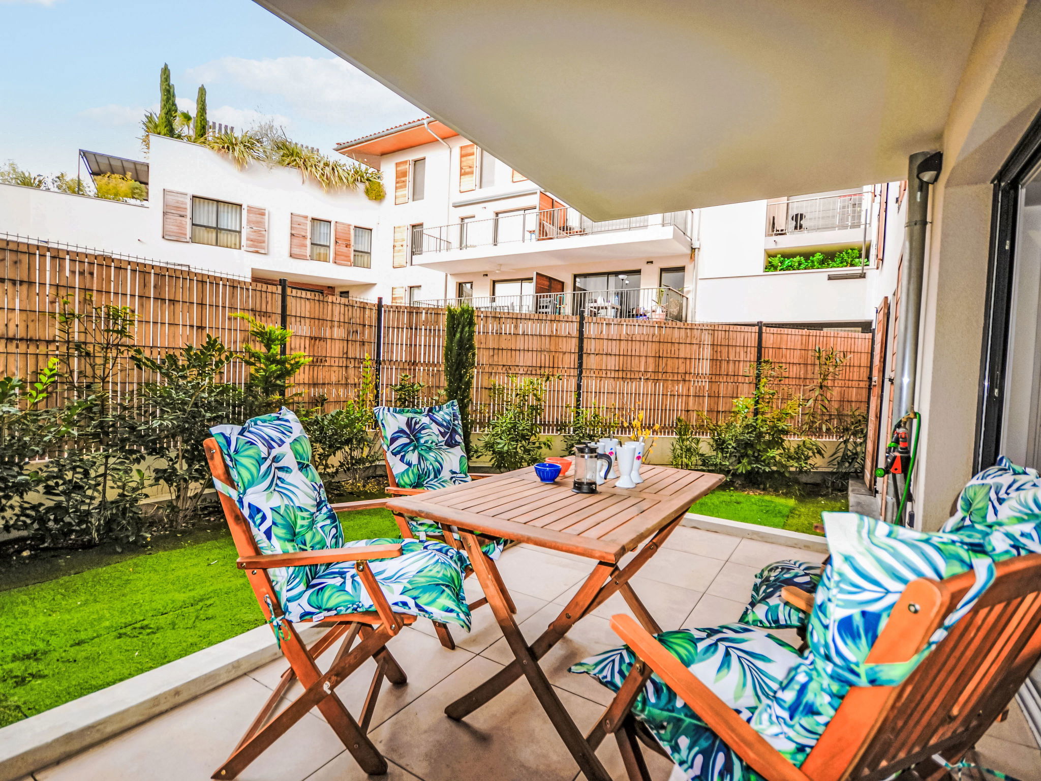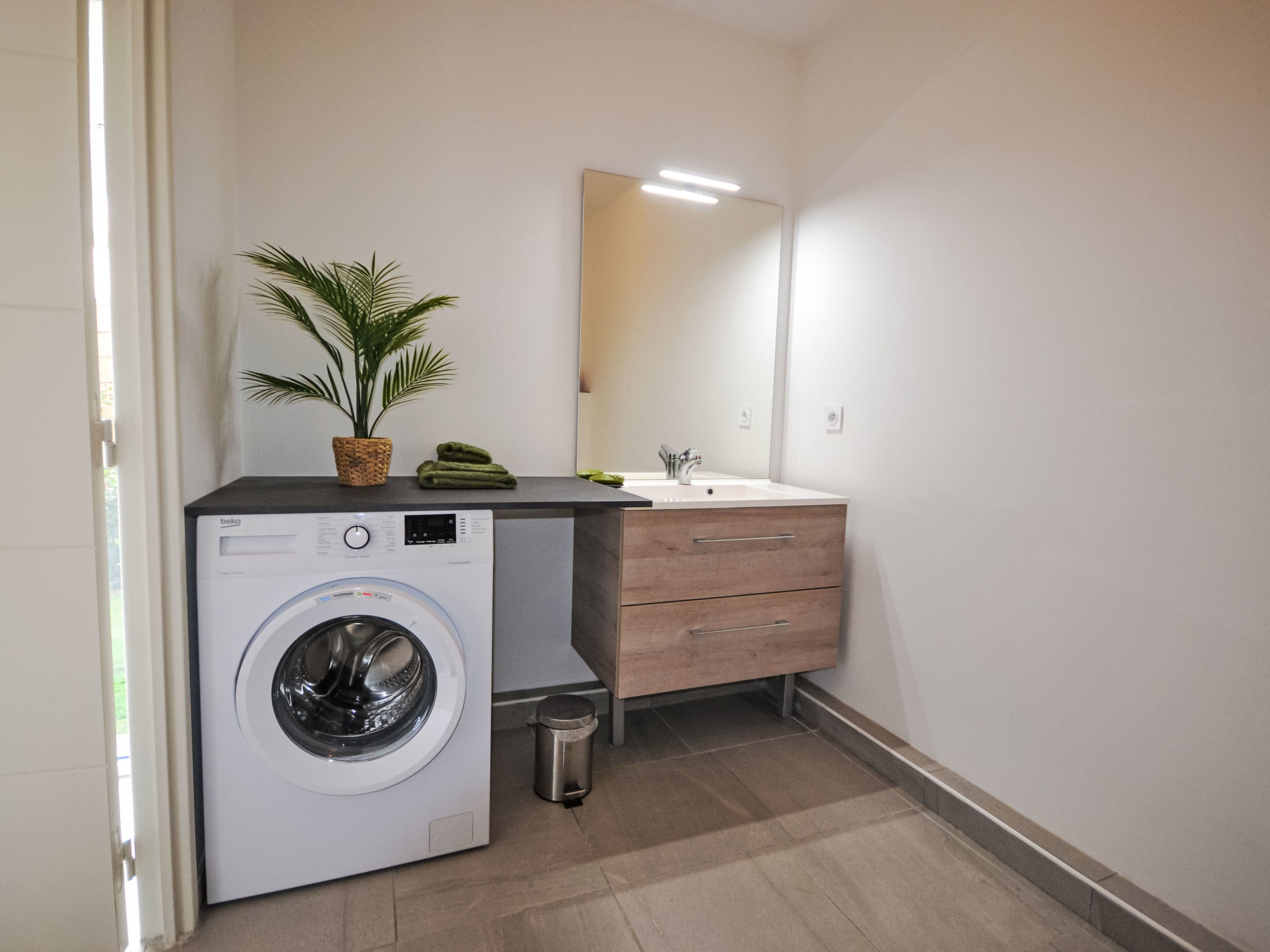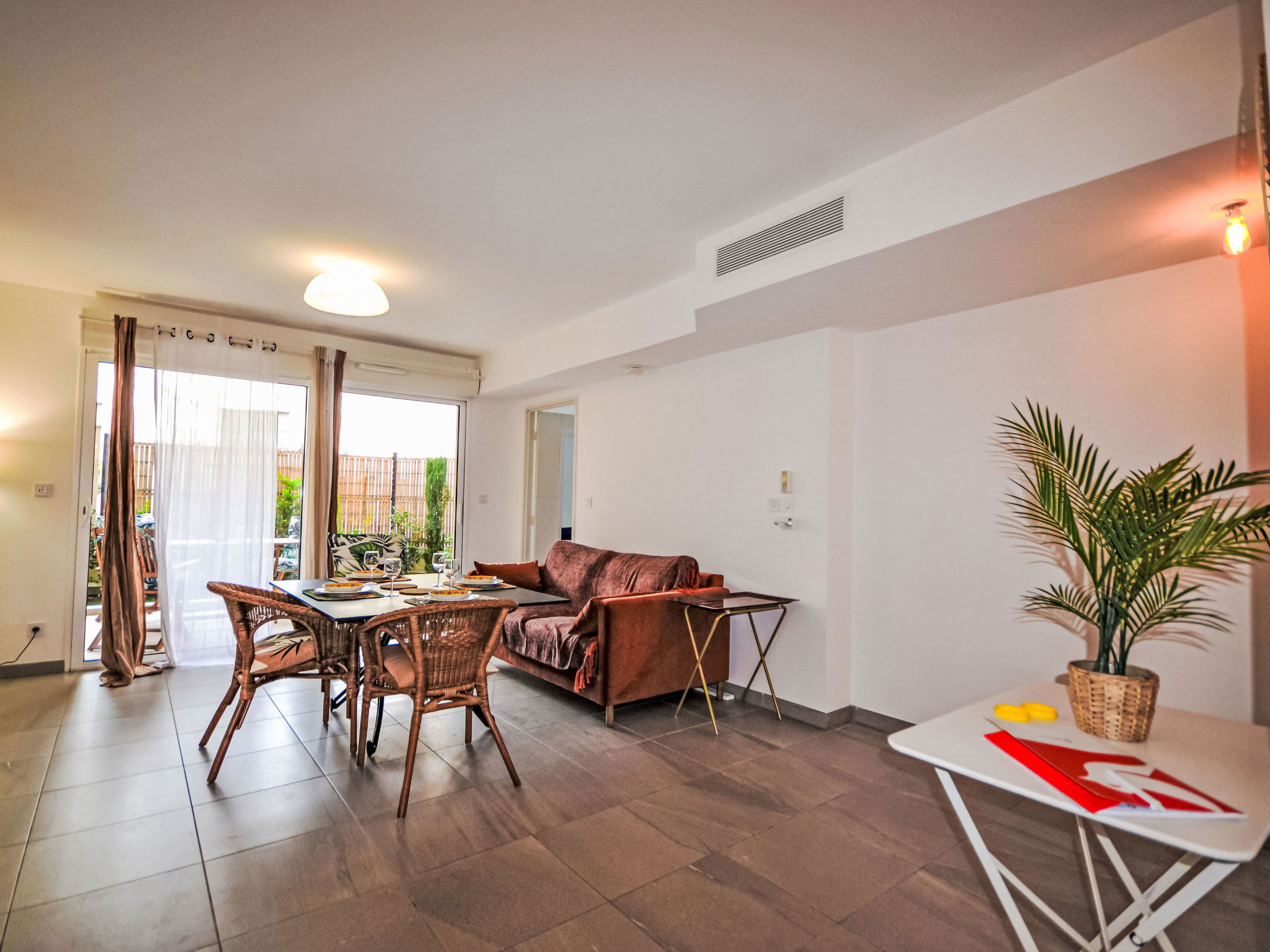 2-room apartment 43 m2, on the ground floor. Comfortable and modern furnishings: living/dining room with panoramic window with TV (flat screen). Exit to the terrace. 1 room with panoramic window with 2 beds (80 cm, length 200 cm). Exit to the terrace. Open kitchen (oven, dishwasher, 2 induction hot plates, toaster, kettle, microwave, electric coffee machine, Capsules for coffee machine (Nespresso) extra) with dining table. Shower/WC. Electric heating, forced-air heating. Terrace 9 m2, small garden 26 m2, south facing position. Terrace furniture, sitting area. View of the garden. Facilities: washing machine, iron, hair dryer. Internet (WiFi, free). Garage, width 260 cm. Please note: non-smokers only. Smoke alarm, fire extinguisher. Offer by a private individual according to Art. 155, IV of CGI. 1300100590318