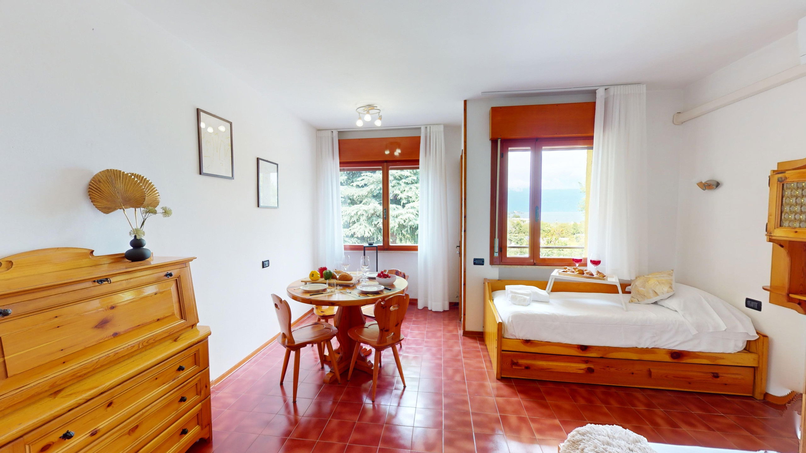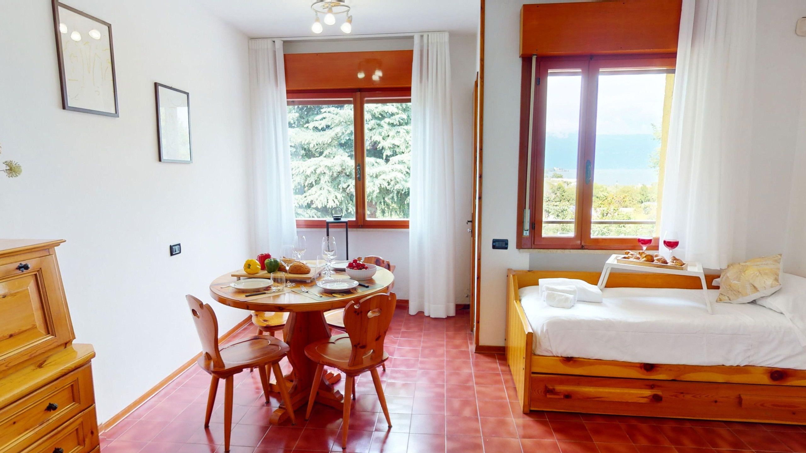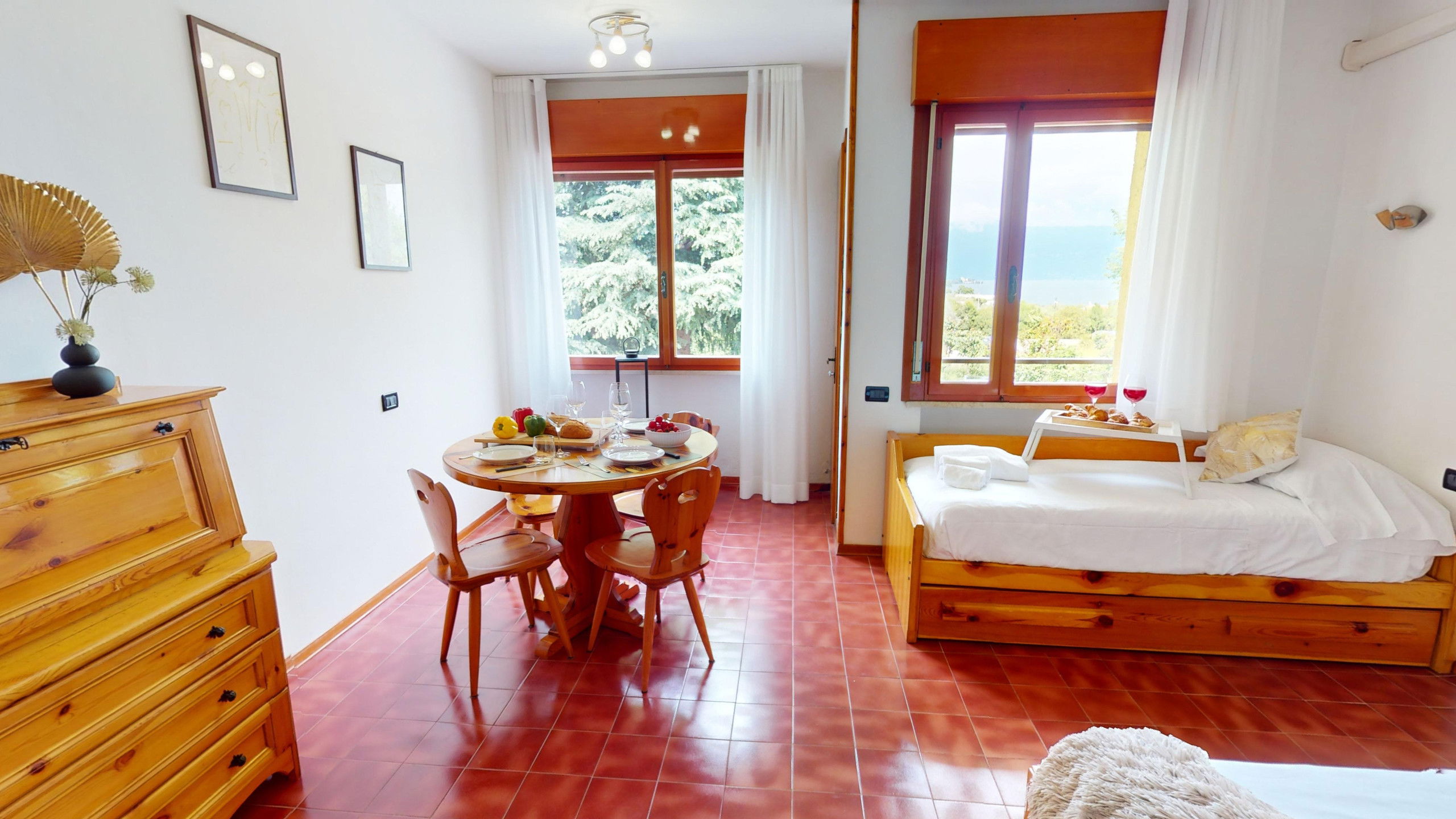 Bellavista at CRB is a charming two-room lake view apartment located in the well-known CRB residence in Manerba del Garda. The residential complex is perfect for families and couples, as it is equipped with a tennis court, a pizzeria, and two panoramic swimming pools. From these, it is also possible to access the famous restaurant Il Fungo.