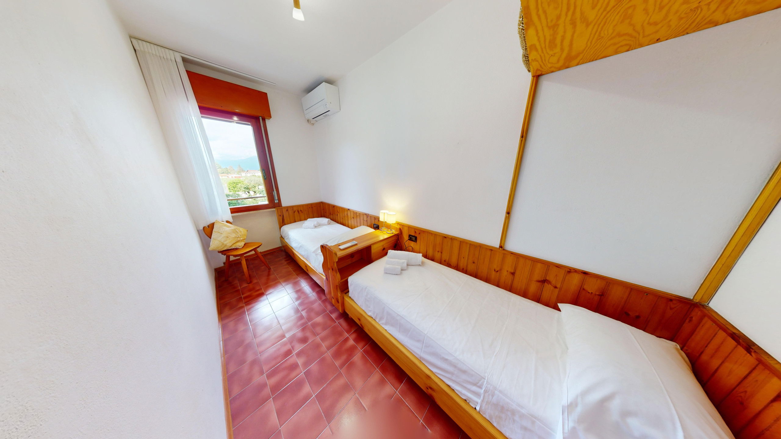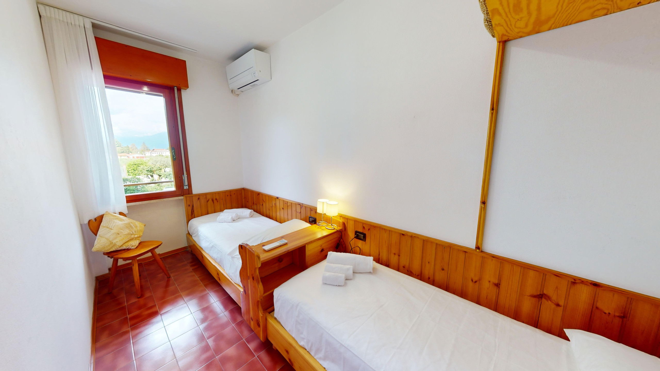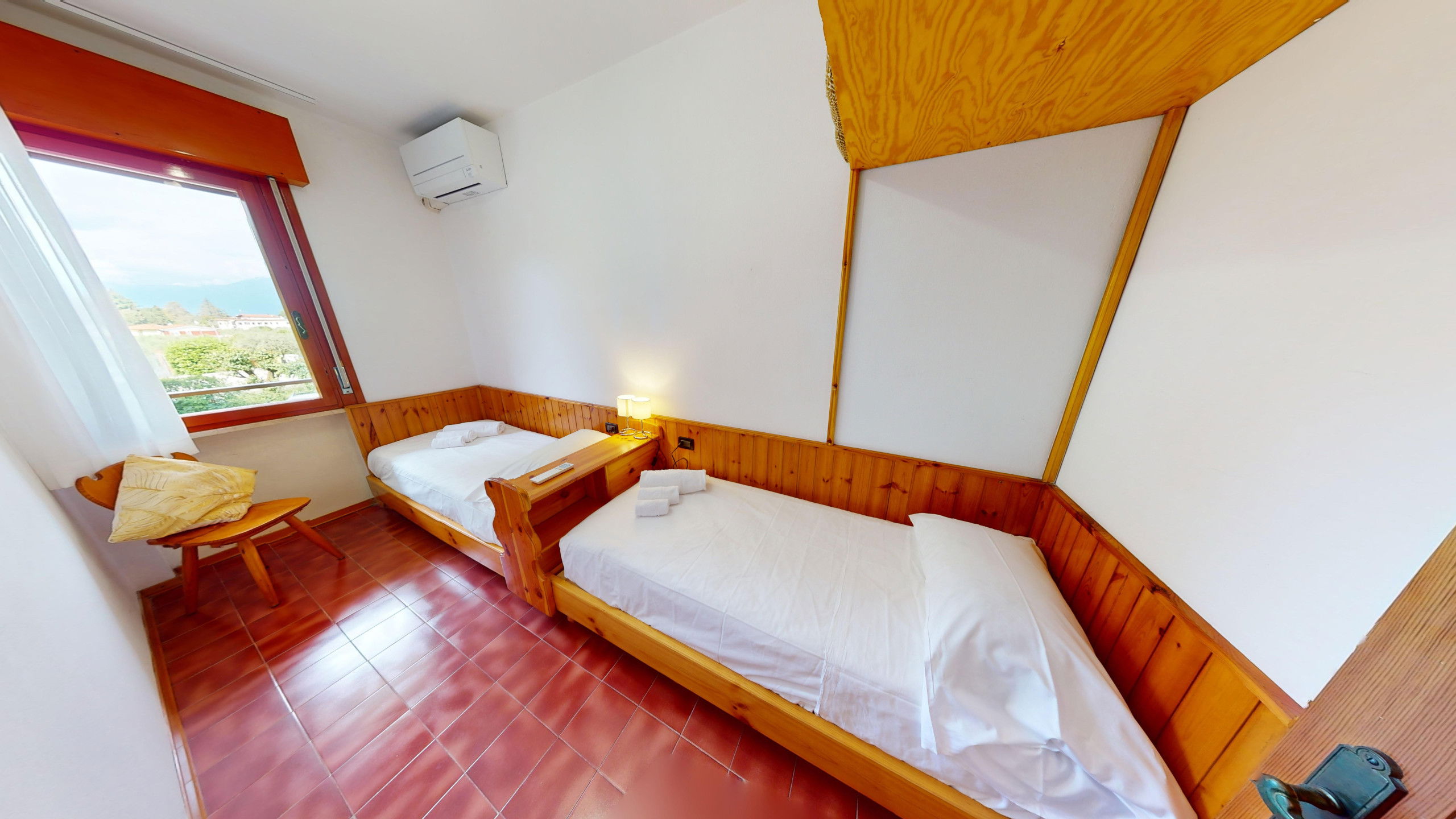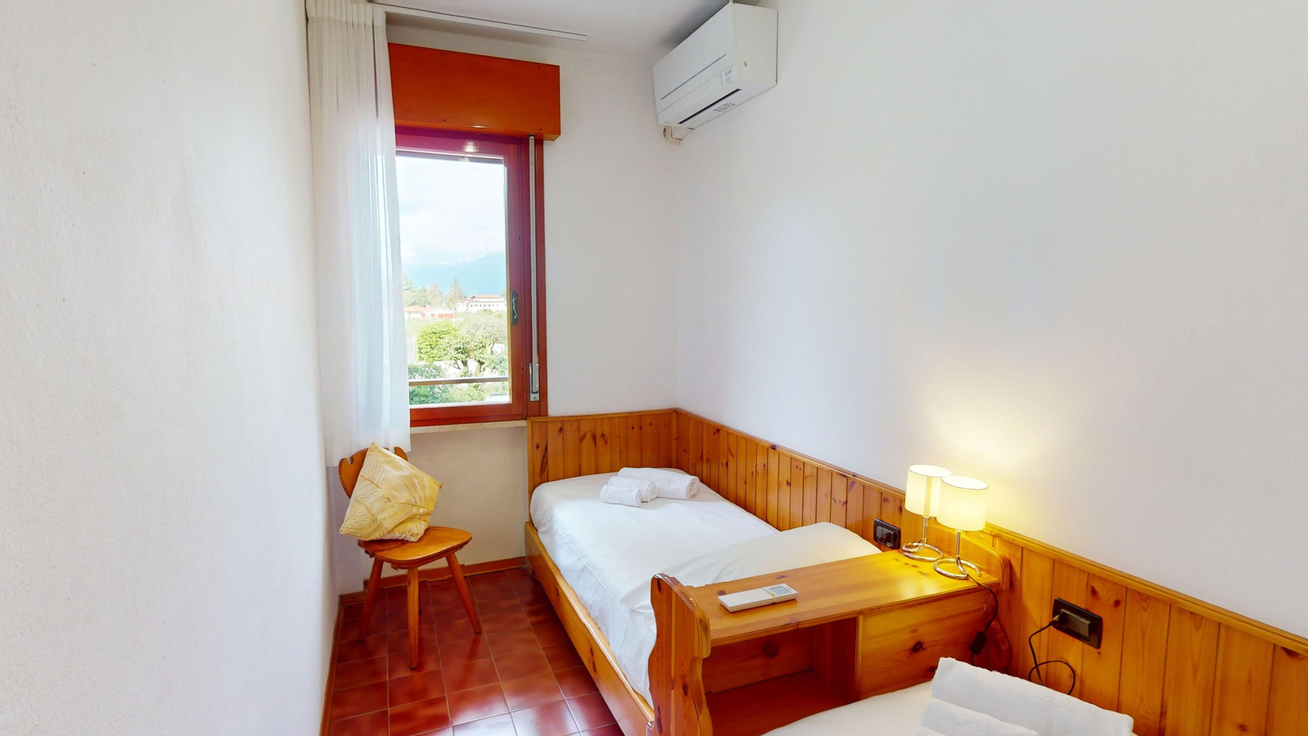 The apartment consists of a fully equipped kitchen, a living room with two single beds, a bedroom with two single beds, and a bathroom with a shower and washing machine. From the cosy living area, it is possible to access the lake-view balcony, ideal for relaxation and meals with company. The accommodation has an external parking space in the structure.