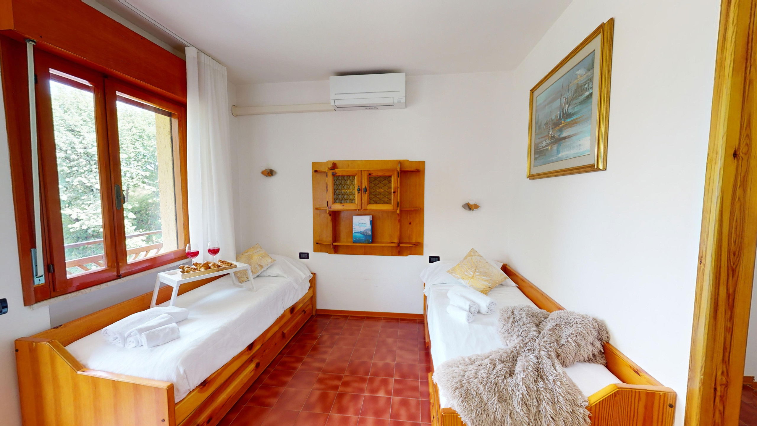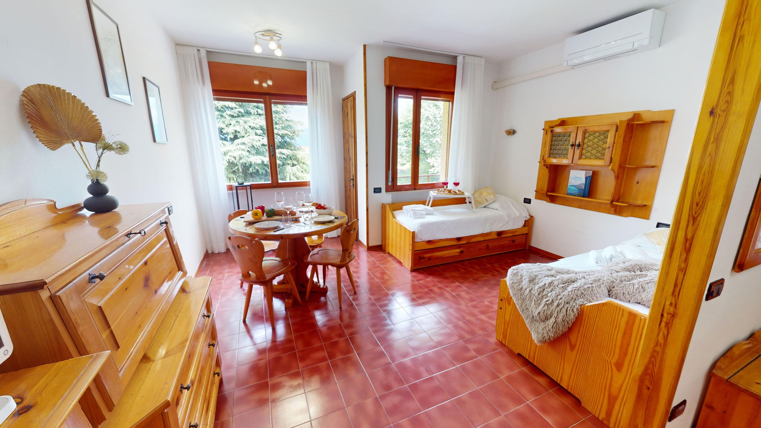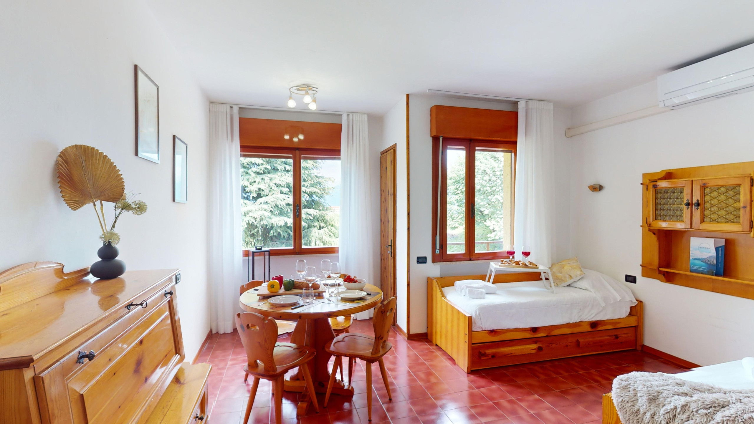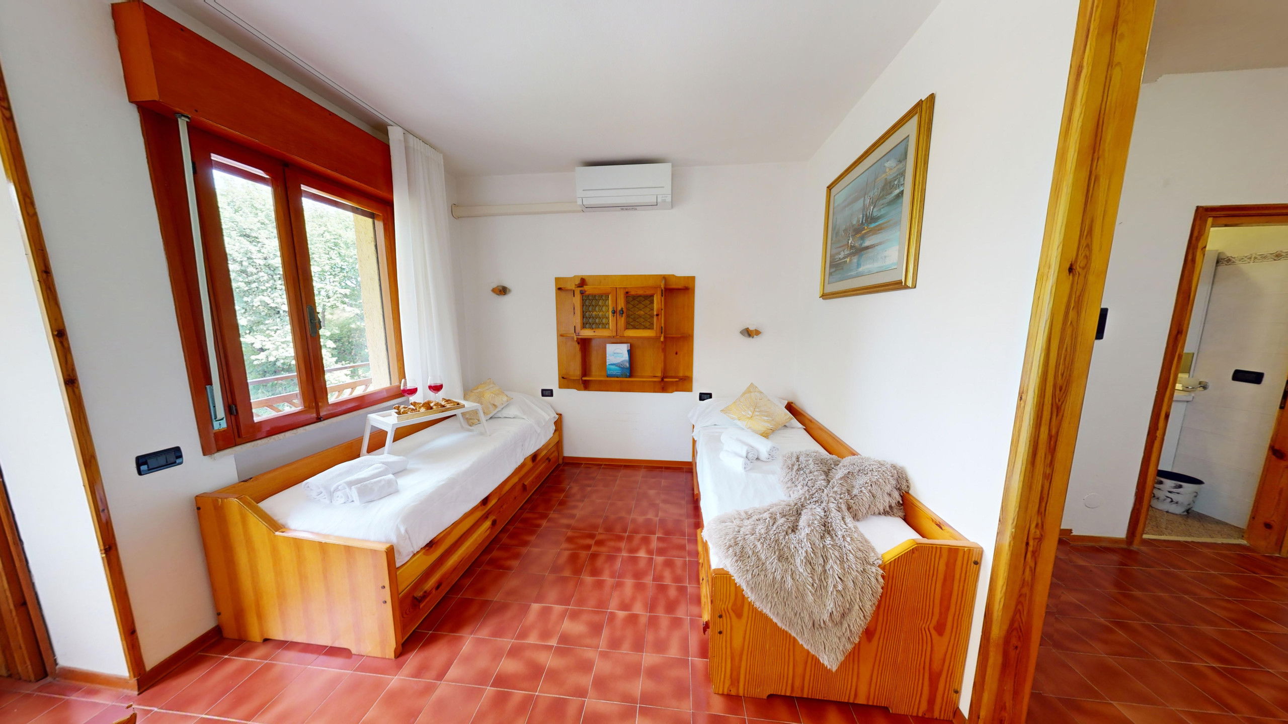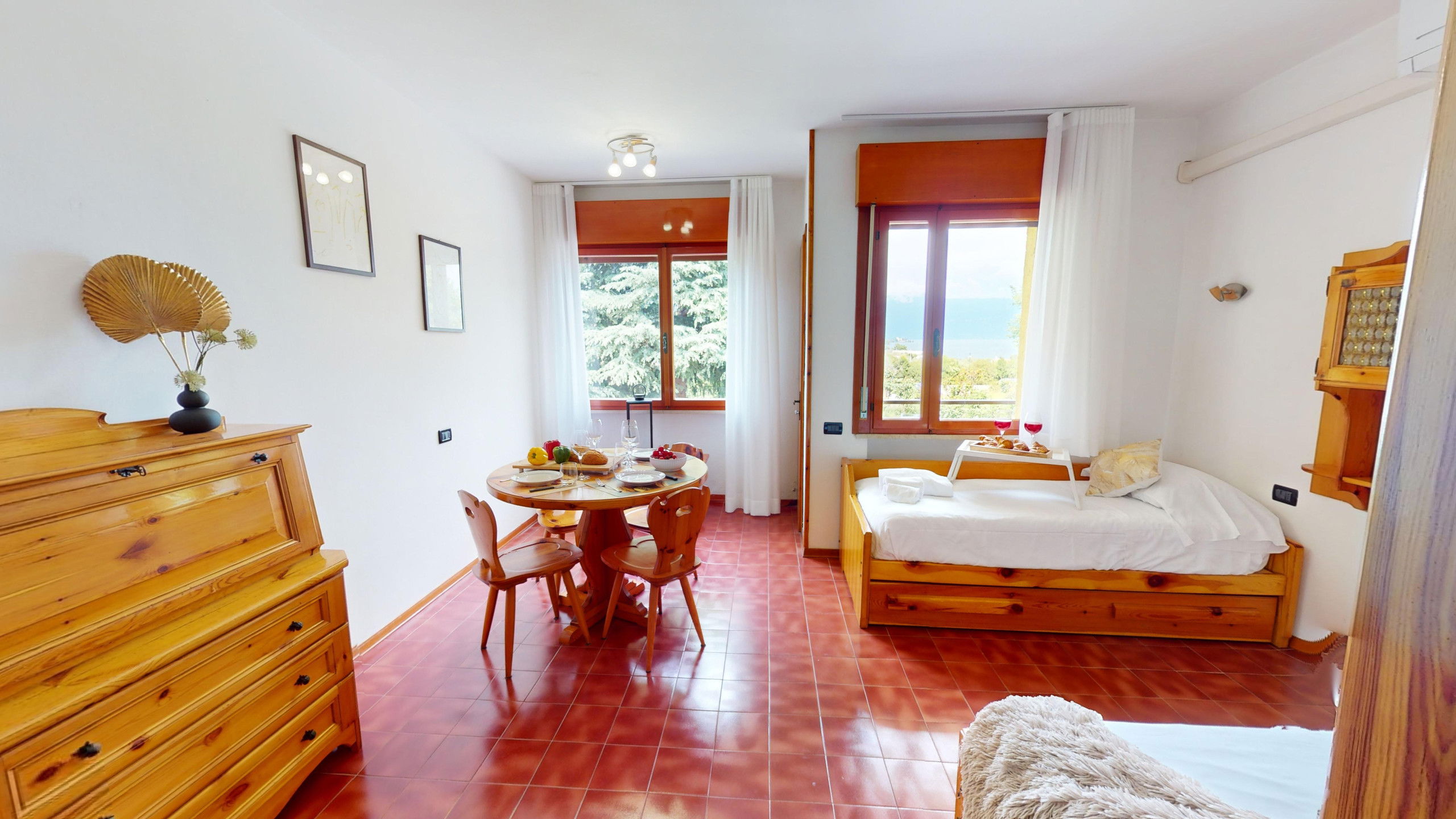 The apartment consists of a fully equipped kitchen, a living room with two single beds, a bedroom with two single beds, and a bathroom with a shower and washing machine. From the cosy living area, it is possible to access the lake-view balcony, ideal for relaxation and meals with company. The accommodation has an external parking space in the structure.