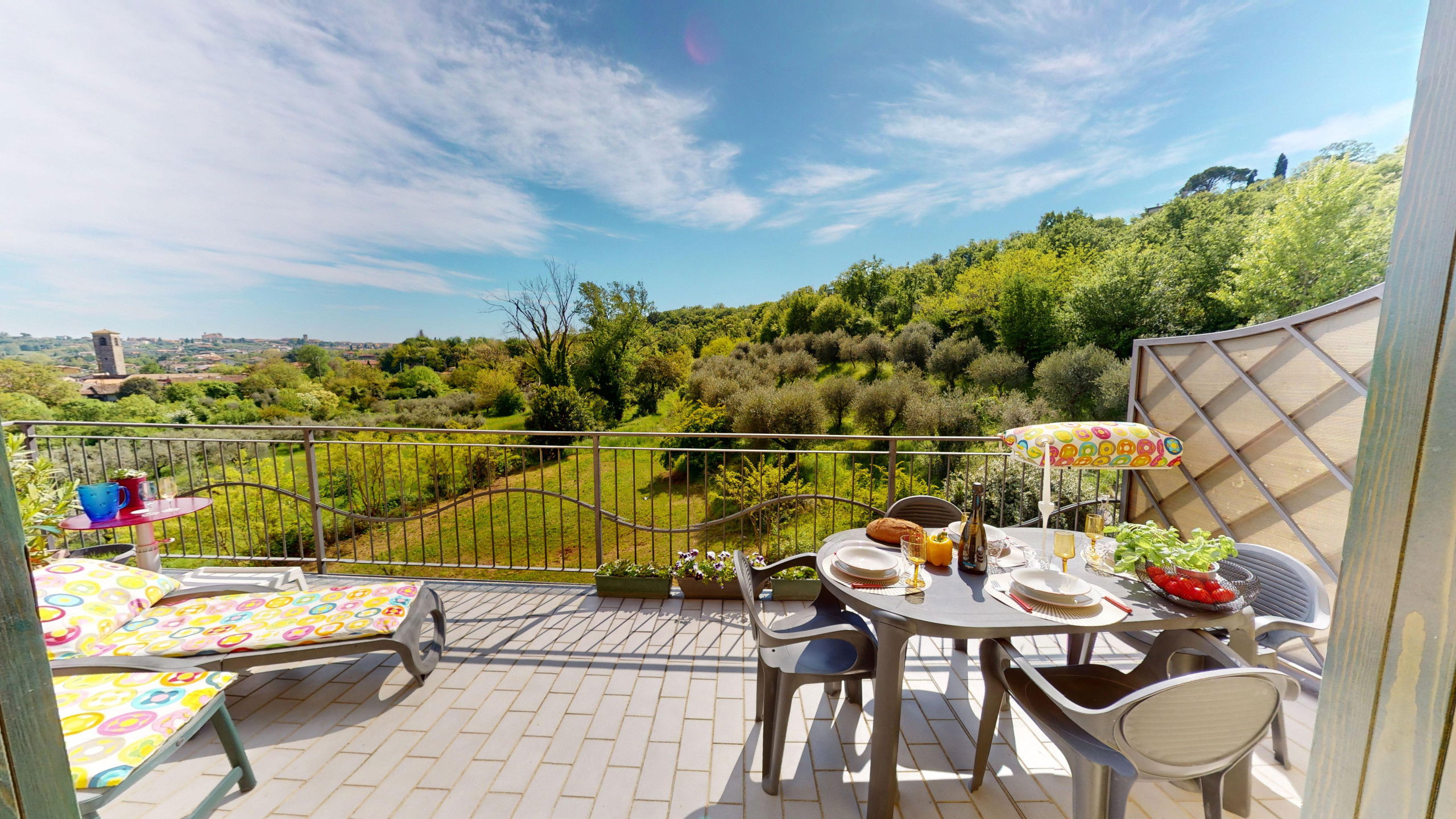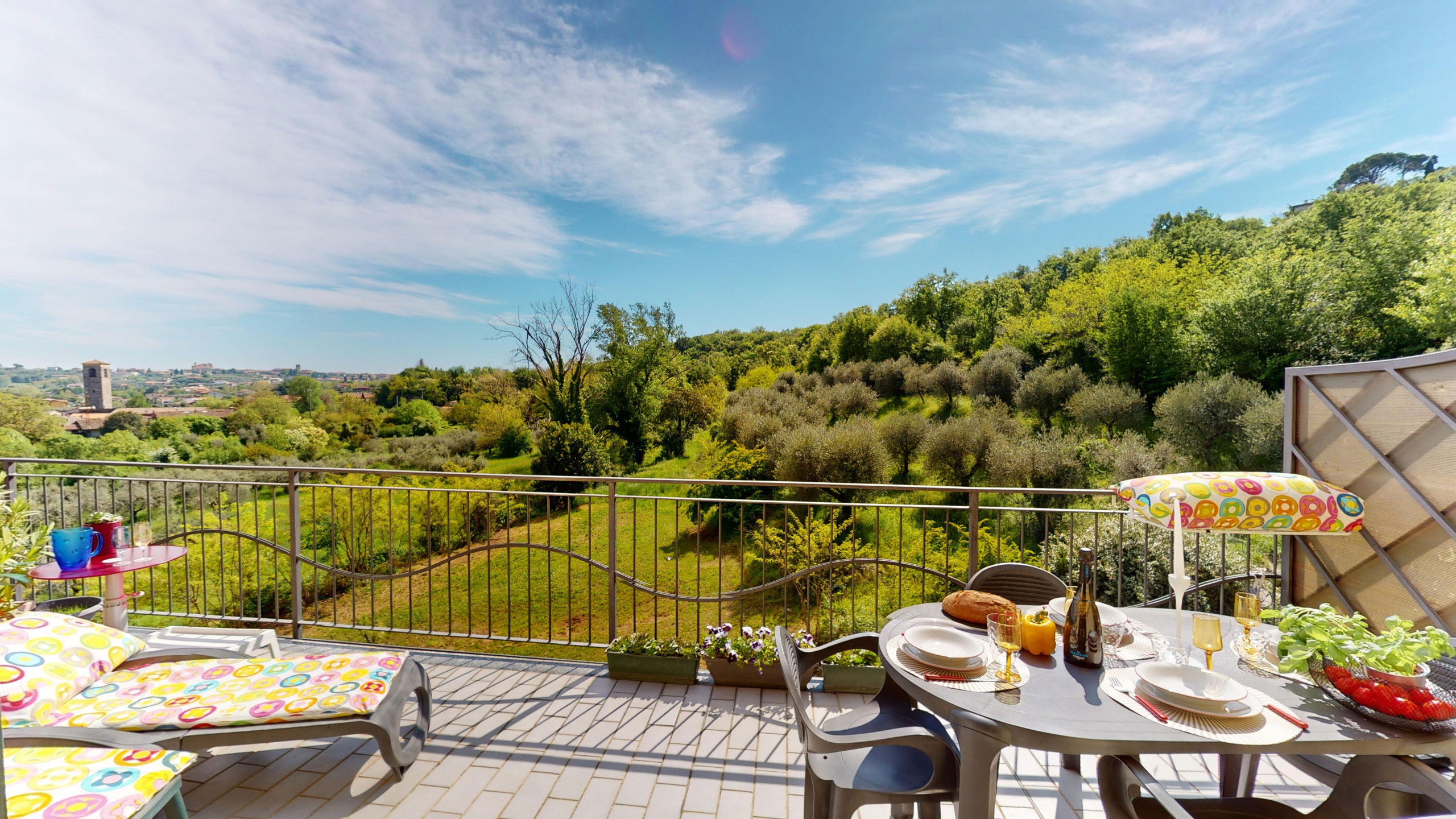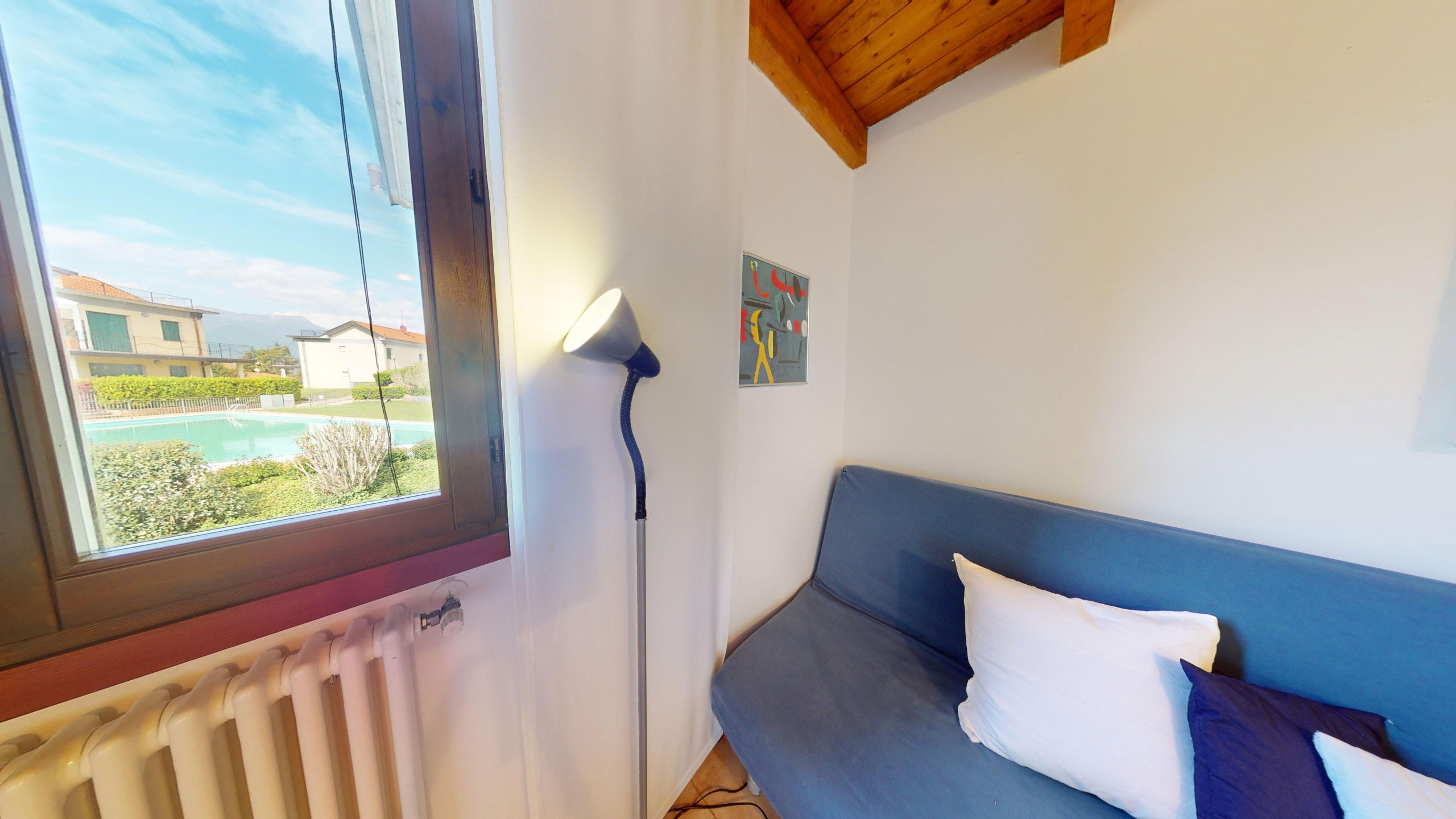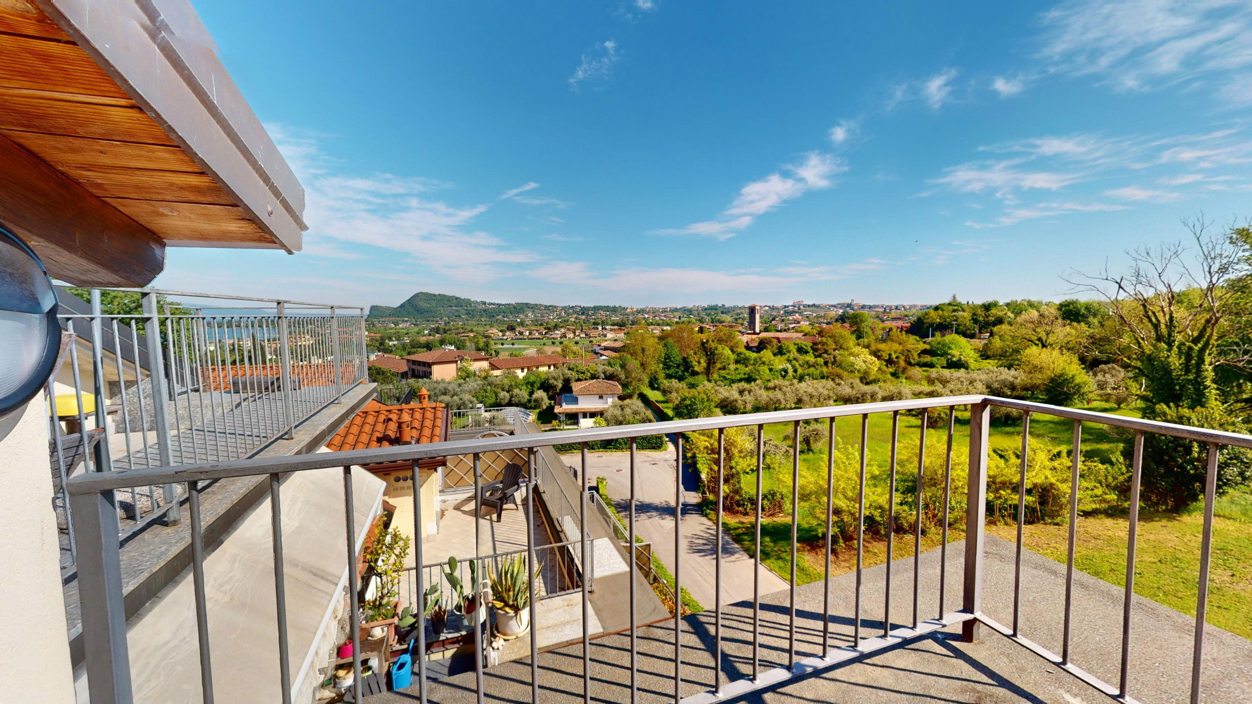 From the living room, you can access the spacious terrace fully equipped with a dining area and sunbeds where you can admire the rocky promontory of Rocca di Manerba and the Sasso nature reserve. On the mezzanine floor, we find the double bedroom with an en-suite bathroom with shower and washing machine. The property is equipped with screens. From the bedroom, you can access the solarium terrace with lake view from which you can admire the promontory, the bell tower of Pieve Vecchia and the lush green of the woods with the characteristic olive fields in total privacy.