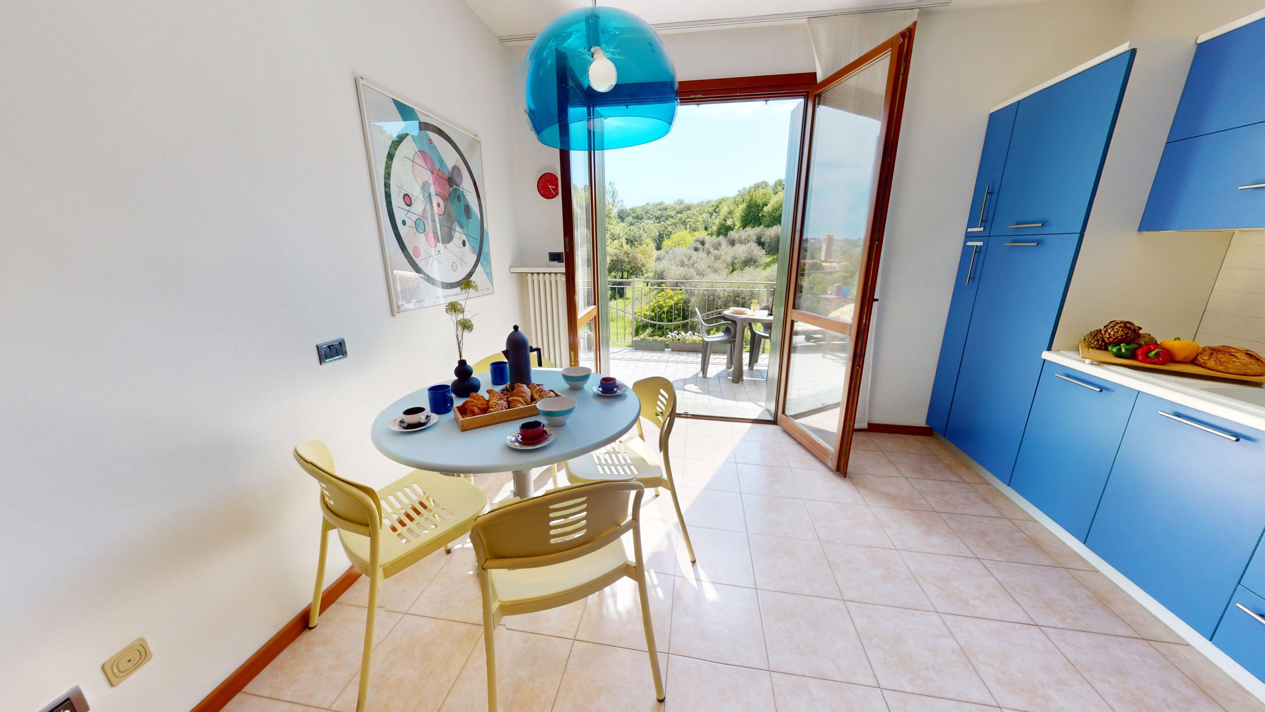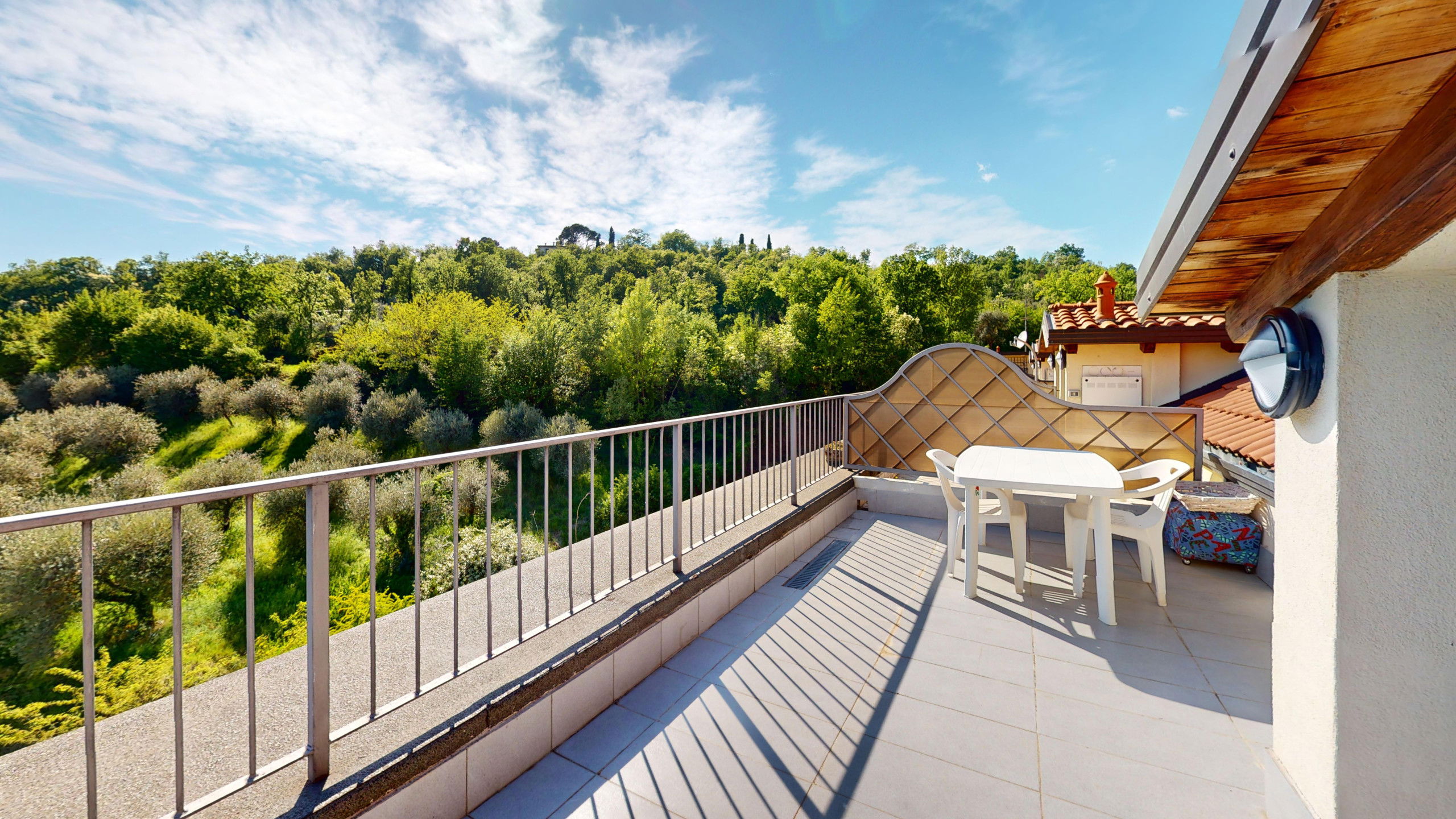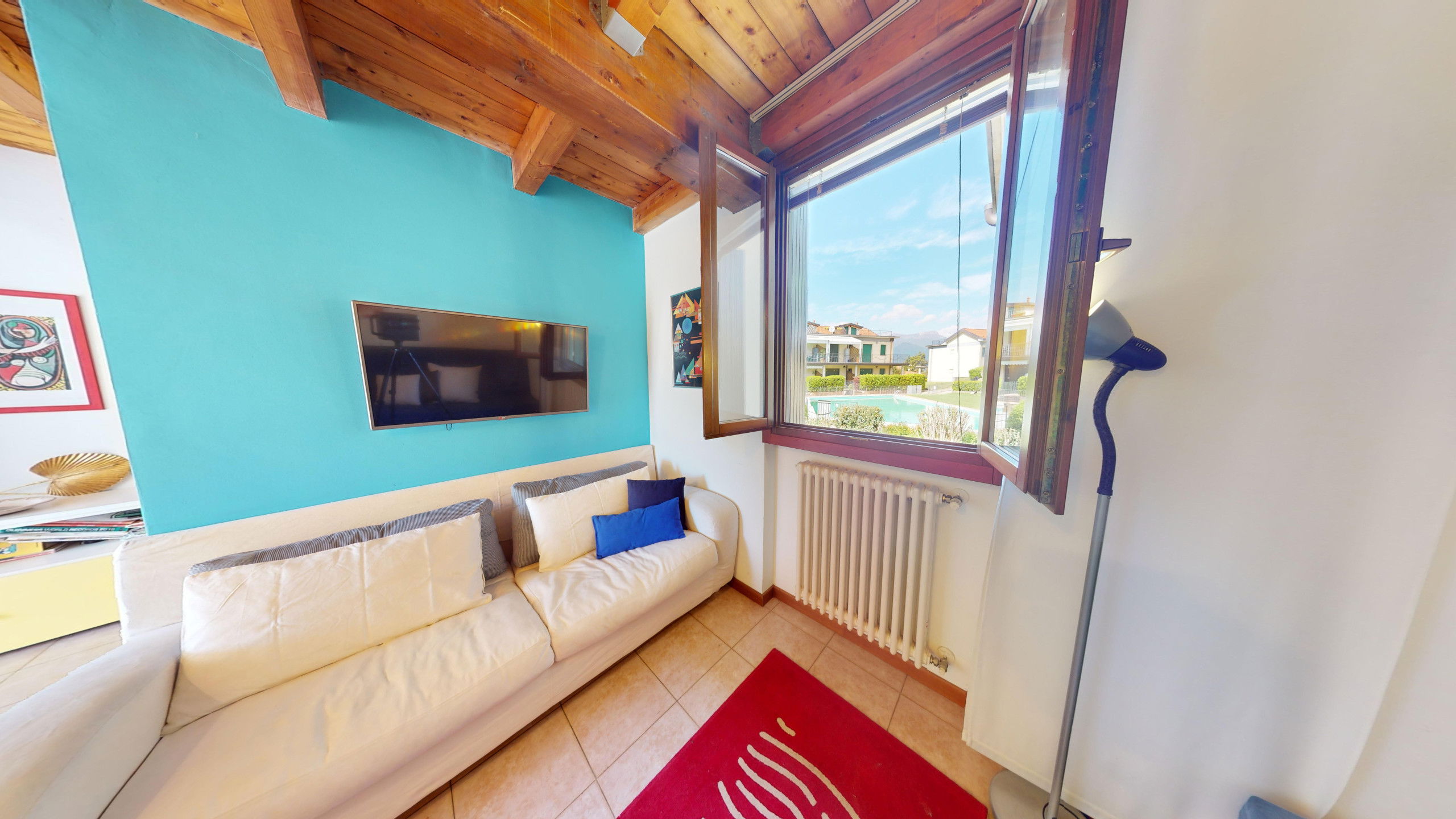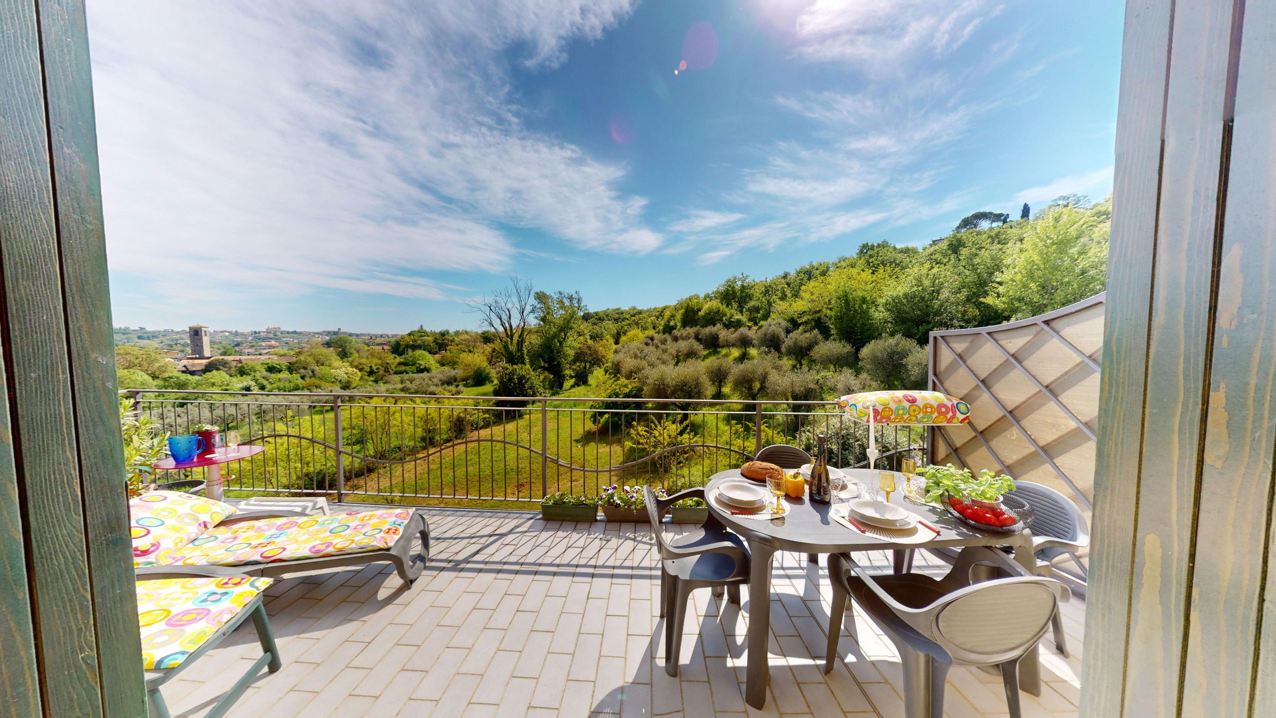 From the living room, you can access the spacious terrace fully equipped with a dining area and sunbeds where you can admire the rocky promontory of Rocca di Manerba and the Sasso nature reserve. On the mezzanine floor, we find the double bedroom with an en-suite bathroom with shower and washing machine. The property is equipped with screens. From the bedroom, you can access the solarium terrace with lake view from which you can admire the promontory, the bell tower of Pieve Vecchia and the lush green of the woods with the characteristic olive fields in total privacy.