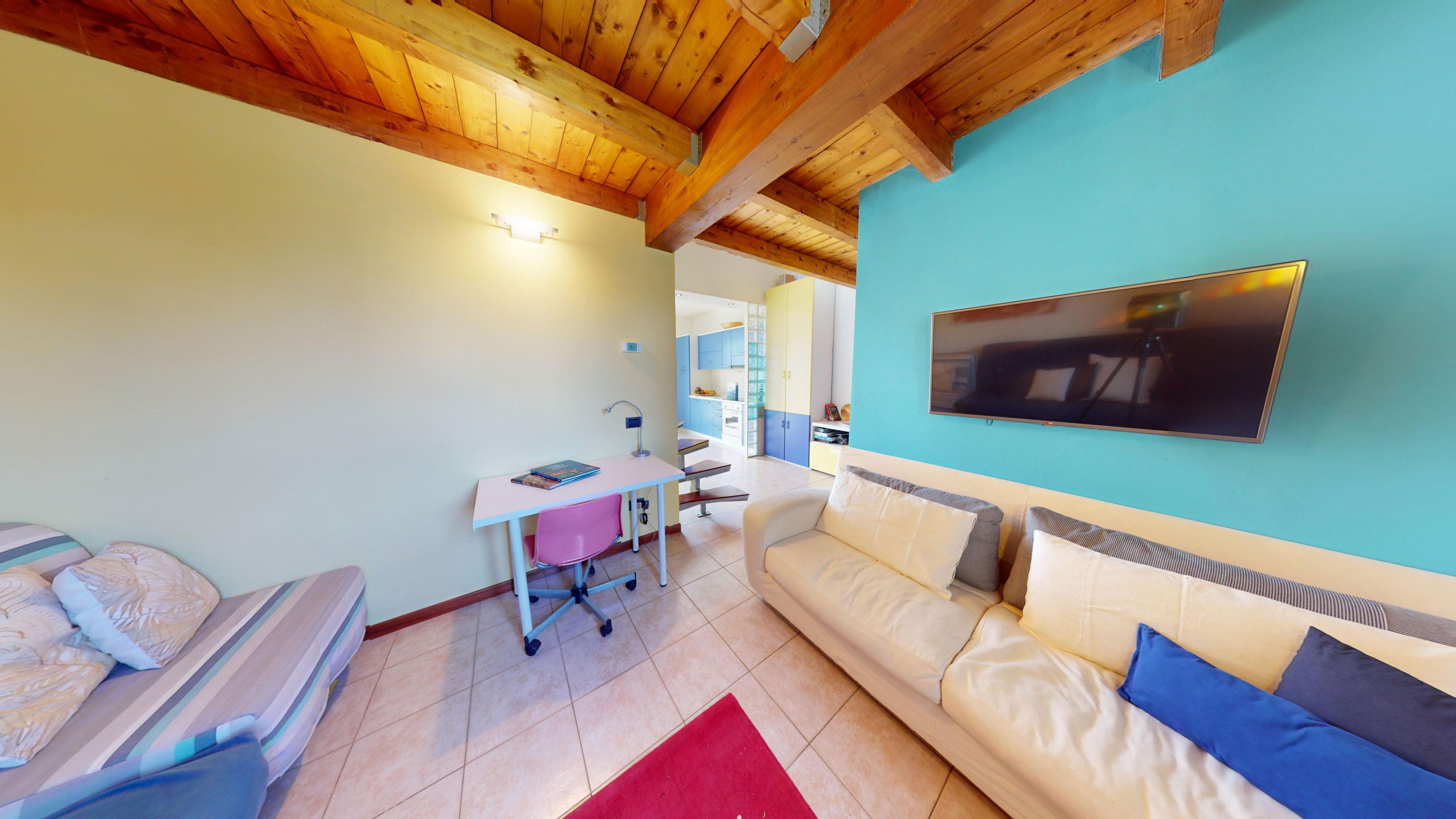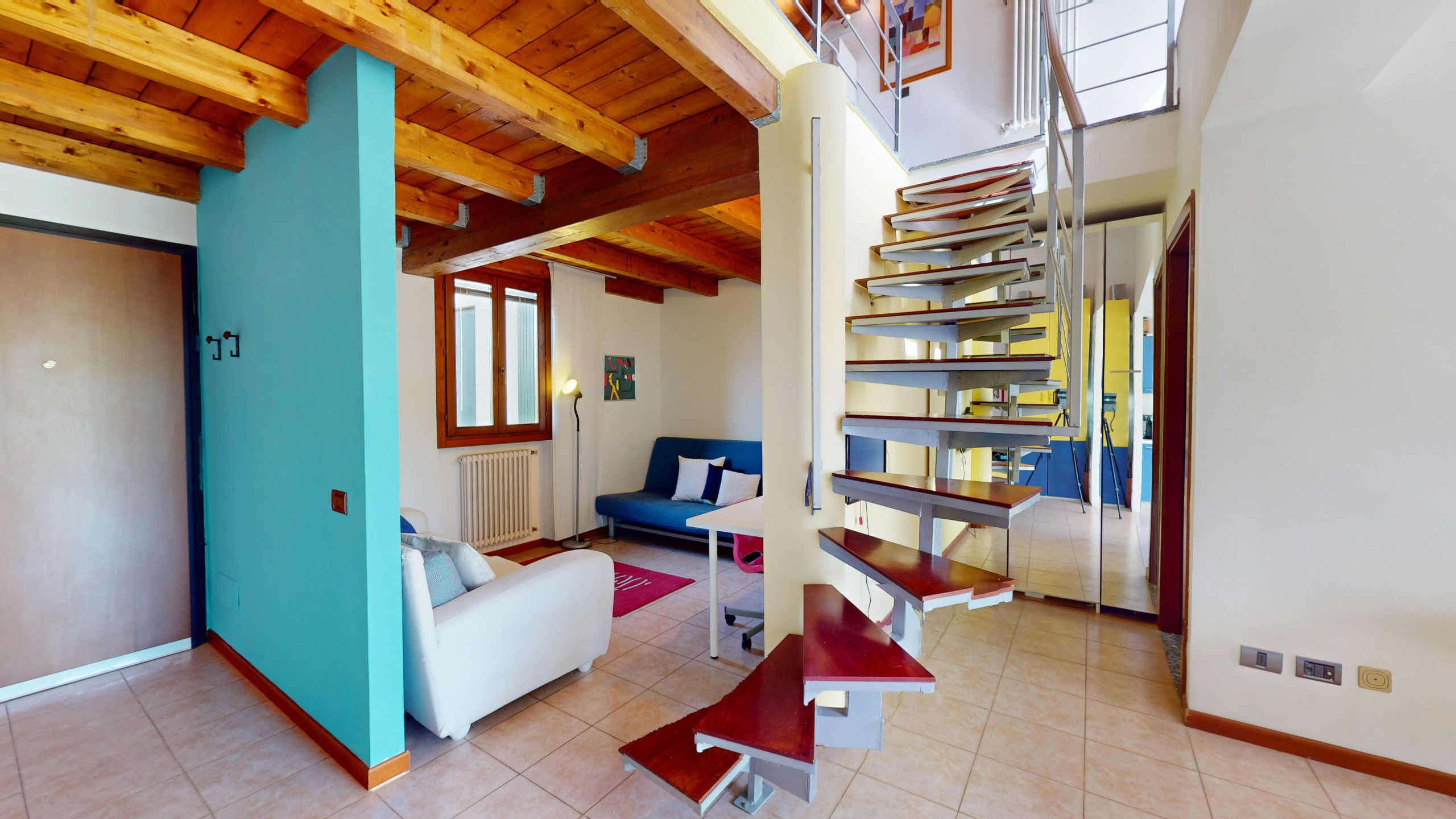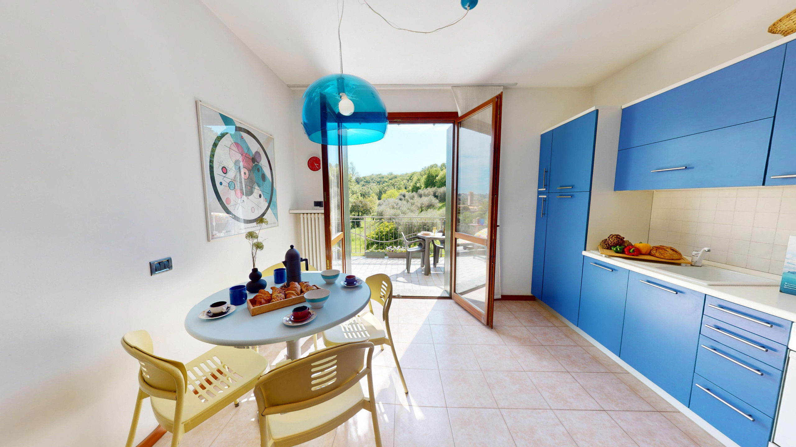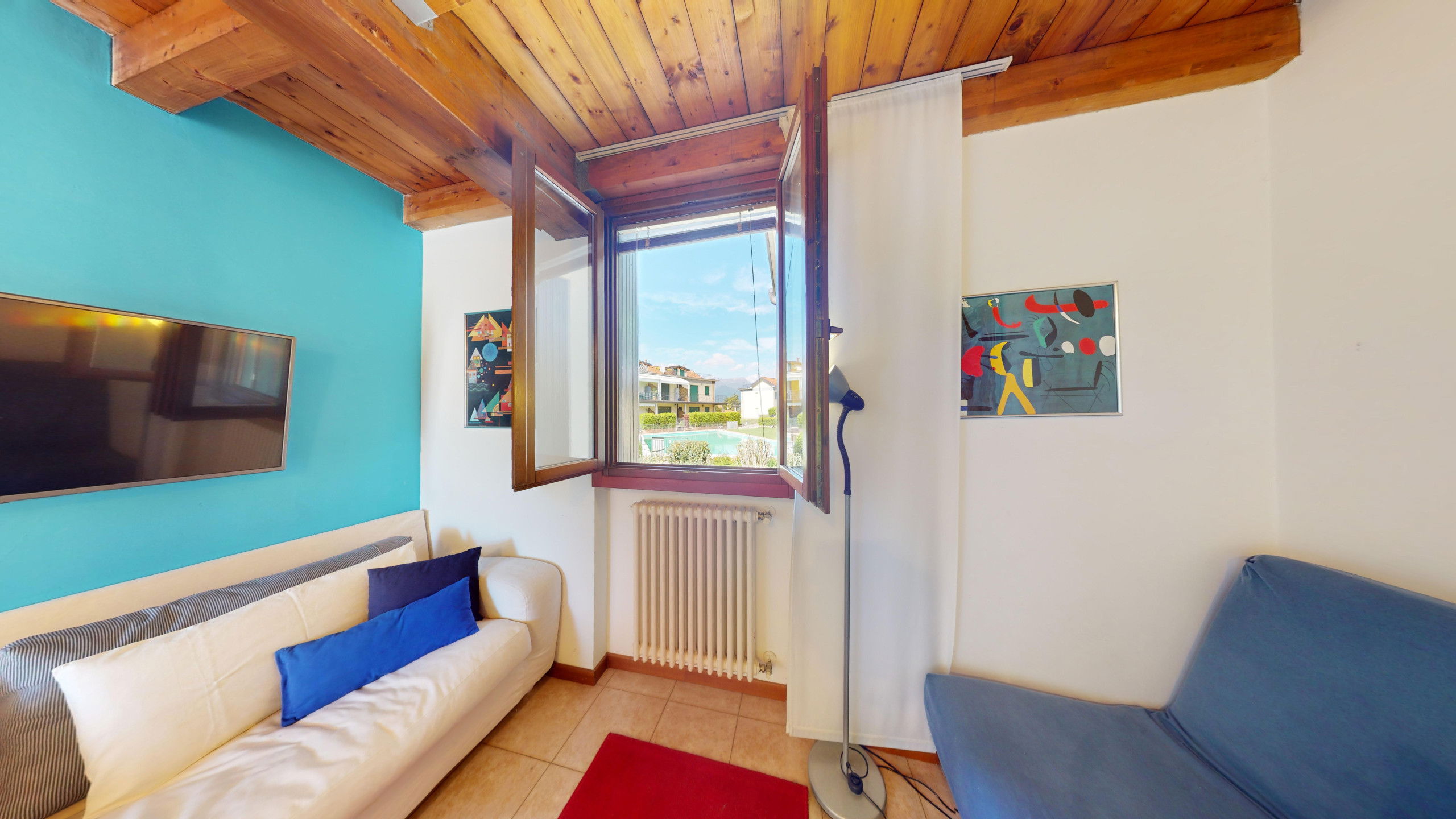 From the living room, you can access the spacious terrace fully equipped with a dining area and sunbeds where you can admire the rocky promontory of Rocca di Manerba and the Sasso nature reserve. On the mezzanine floor, we find the double bedroom with an en-suite bathroom with shower and washing machine. The property is equipped with screens. From the bedroom, you can access the solarium terrace with lake view from which you can admire the promontory, the bell tower of Pieve Vecchia and the lush green of the woods with the characteristic olive fields in total privacy.