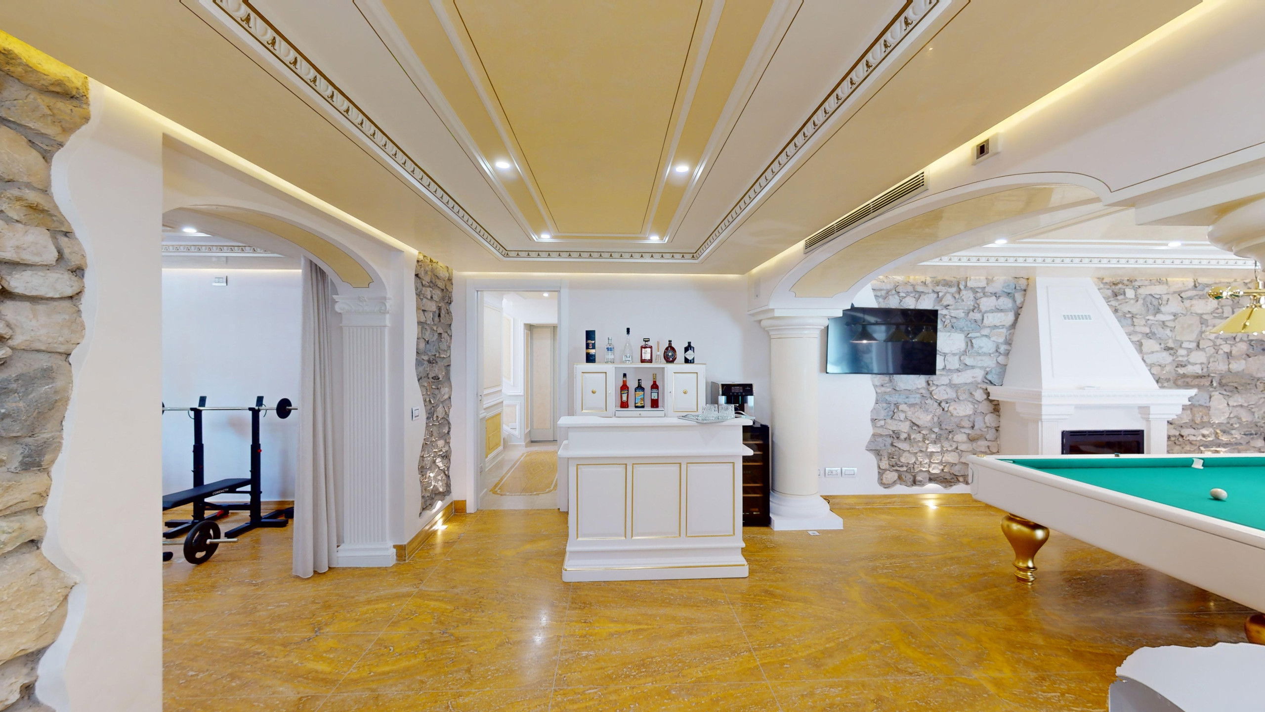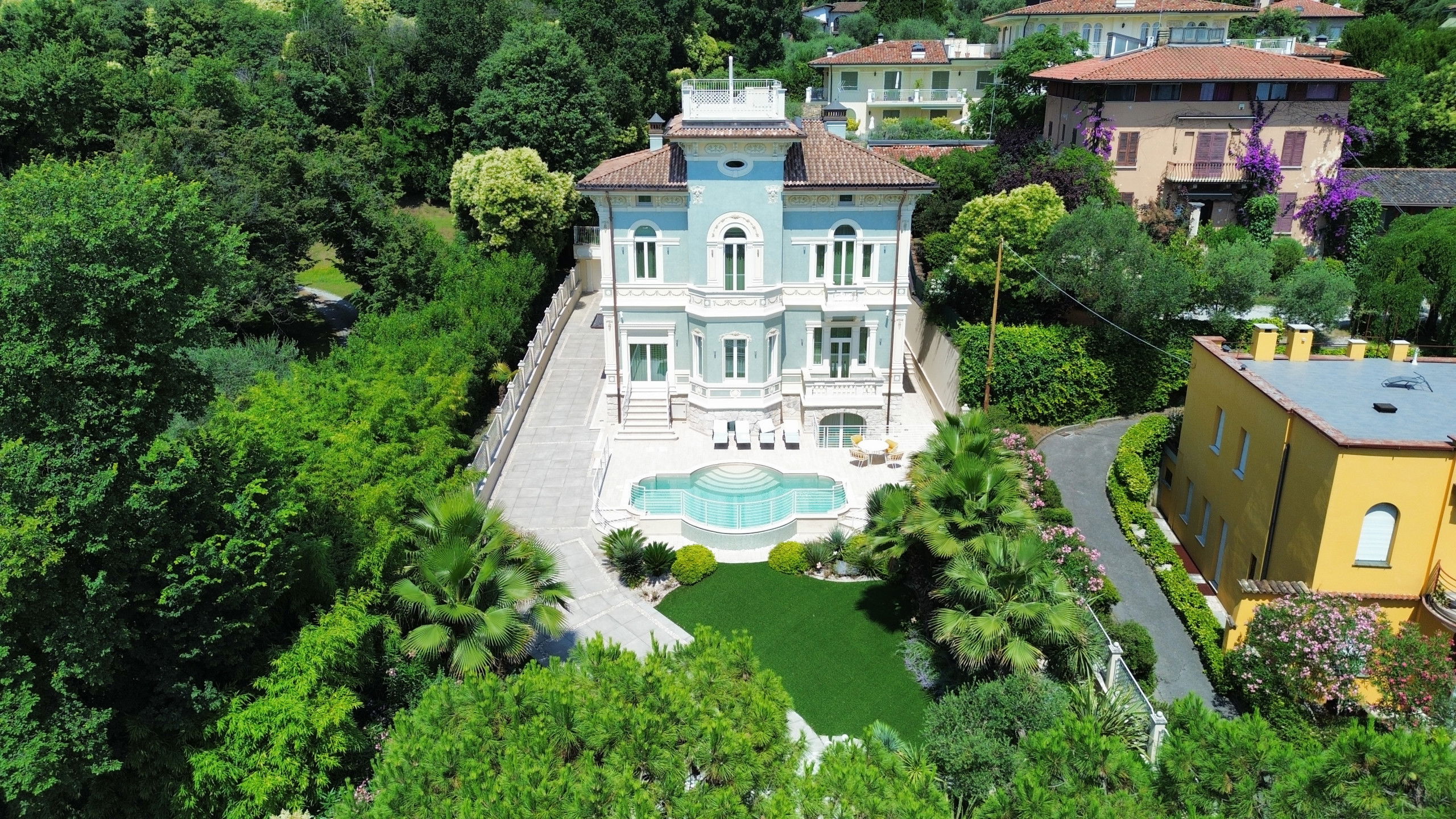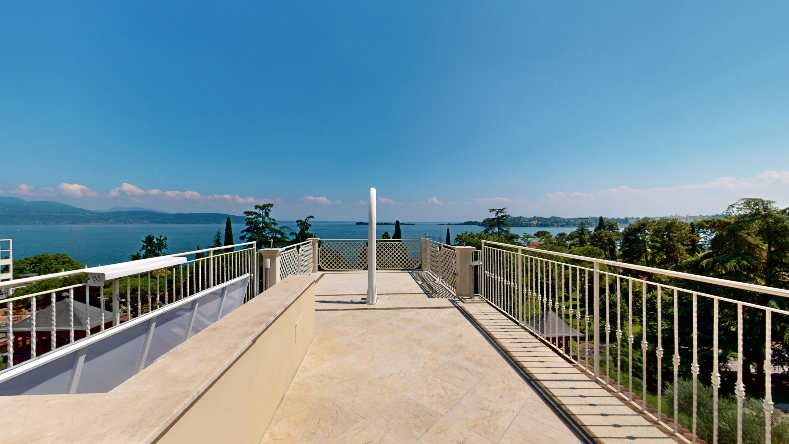 The villa is arranged over four levels and is equipped with an internal lift. On the floor is the bright living area which includes a large lounge with fireplace, a dining room with Lake view and a modern kitchen equipped with all comforts and a bedroom with private bathroom. On the second floor are the three bedrooms, all with bath and balcony. On the third floor, finally, the attic with bathroom which houses a double bedroom and a living area. From here it is possible to access the panoramic solarium terrace with the splendid Lake view. In the basement, it is possible to access the laundry, bathroom and Spa and wellness centre, equipped with sauna, Turkish bath and hydromassage tub. On the same level, you can also find a fully equipped gym and the recreation area with mini bar and billiard table from which you can directly access the swimming pool. From the finely maintained garden, it is possible to access the outdoor dining area with gazebo, table, barbecue and outdoor kitchen with hydromassage tub.