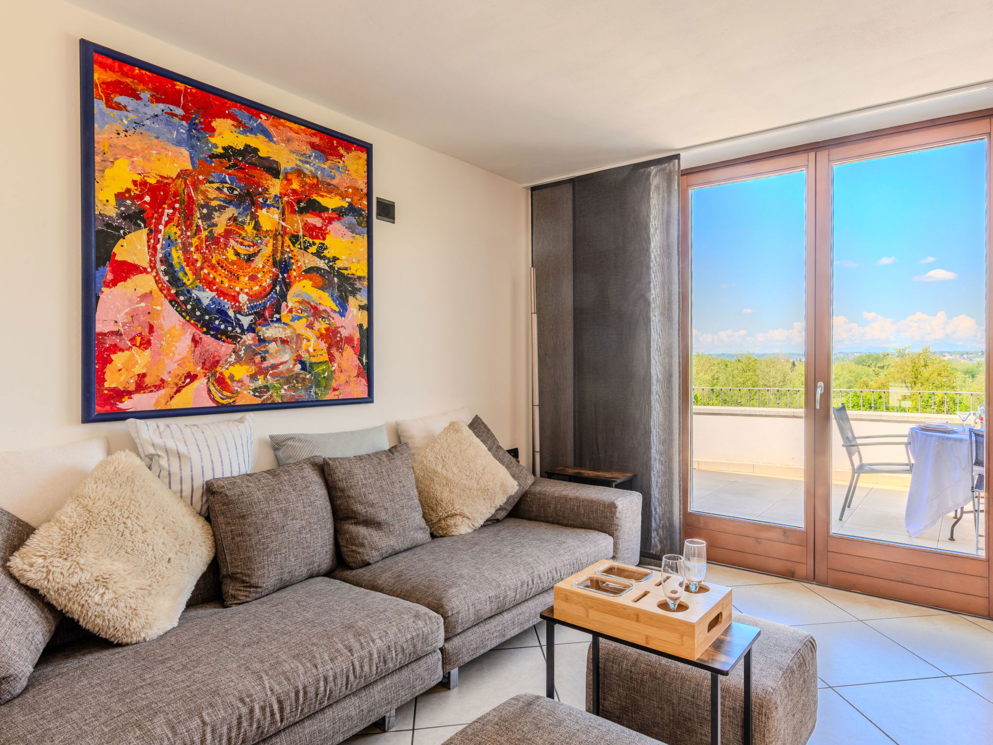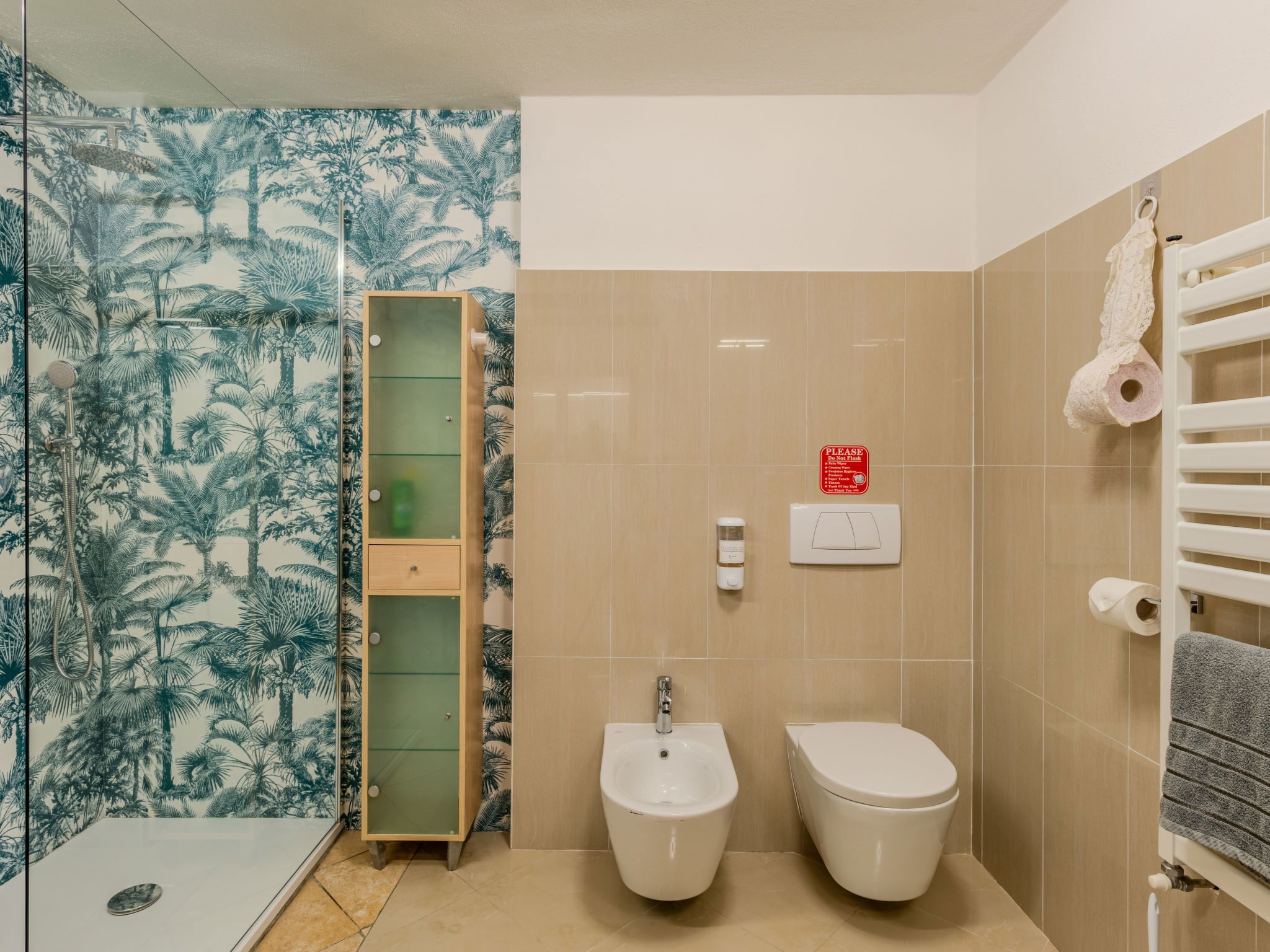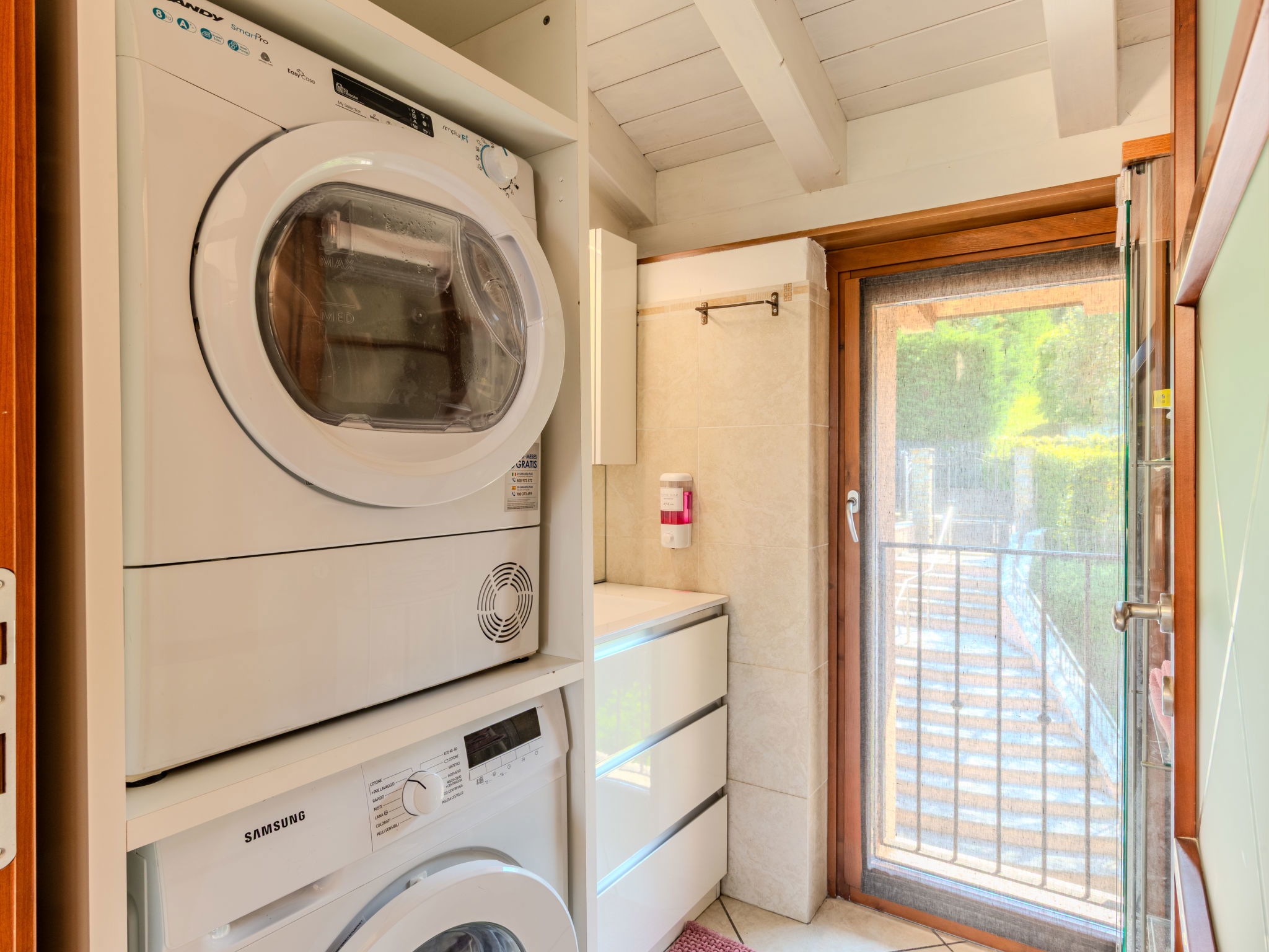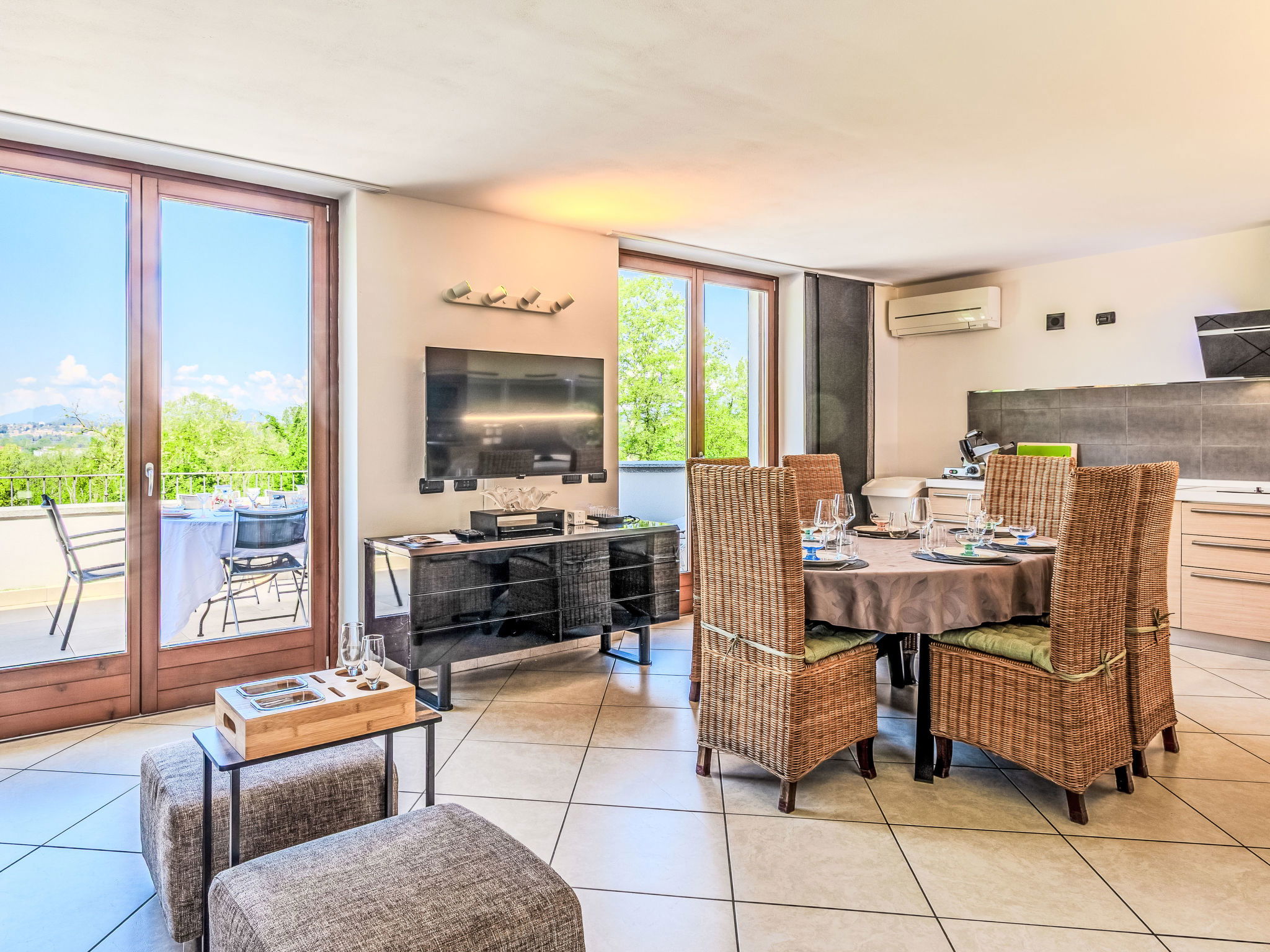 4-room apartment 120 m2 on 2 levels on 1st floor. Tasteful and cosy furnishings: living/dining room with dining table and TV. Exit to the terrace. 1 room with 1 bed and 1 double bed (180 cm, length 200 cm). 1 room with 1 double bed (160 cm, length 200 cm). Open kitchen (oven, dishwasher, 4 induction hot plates, toaster, kettle, microwave). Shower/bidet/WC. Gas heating, air-conditioning. On the lower ground floor: (exterior staircase), 1 large room with 1 bed, 1 double bed, shower/bidet/WC and TV. Exit to the garden, to the swimming pool. Terrace, large patio. Terrace furniture, deck chairs (6). Marvellous view of the mountains and the countryside. Facilities: washing machine, children's high chair, baby cot for up to 2 year olds, hair dryer. Internet (WiFi, free). Parking (2 cars). Please note: non-smokers only. Maximum 1 pet/ dog allowed. Private entrance, fire extinguisher, no lift. No internal connecting door between the floors. The pool mentioned in the description is for private use. IT013053C2DRN5KZV5