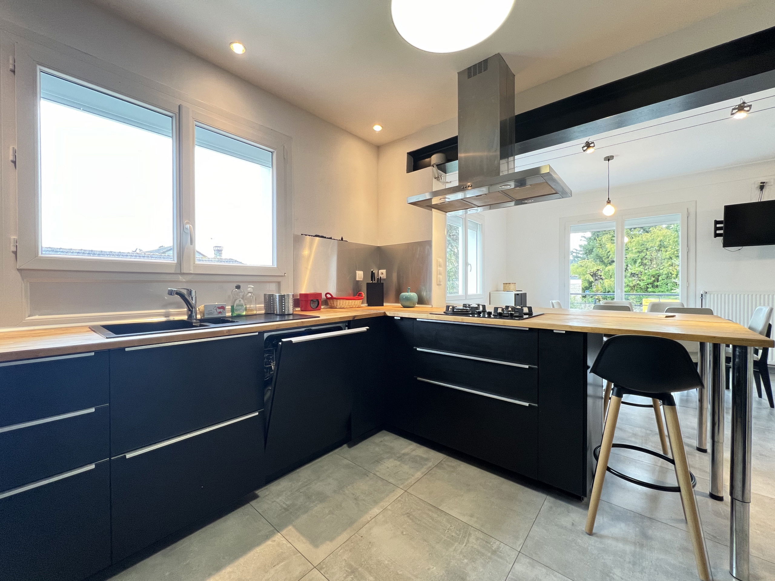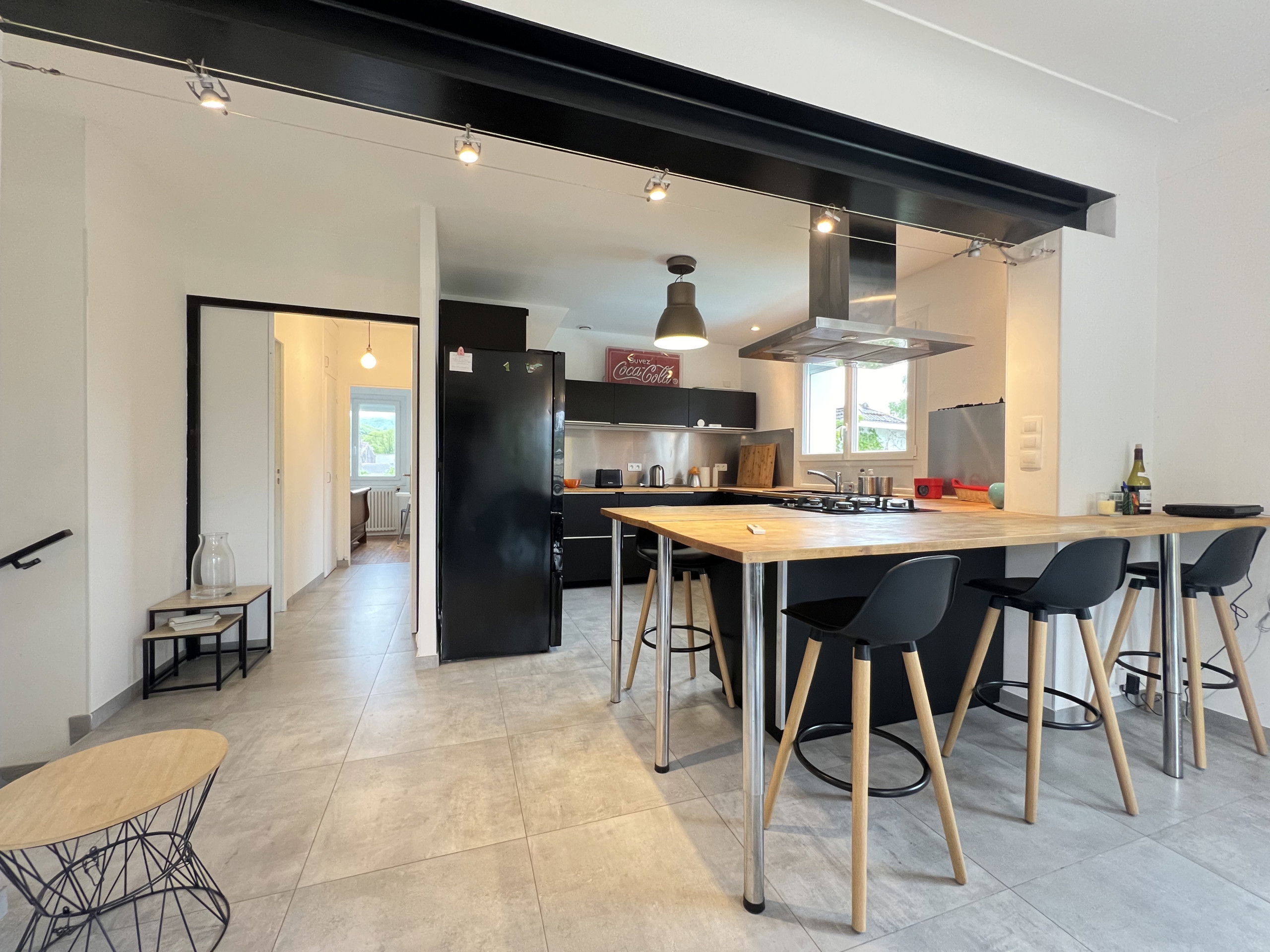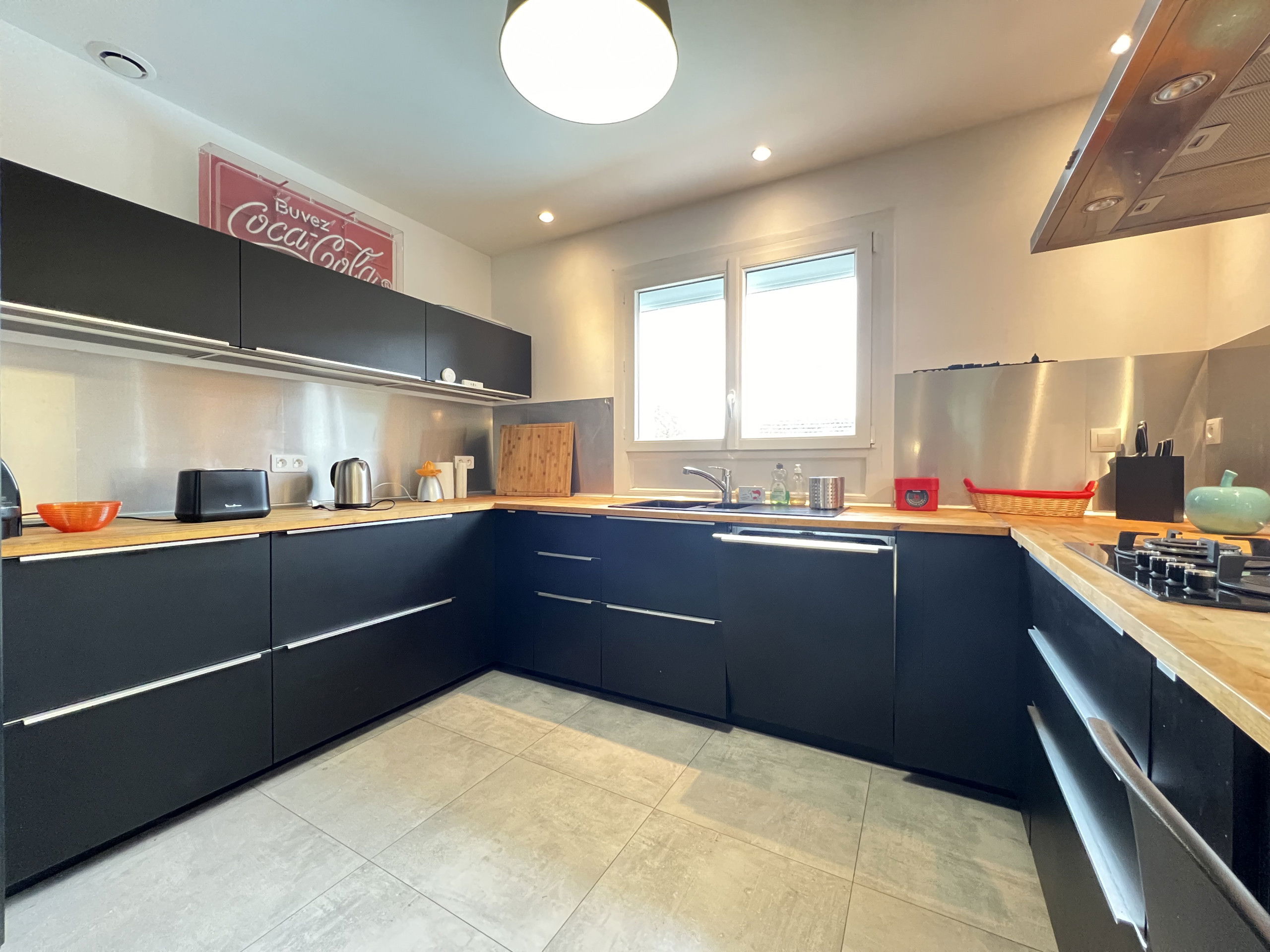 The open plan kitchen, of gas, is equipped with refrigerator, microwave, oven, freezer, dishwasher, dishes/cutlery, kitchen utensils, coffee machine, toaster and kettle.