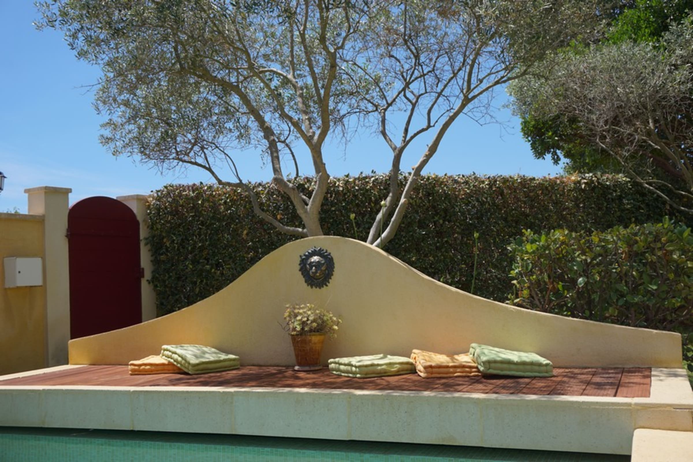 * Garden furniture, deckchairs around the swimming pool. Outdoor lighting