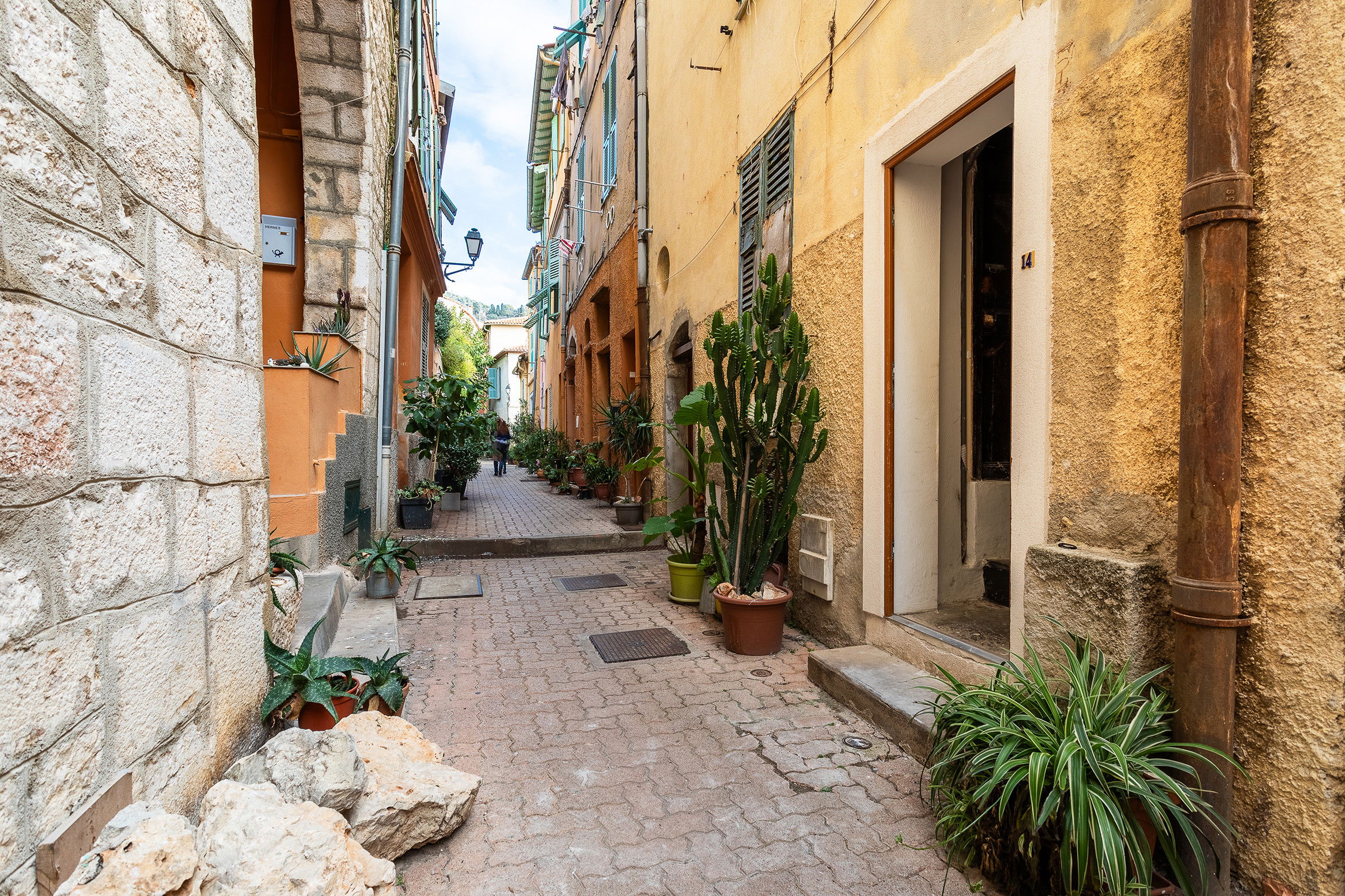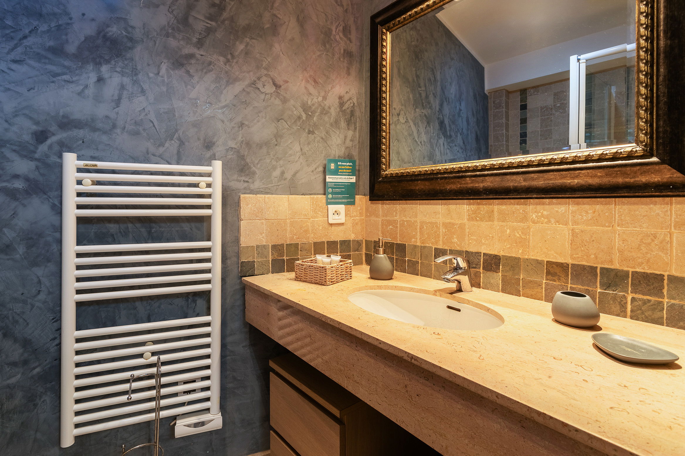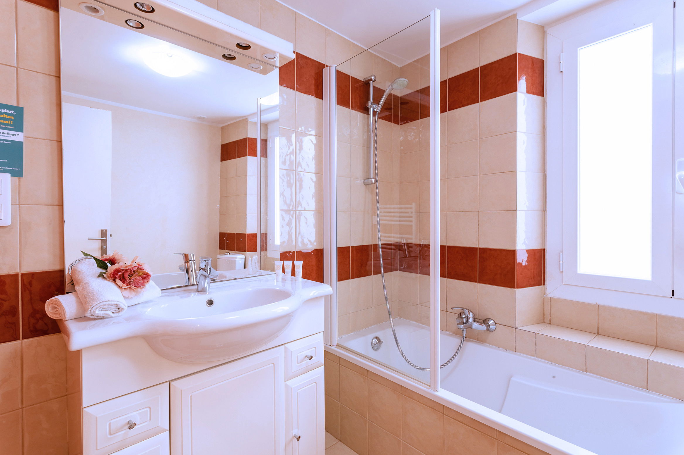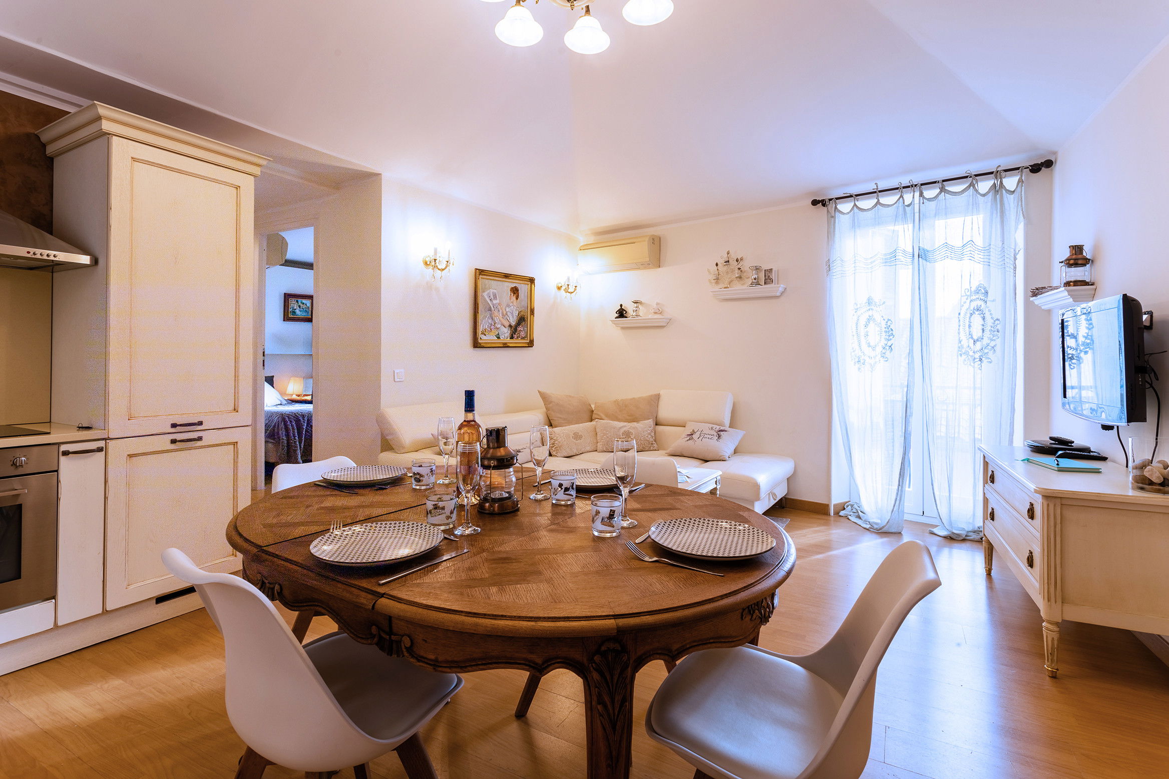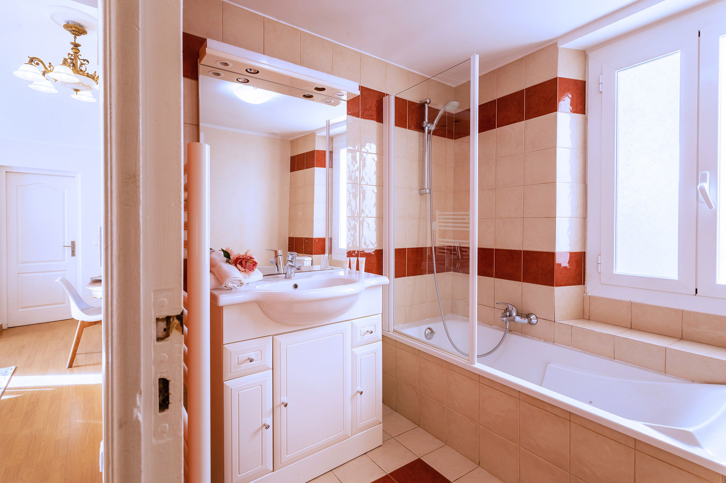 The entrance serves a bathroom and a bedroom on one side, then the living area composed of a living room equipped with a sofa, a coffee table, a TV and a WiFi internet connection. The dining area offers a table that can accommodate 4 people. These rooms offer a very nice sea view over the roofs of the old town. The living room is also air-conditioned.