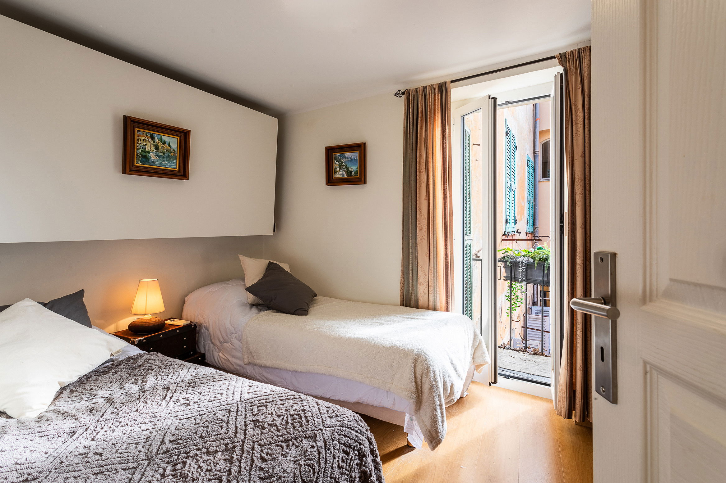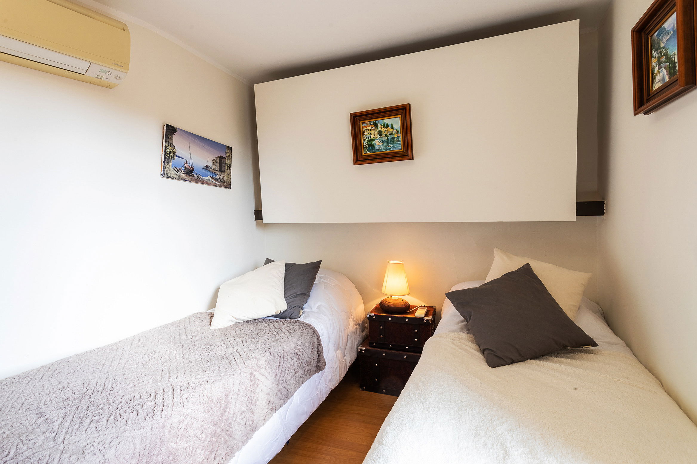 The second bedroom is also air-conditioned, with two single beds, a wardrobe and bedside table. Window overlooking a very quiet street in the old town. It also has its own bathroom with a bathtub, sink and toilet.
