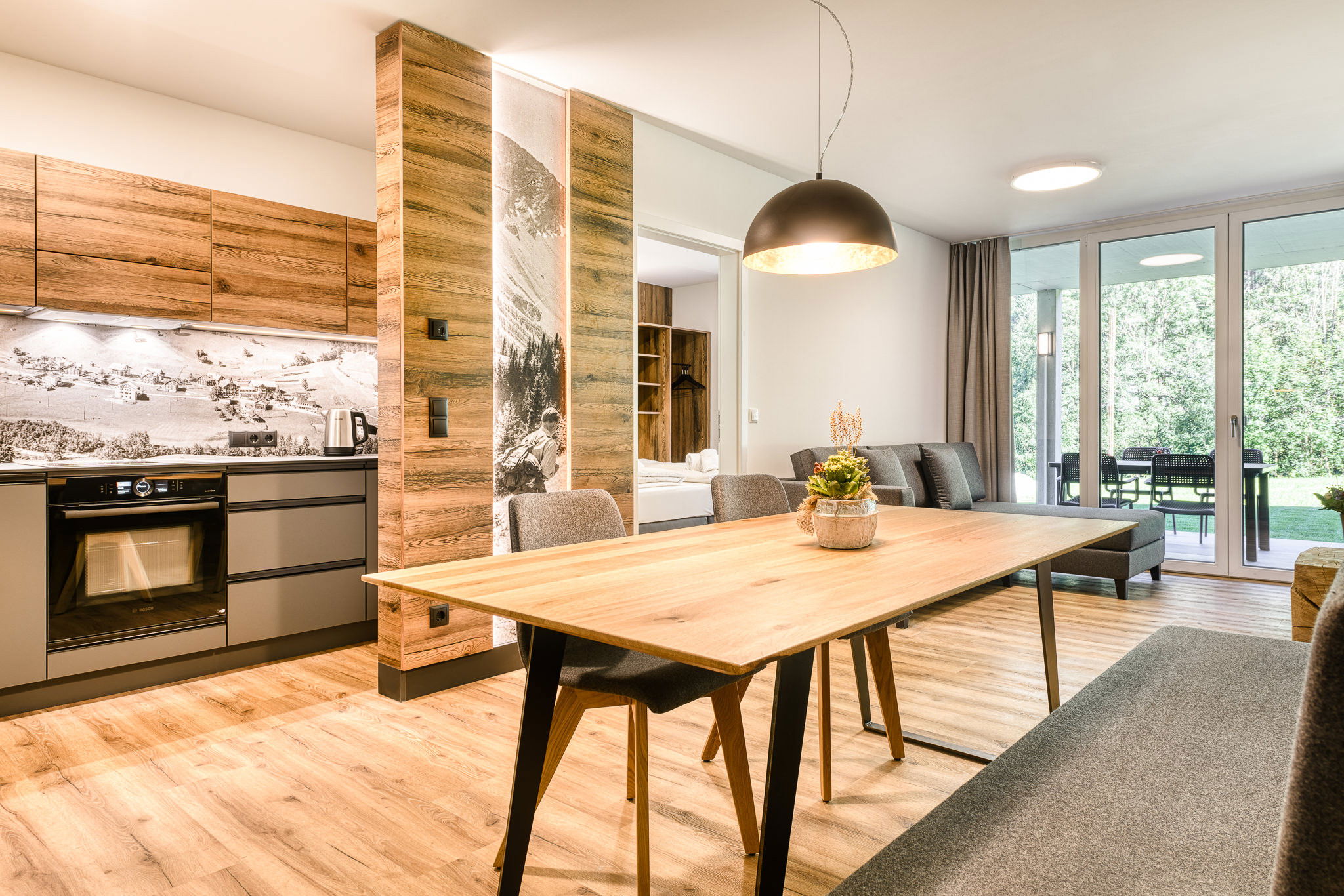 Our modern and functionally furnished holiday apartment in Alpine style can accommodate up to 8 people. Each bedroom with a double bed has its own bathroom, the kitchen is fully equipped and, depending on its size, offers enough space to end an eventful day at the cozy dining table. The balcony offers a beautiful, unobstructed view of the Brandner mountain panorama and invites you to have a drink. In the cozy seating area you can put your feet up with an exciting book.