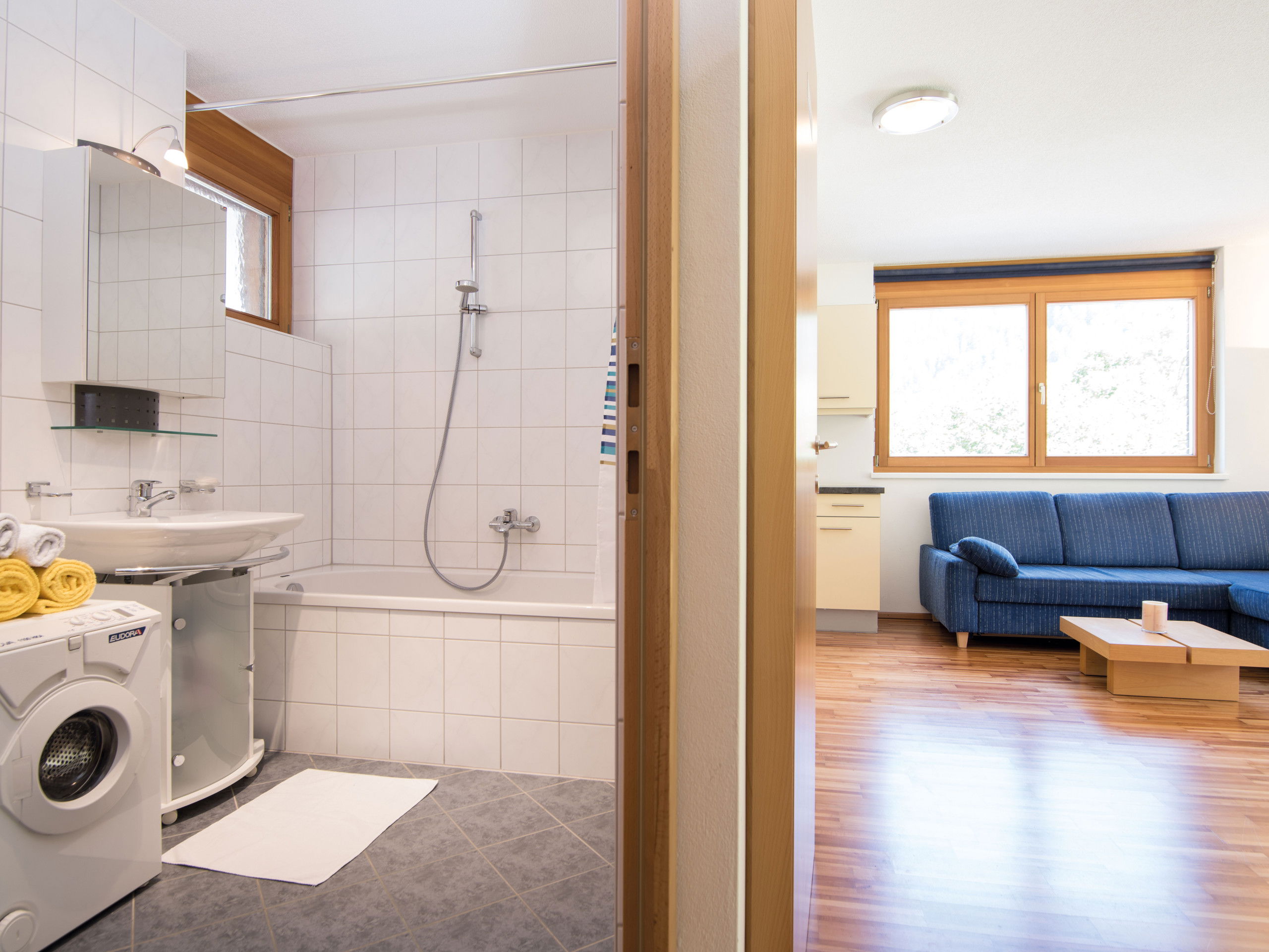 Here you can expect an open kitchen and living area as well as a large garden with a terrace. A folding bed in the living room offers additional sleeping space. The apartment is beautifully furnished and flooded with light. The entire building has a parking garage as well as a ski and bicycle room.