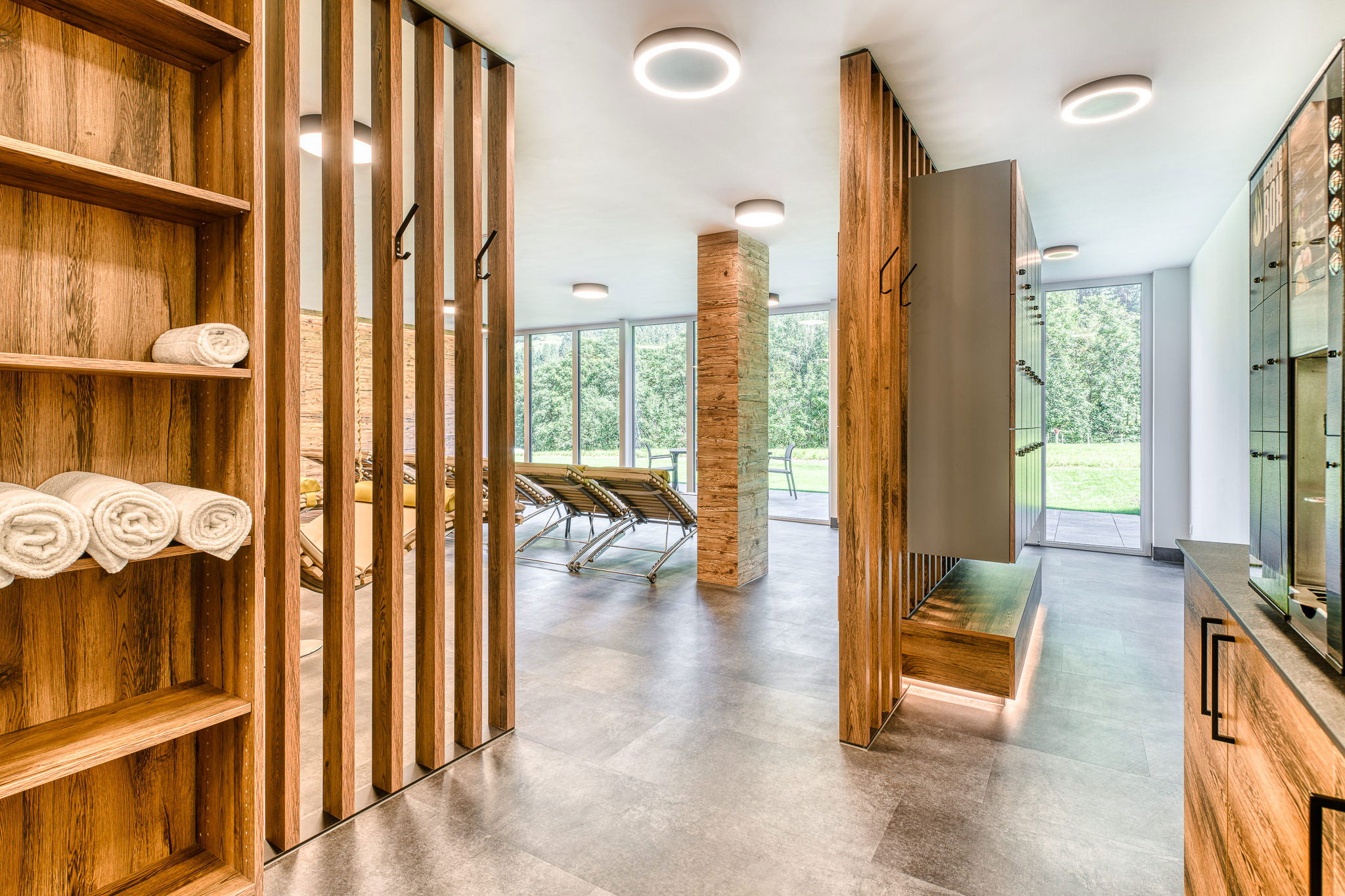 The wellness area includes a Finnish sauna, bio sauna, infrared cabin and steam bath, a relaxation room with outdoor access and fresh Brandner spring water. Massages are available on request.