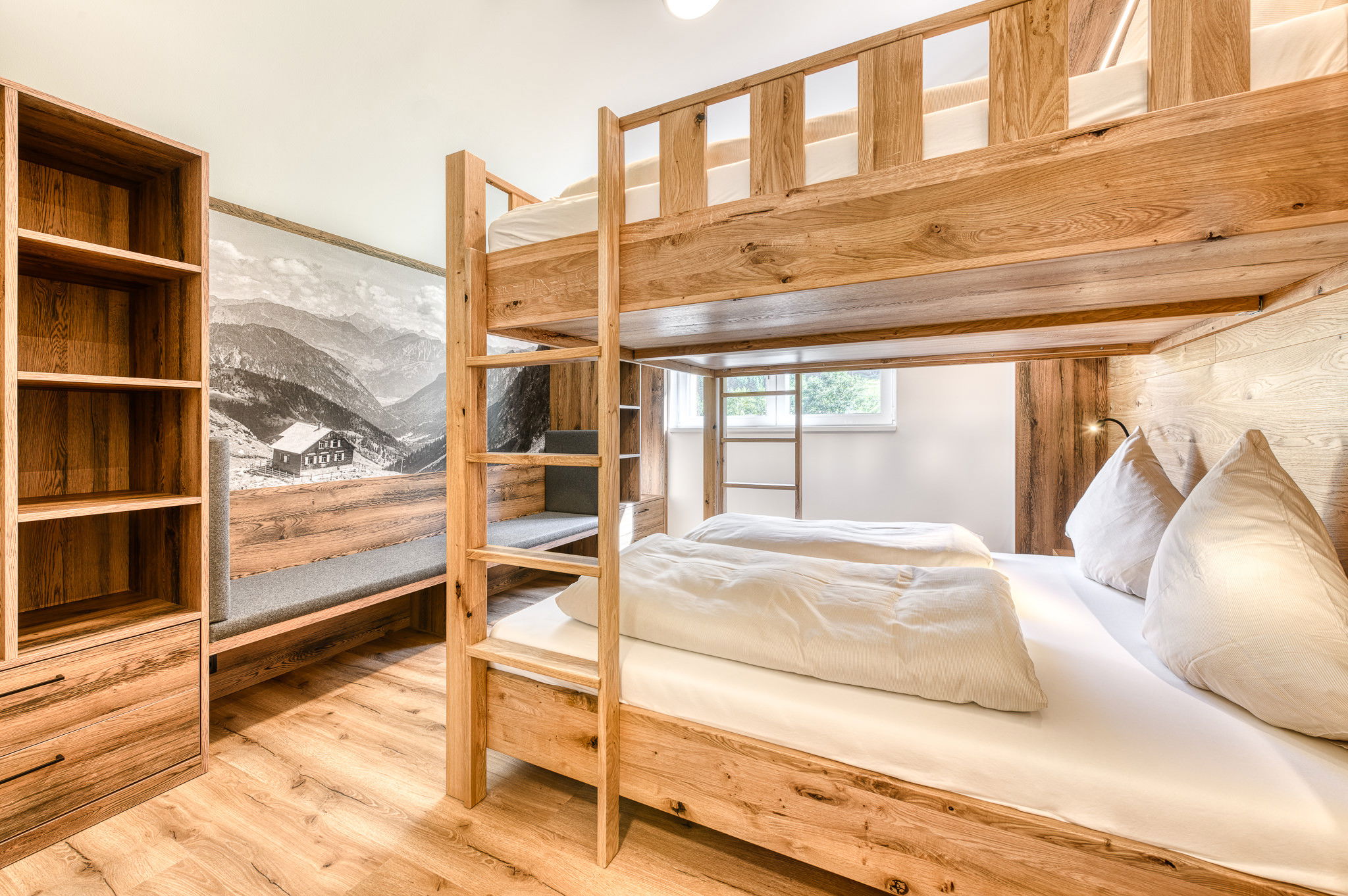 It offers two bedrooms and two shower bathrooms. One bedroom features a comfortable double bed, while the second bedroom is designed as a high-quality bunk-bed room made of solid wood. Warm tones and clear lines create cozy, protected sleeping areas that are especially popular with children and teenagers.