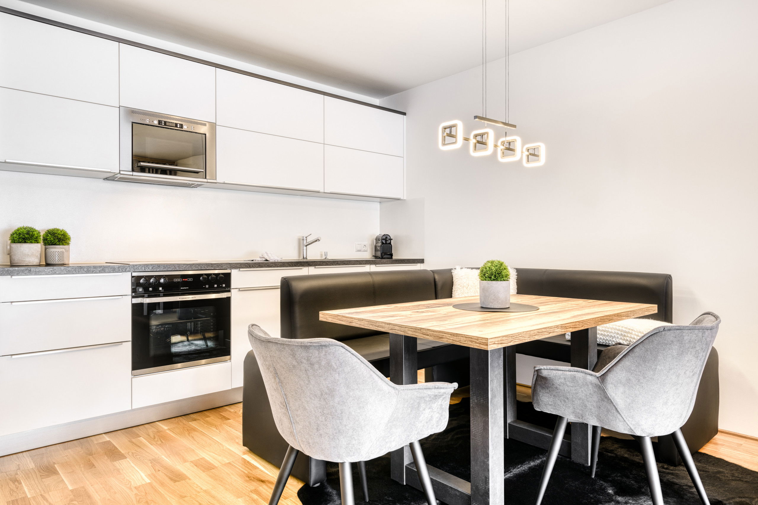 A fully equipped designer kitchen awaits you with a fridge, dishwasher, hob, oven, coffee machine (Nespresso), toaster and a kettle. The open dining room can accommodate up to seven people. The cozy living room invites you to linger and relax after a lovely day of skiing or a challenging mountain tour.