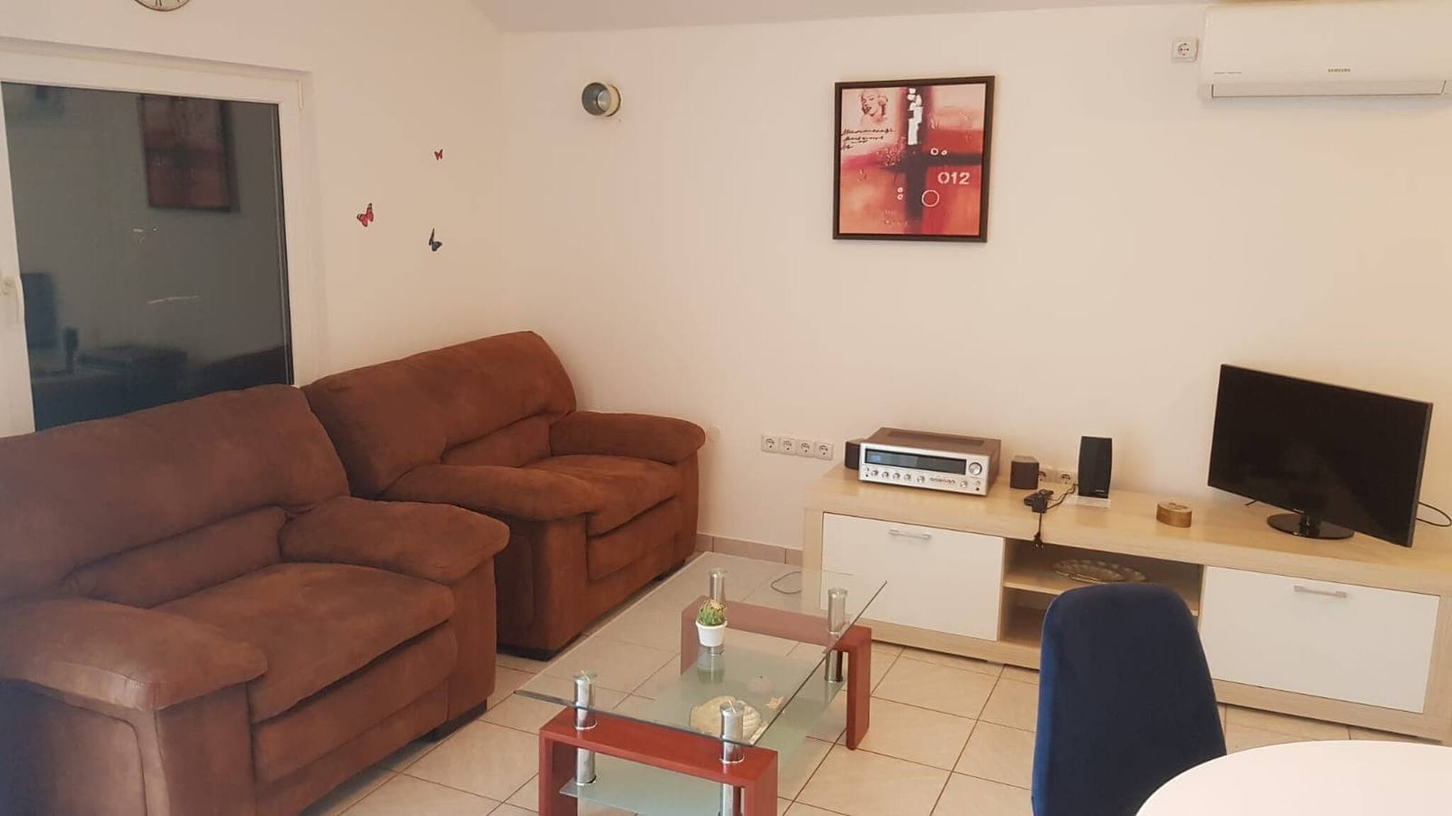 The apartment features a well-equipped kitchen, complete with a stove, fridge, freezer, dishwasher, and all the necessary kitchenware. Enjoy home-cooked meals or step out to the nearby restaurants and cafes. The living area is bright and airy, providing a comfortable space to unwind after a day of exploring.