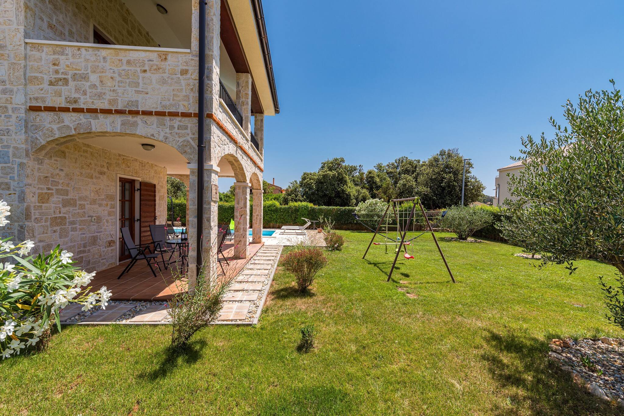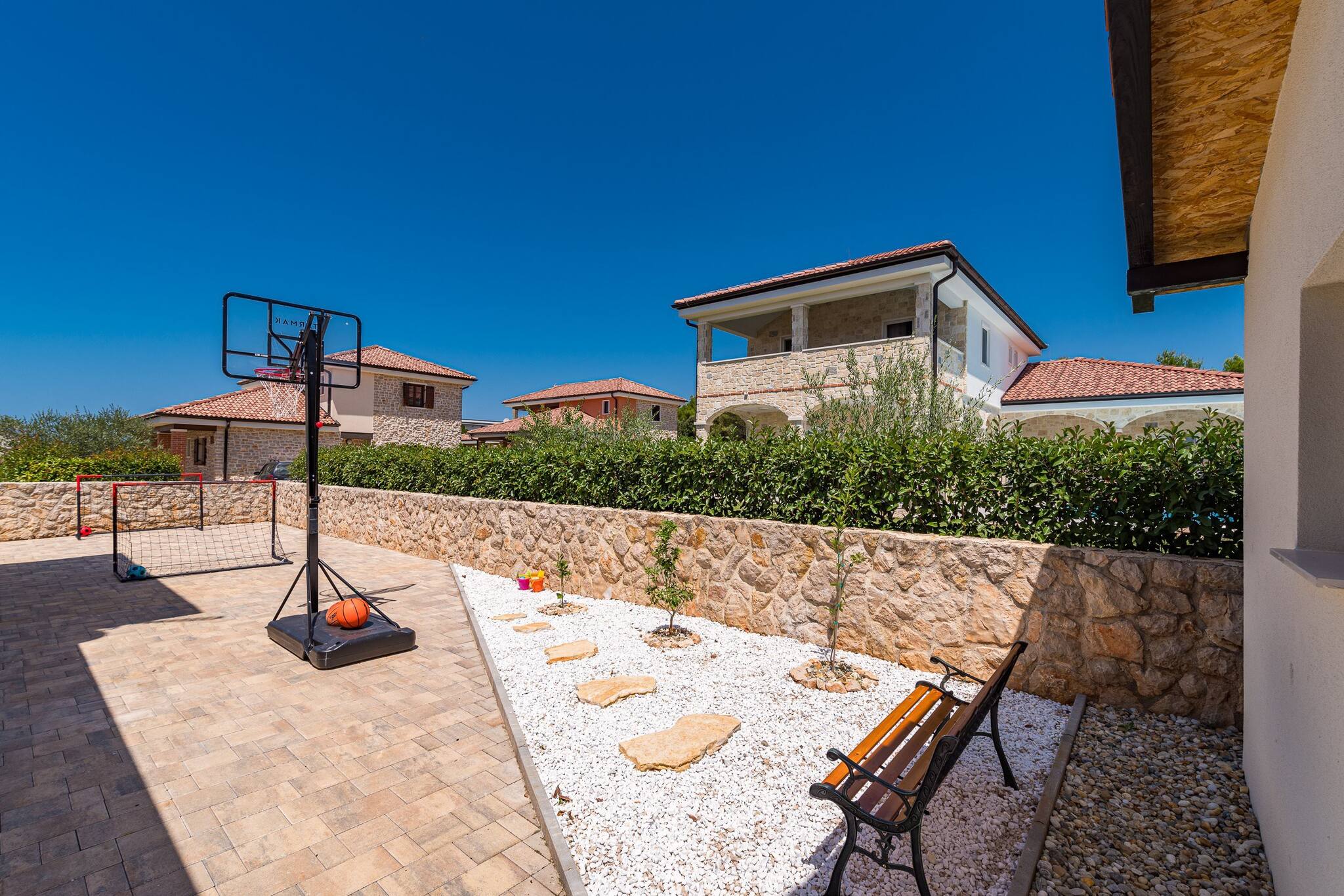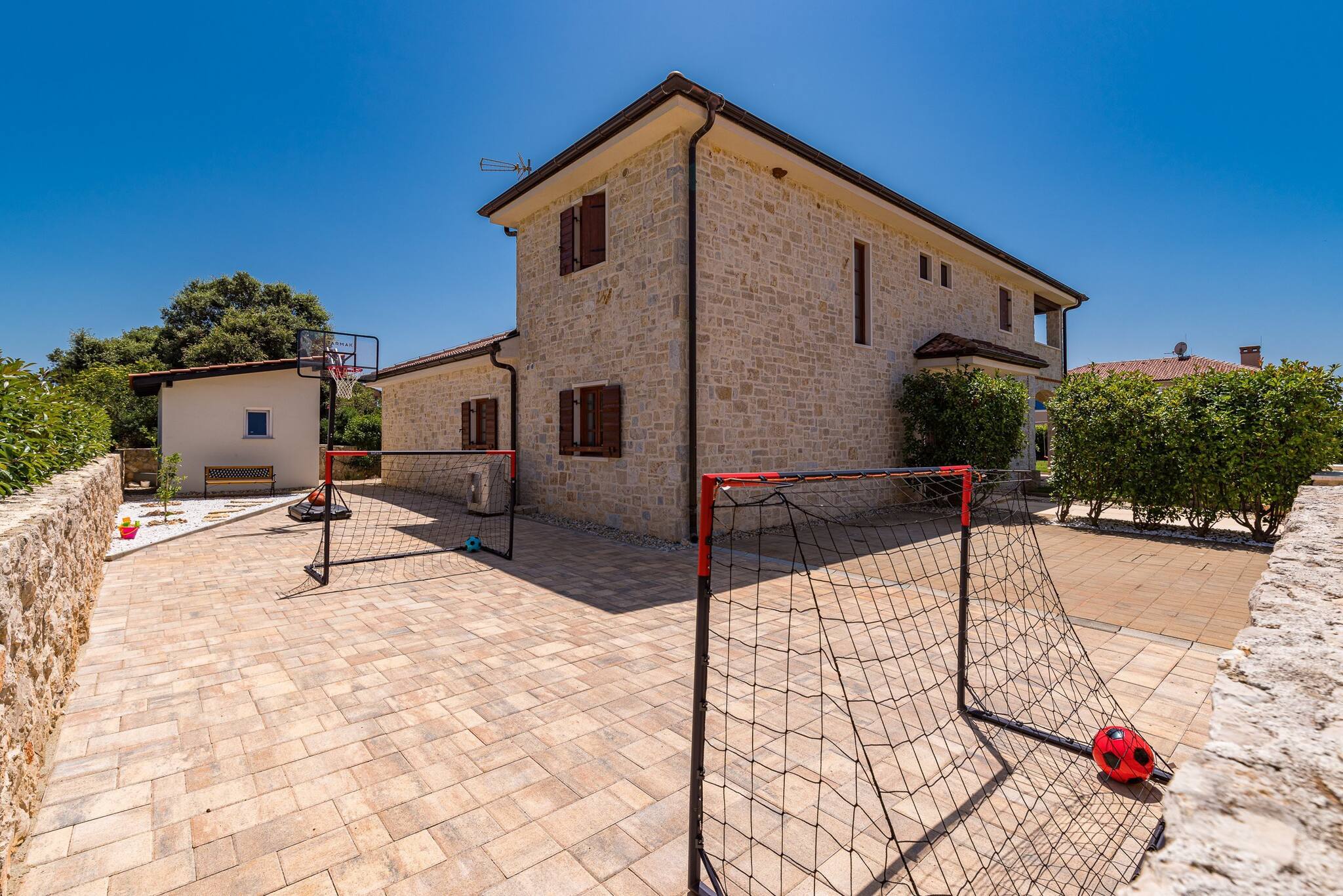 Private lawn with a net for volleyball and badminton, table tennis, a basketball hoop, soccer goals and a small children's playground.