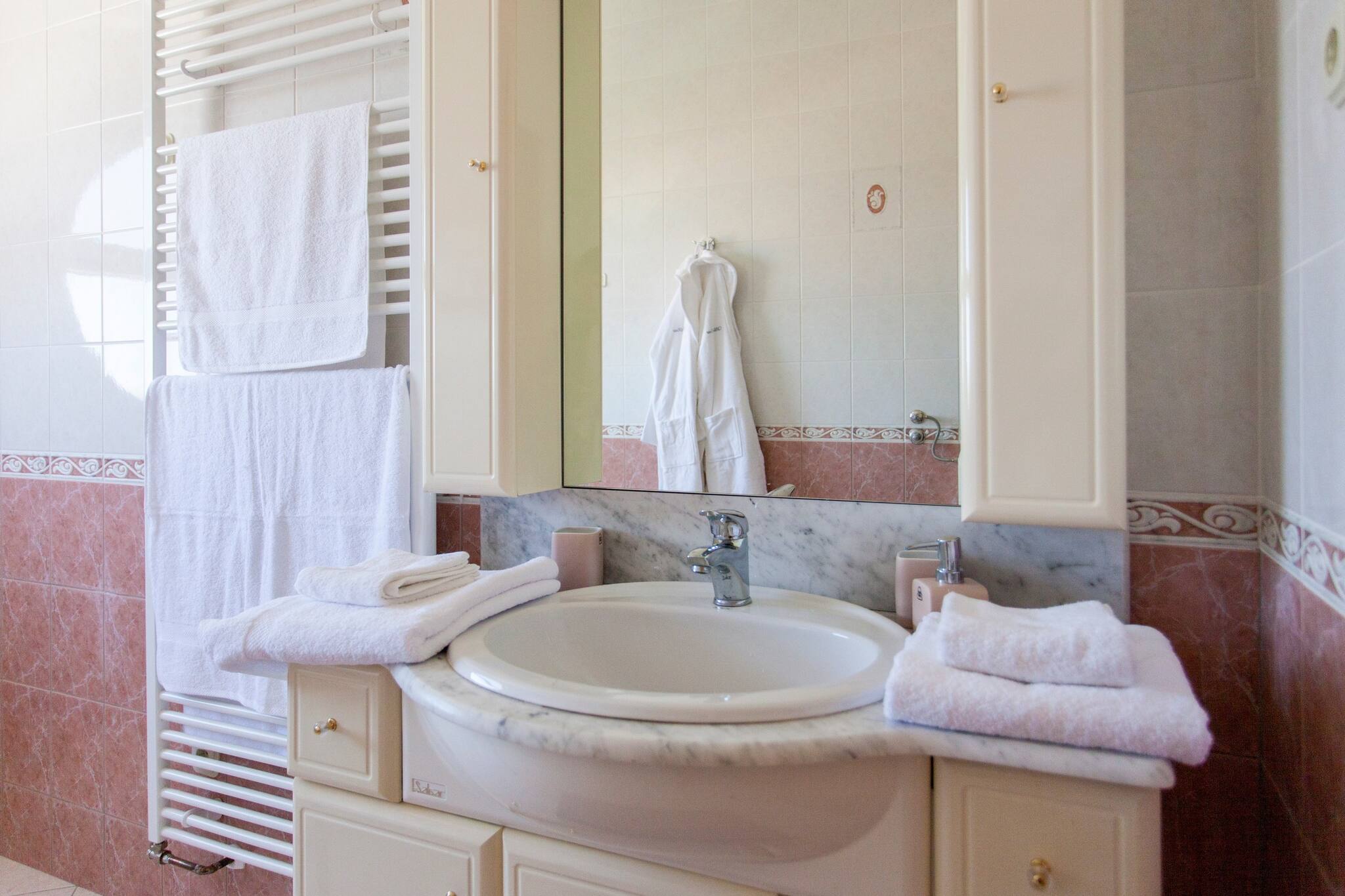 WiFi, Air conditioning, central heating, flat screen sat, smart TV, kitchen, stove, oven, icemaker, kitchen utensils, summer kitchen, water kettle, toaster, microwave, refrigerator, coffee maker, dishwasher, dining table, children's high chair, two bathrooms with shower and one with bath massagers, toilet, bide, hair dryer, free toiletries, one washing machine, balcony, terrace with the view on the sea, garden and surroundings, parking, yard, heated outdoor pool, BBQ facilities, outdoor shower, gym.
