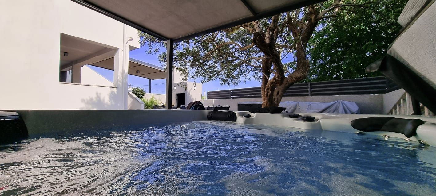 Outdoor jacuzzi for 5 people, 2 lying and 3 sitting places, heating up to 40 degrees, colored lights and massage.