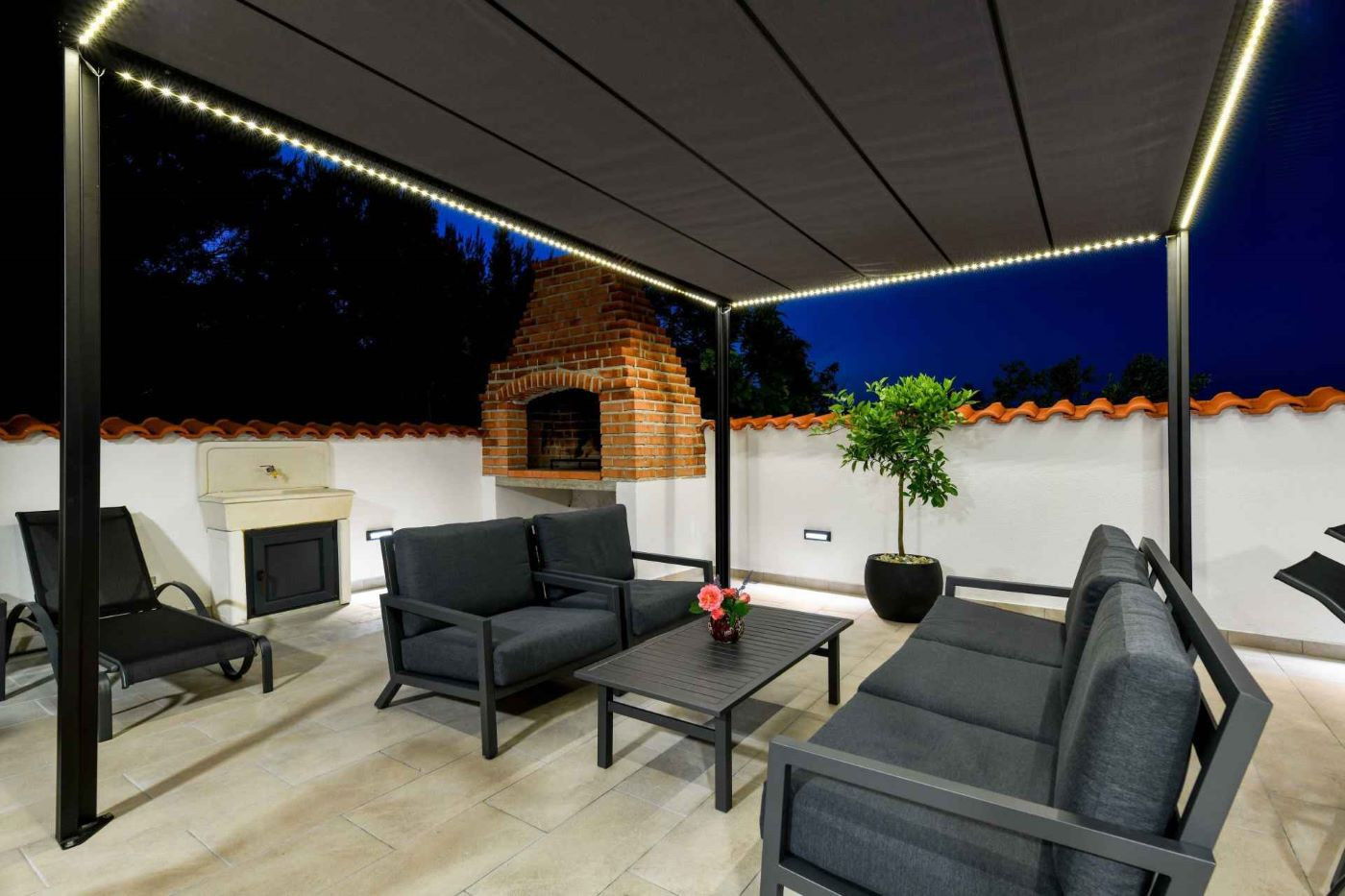 The villa boasts a range of modern amenities, including a fully equipped kitchen with a fridge, freezer, oven, and dishwasher, making it easy to prepare delicious meals. The cosy living area features a flat-screen TV and a fireplace, perfect for relaxing after a day of adventure.