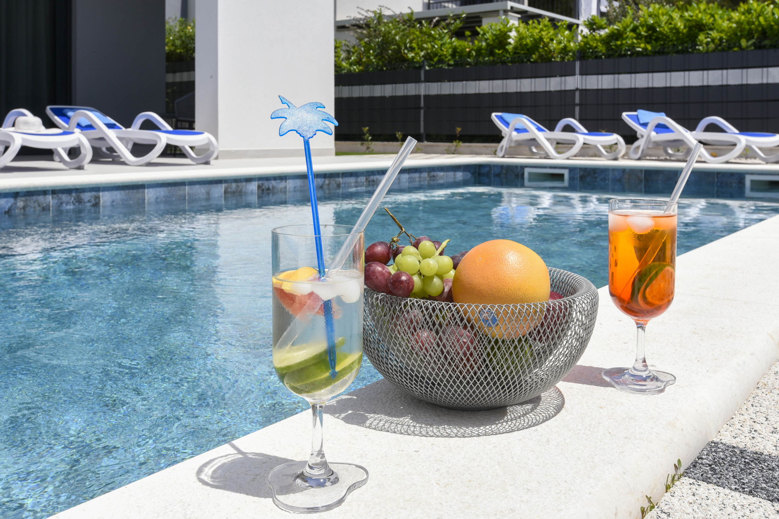 Heated outdoor pool, shower, parasol, sun loungers.