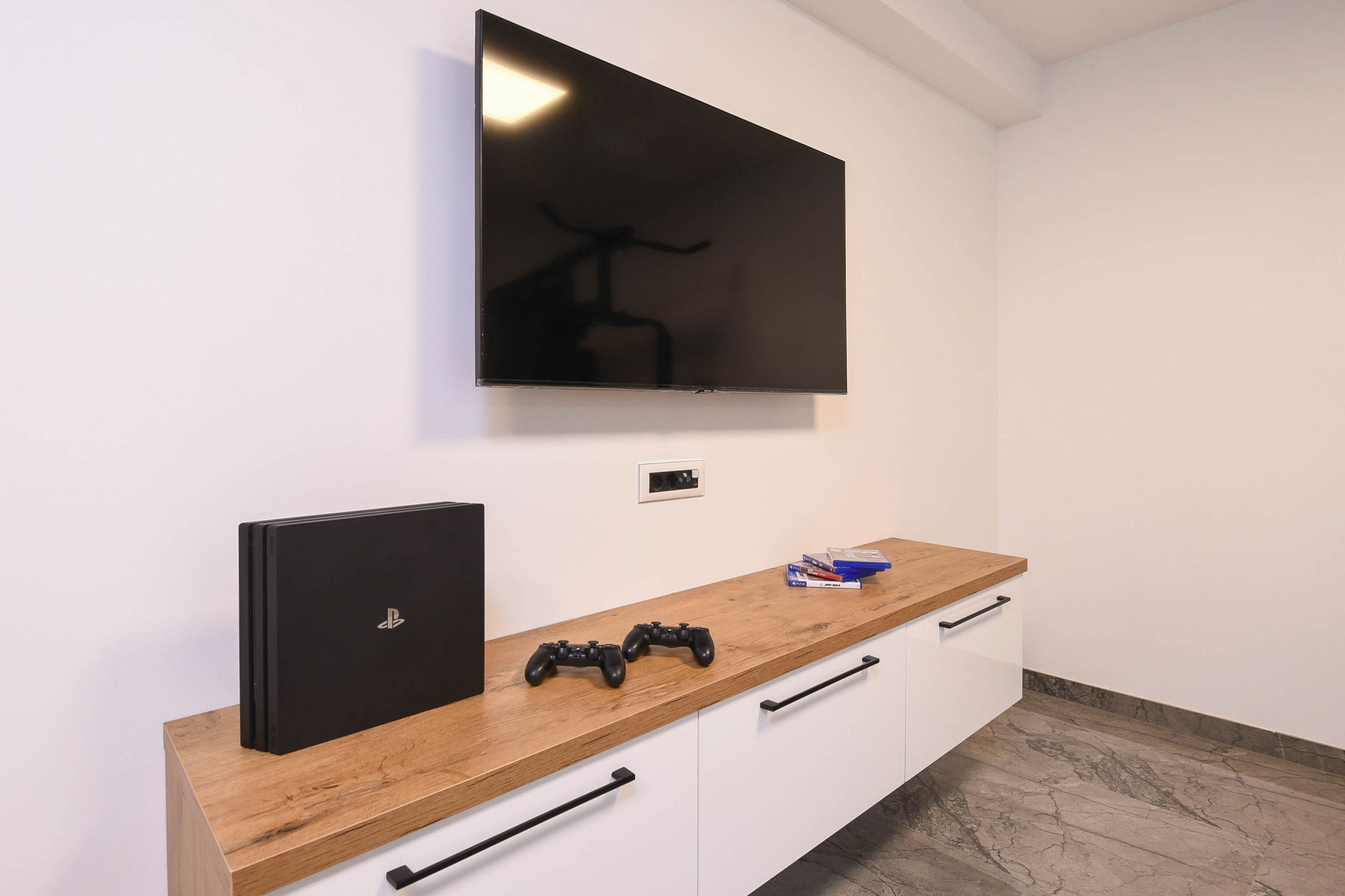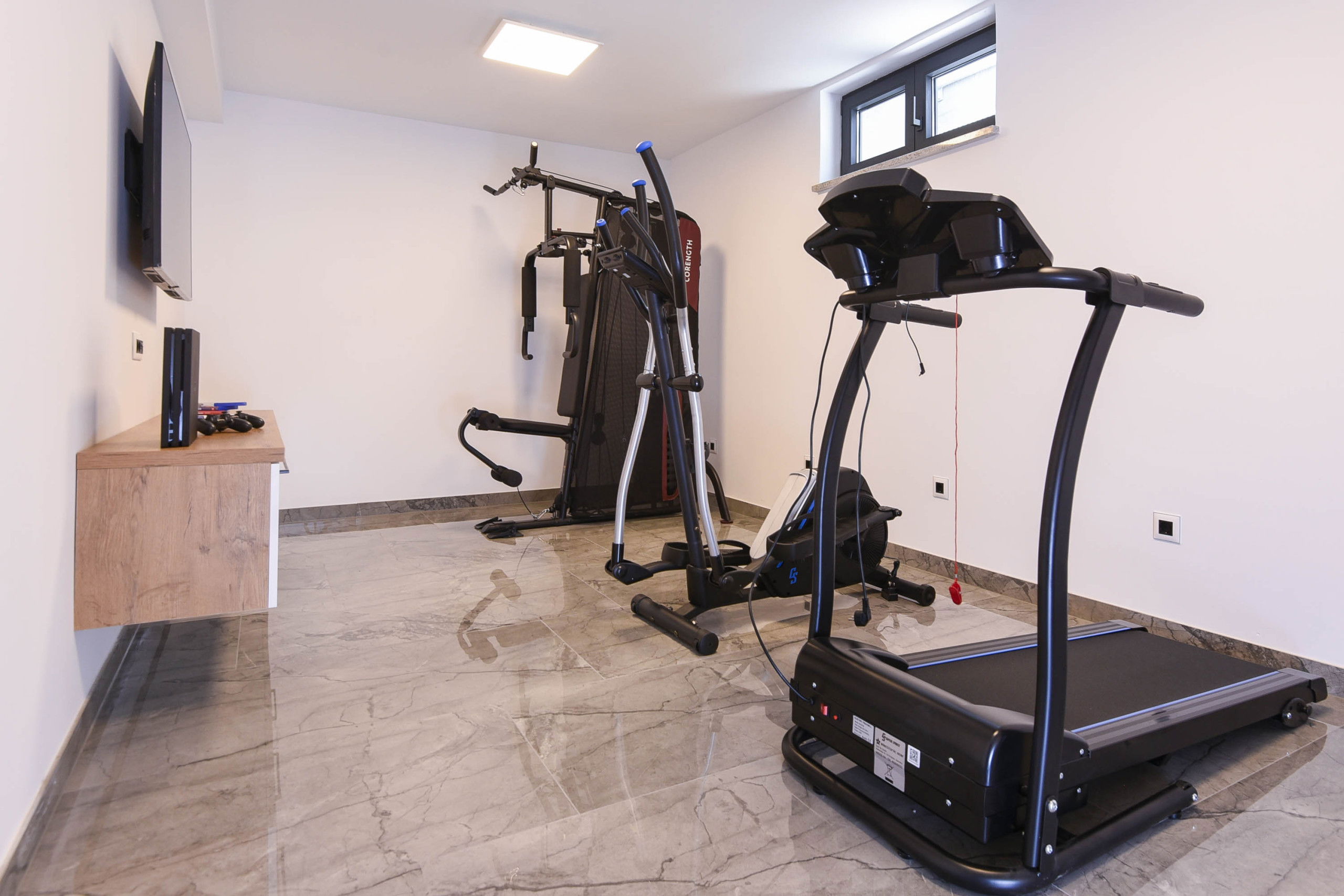 Room with a play station, flat screen TV and exercise equipment.