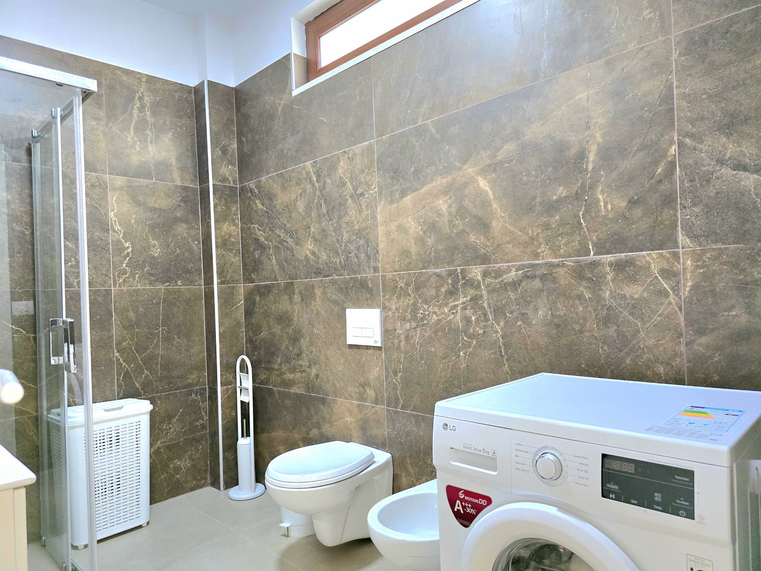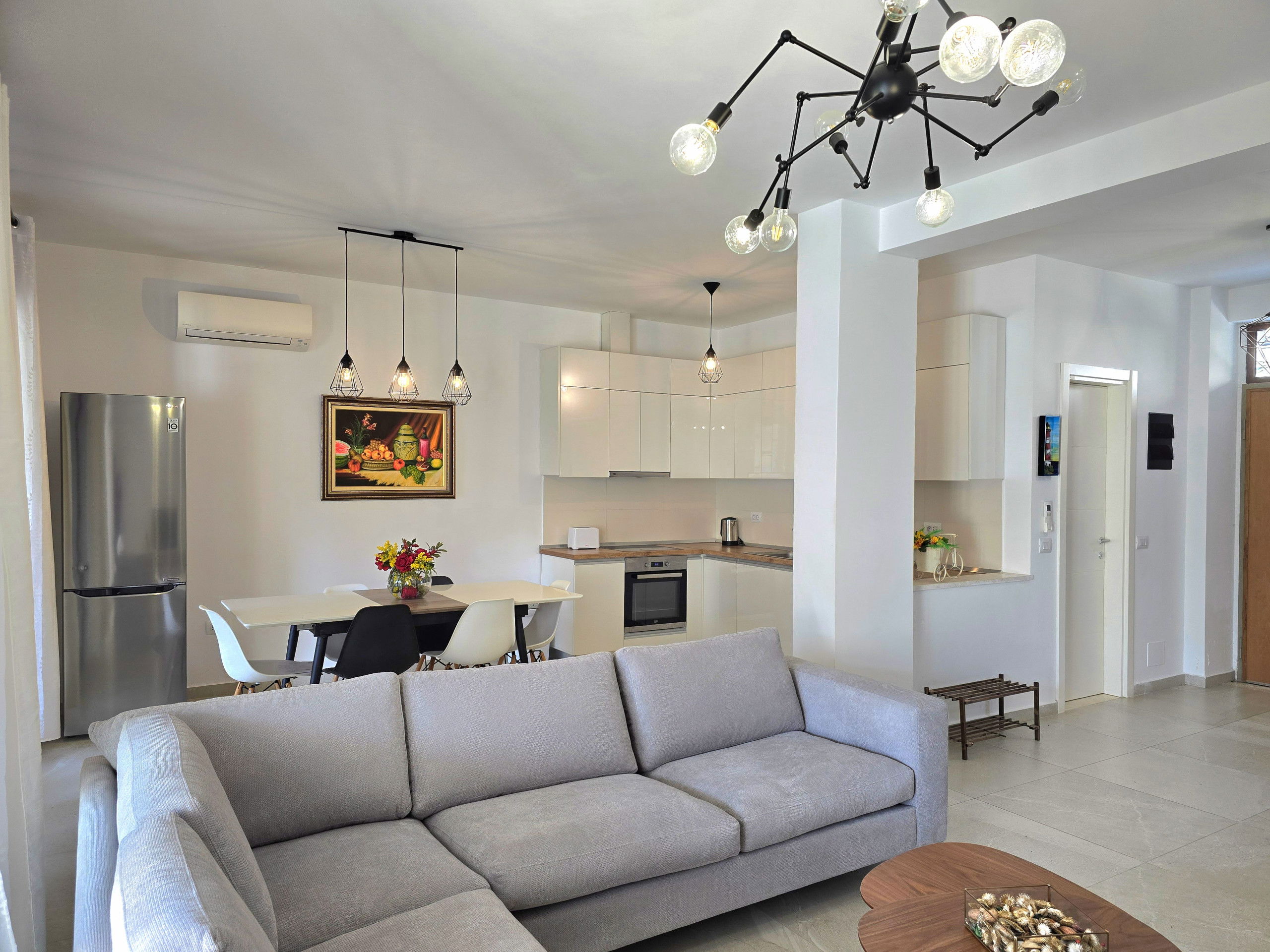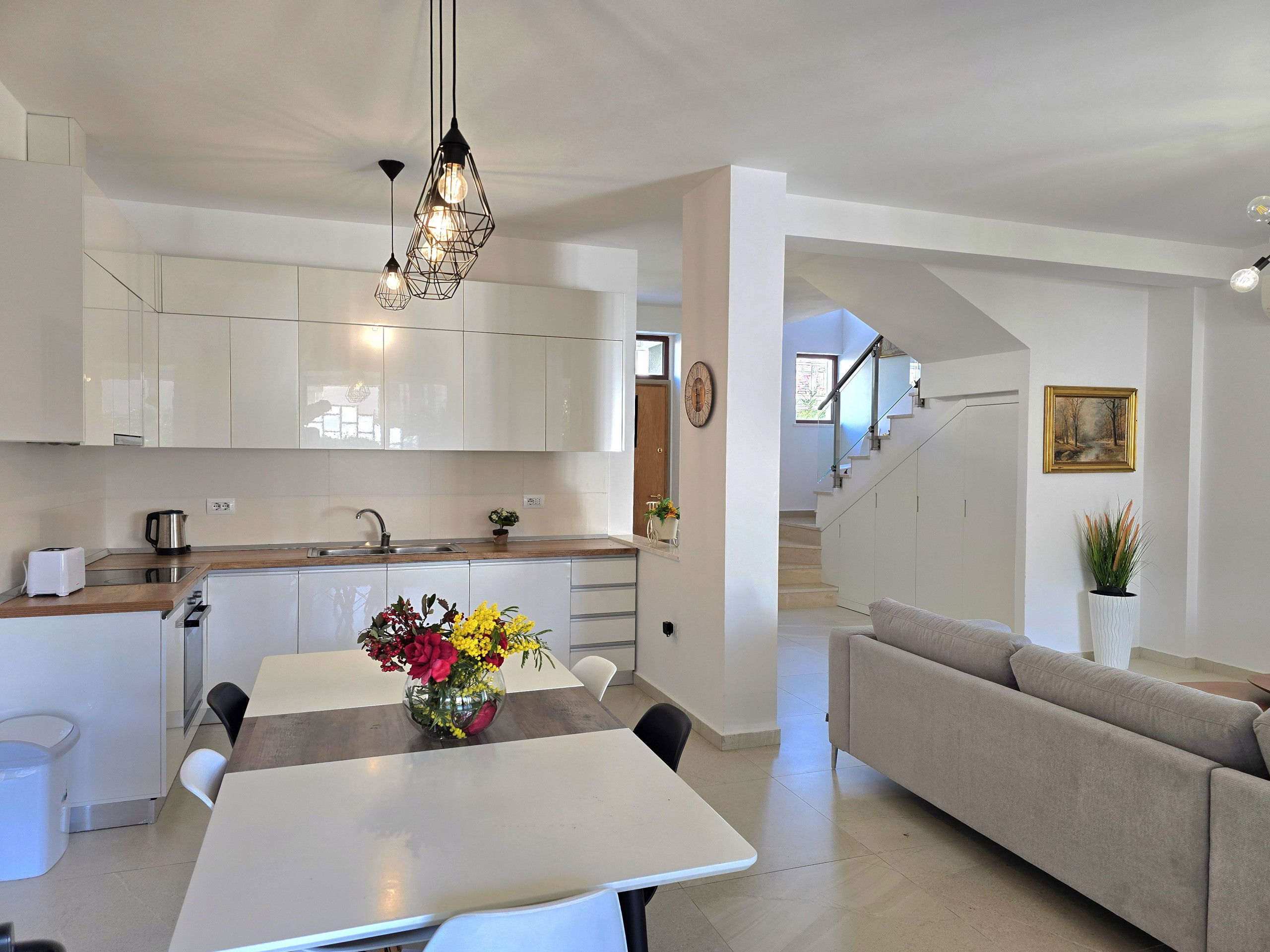 The living room is located on the ground floor with Smart TV Set. That is next to the kitchenette equipped with all appliances and a well organized dinning area with a big table and 8 chairs. Another bathroom located in the ground floor as well.