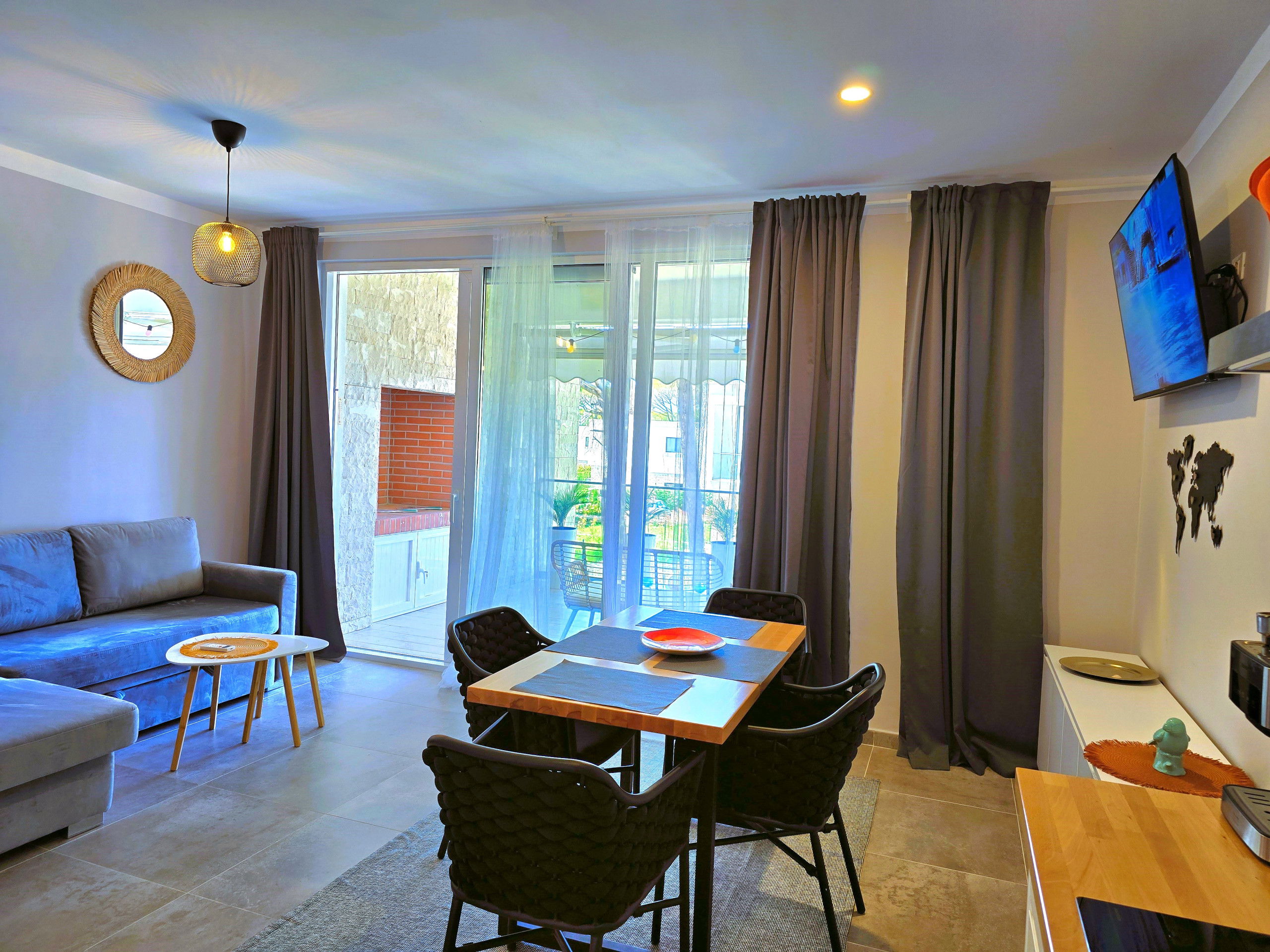 This accommodation is positioned on the floor of the building. The balcony makes a great atmosphere for late evenings and early mornings. It is nicely furnished and it has everything needed for a comfortable holiday.