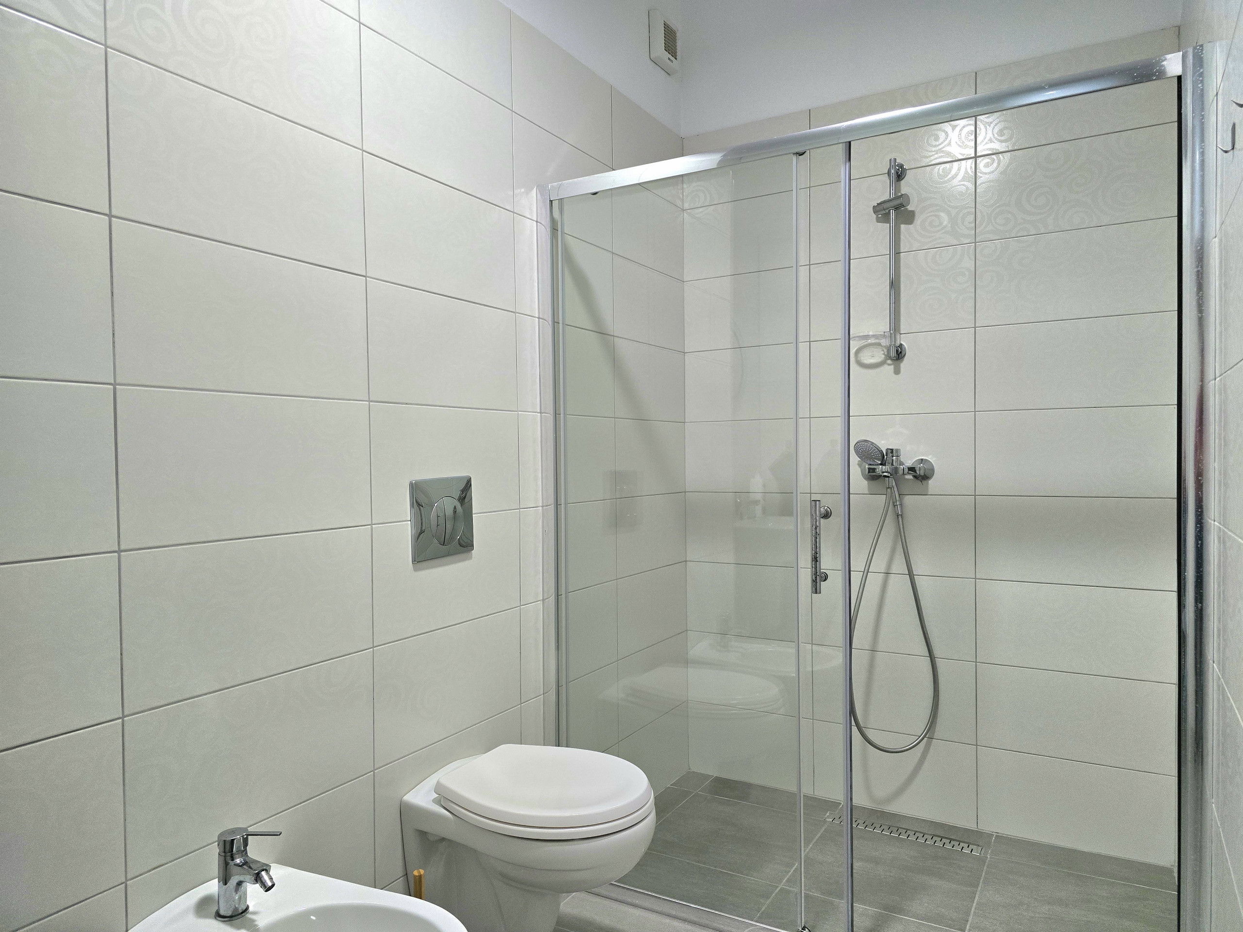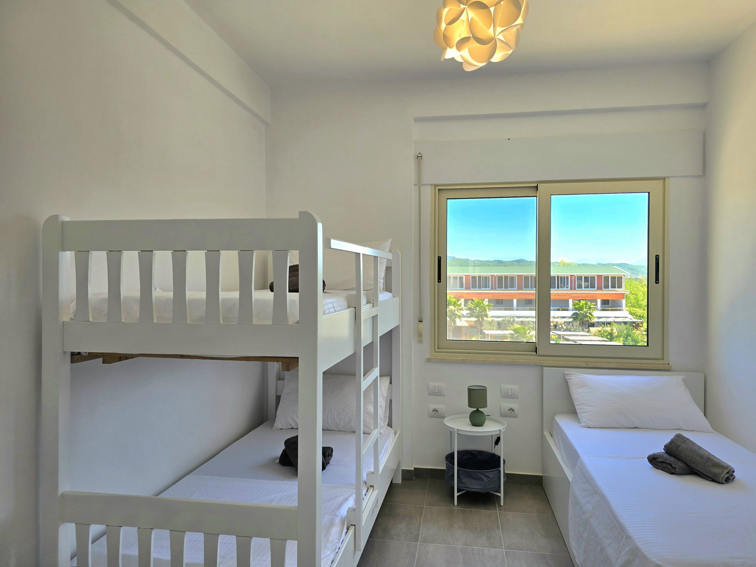 The apartment features two well-designed bedrooms with a versatile sleeping arrangement, including a queen-size bed, a bunk bed, an individual bed, and a sofa bed. Each room is equipped with individual air conditioning, ensuring personalized comfort for every guest. The two modern bathrooms, both with shower facilities, provide convenience and privacy.