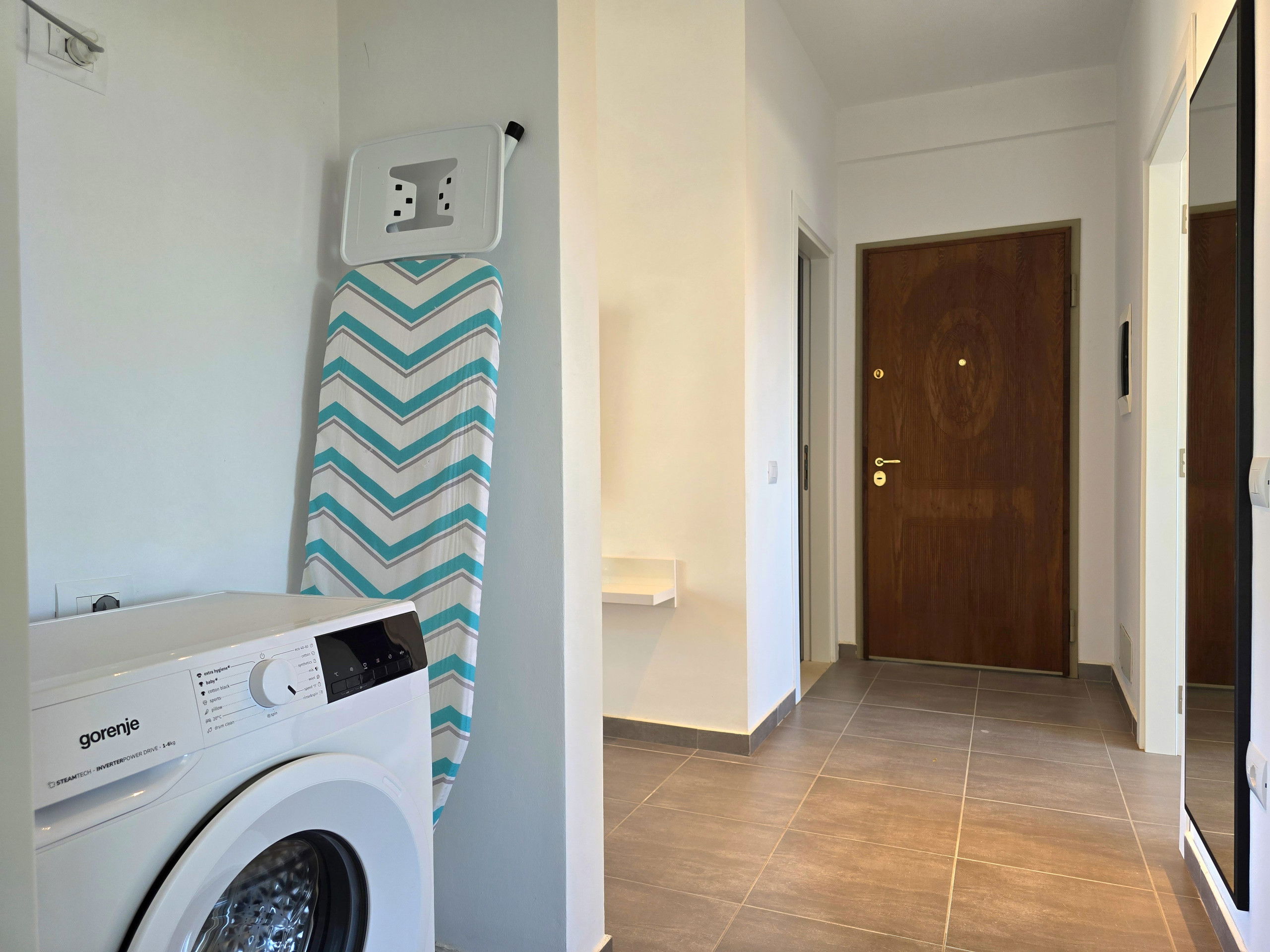 Step out onto the private balcony and enjoy the stunning sea views or relax in the garden furniture. The apartment offers two private parking spaces nearby, adding to the convenience. High-speed WiFi, a TV, and essential amenities like an iron and clothes drying rack ensure a comfortable and connected stay.