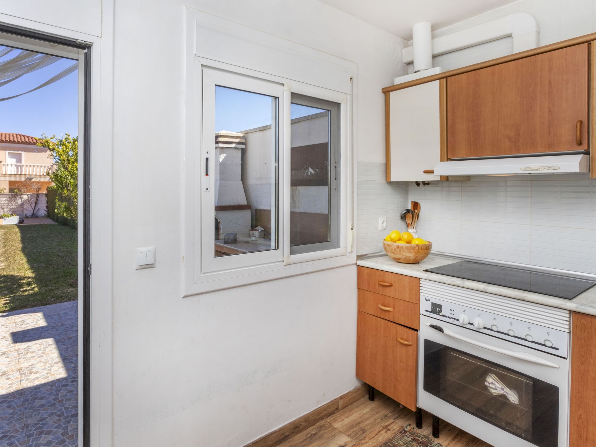 Las Tres Calas 3 km from l'Ametlla: Simple, comfortable terraced house "Palmera III". In a quiet position, 3 km from the sea. Private: garden with lawn, swimming pool (6 x 3 m, depth 80 - 190 cm, seasonal availability: 01.Apr. - 30.Oct.). Outdoor shower, terrace, garden furniture, barbecue, pool maintenance by the owner/gardener. Parking at the house. Shop 1.5 km, supermarket 1.5 km, restaurant 1.5 km, bus stop 600 m, railway station "Ametlla de Mar" 3.8 km. Nearby attractions: Parque Portaventura 48 km, parque Aquopolis 51 km, parque natura del Delta del Ebro 35 km, Tarragona 57 km, Reus 48 km, Barcelona 153 km.
