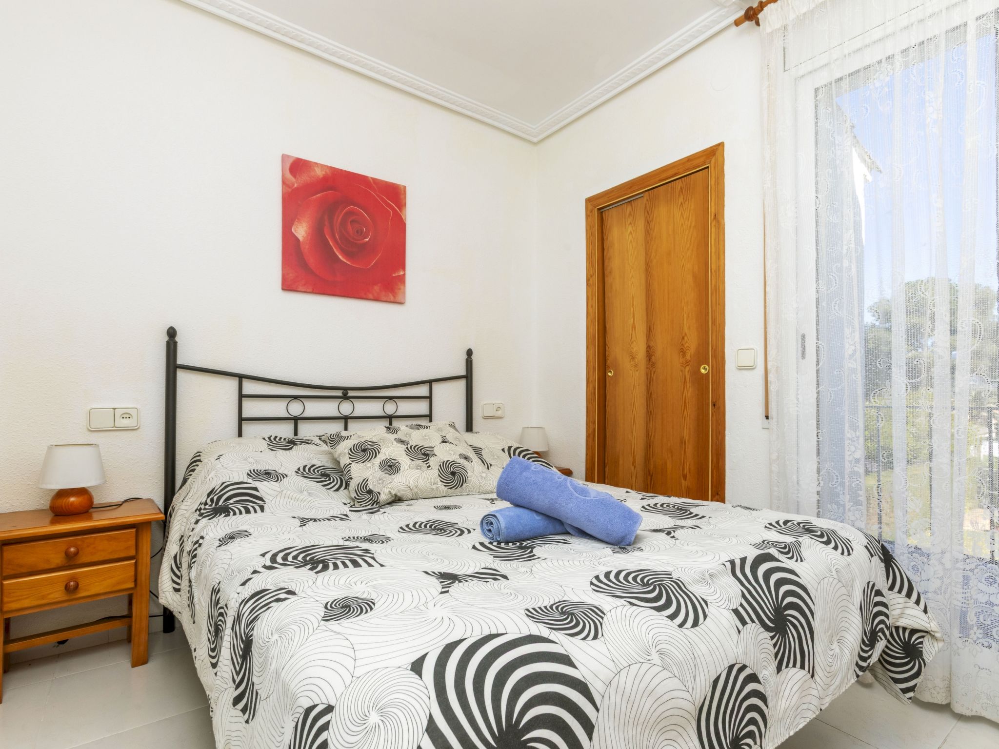 "Palmera III", 4-room terraced house 90 m2 on 2 levels. Comfortable and cosy furnishings: living/dining room with dining table, digital TV and air conditioning. Exit to the terrace. 1 room with 1 french bed (135 cm, length 190 cm), shower/bidet/WC. Kitchen (oven, dishwasher, 3 ceramic glass hob hotplates, toaster, microwave, electric coffee machine). Exit to the garden, to the swimming pool. Shower/WC. Upper floor: 1 room with 1 french bed (150 cm, length 190 cm). Exit to the balcony. 1 room with 2 beds (90 cm, length 190 cm). Interconnecting room with air conditioning. Shower/WC. Garden, lawn. Terrace furniture, barbecue. View of the swimming pool and the garden. Facilities: washing machine, iron, mosquito net, hair dryer. Internet (WiFi, free). Parking at the house. Maximum 2 pets/ dogs allowed. HUTTE-000680