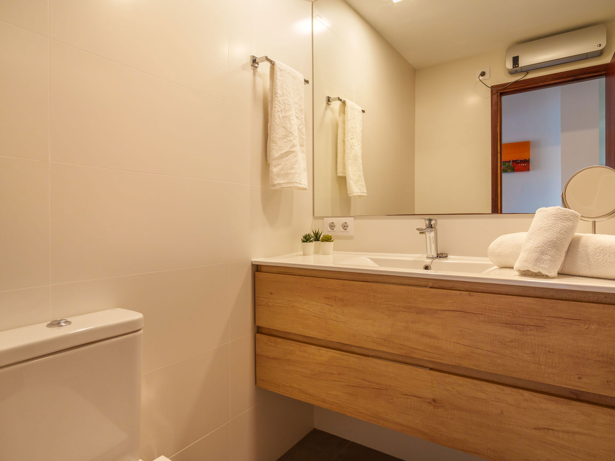 "Playa Blanca 100m Sandy Beach", 3-room apartment 100 m2 on 2nd floor. Object suitable for 4 adults. Spacious and bright, partly renovated, simple and practical furnishings: large living/dining room with dining table, digital TV, flat screen, air conditioning and forced-air heating. Exit to the terrace. 1 double bedroom with panoramic window with 1 french bed " 400 m, ferry "Port d'Alcúdia" 3.2 km, sandy beach "Playa de Alcúdia" 60 m. Sports harbour 2.5 km, marina 2.5 km, golf course (18 hole) 5.6 km, walking paths from the house 1.5 km, cycle lane 1 km. Nearby attractions: Alcúdia Old Town 3.6 km, Playa de Muro 3 km, Can Picafort 8 km, Palma City 52 km, Playa y Faro de Formentor 25 km, Mallorca Fashion Outlet & Cinemas 43 km. Well-known lakes can easily be reached: Lago Mayor. Hiking paths: Puig de Sant Martí, Albufera de Mallorca, Atalaya de Alcúdia. Please note: no lift. Object suitable for 4 adults. The owner does not accept any youth groups. Airfield 60 km from the property. Additional accommodations can be booked. Property ref. ES8356.170.1 is situated on the same property. Neighbourhood highly sensitive to noise. Quietness and good behaviour expected.
