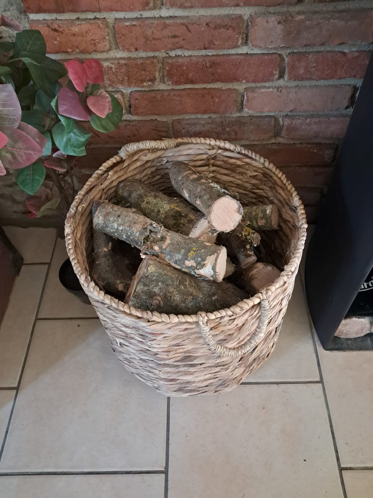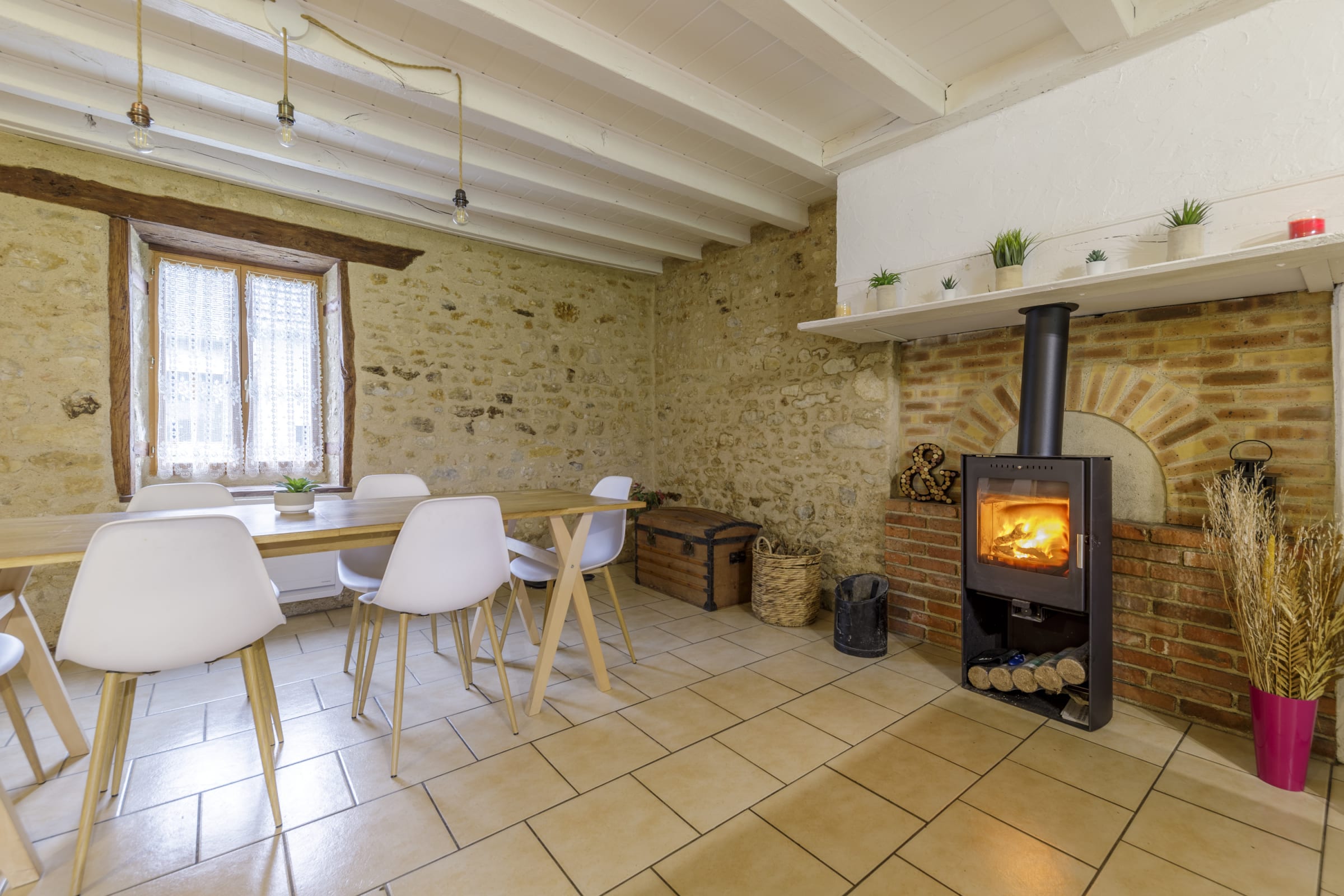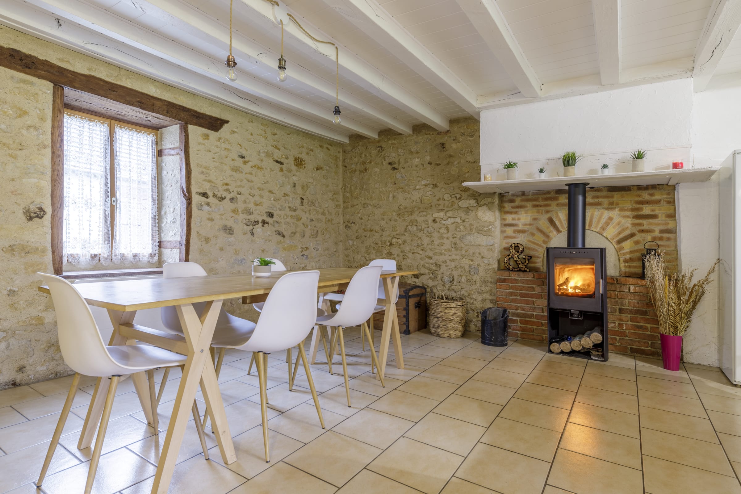Dining area with a large table, 6 chairs, and a wood-burning stove.
