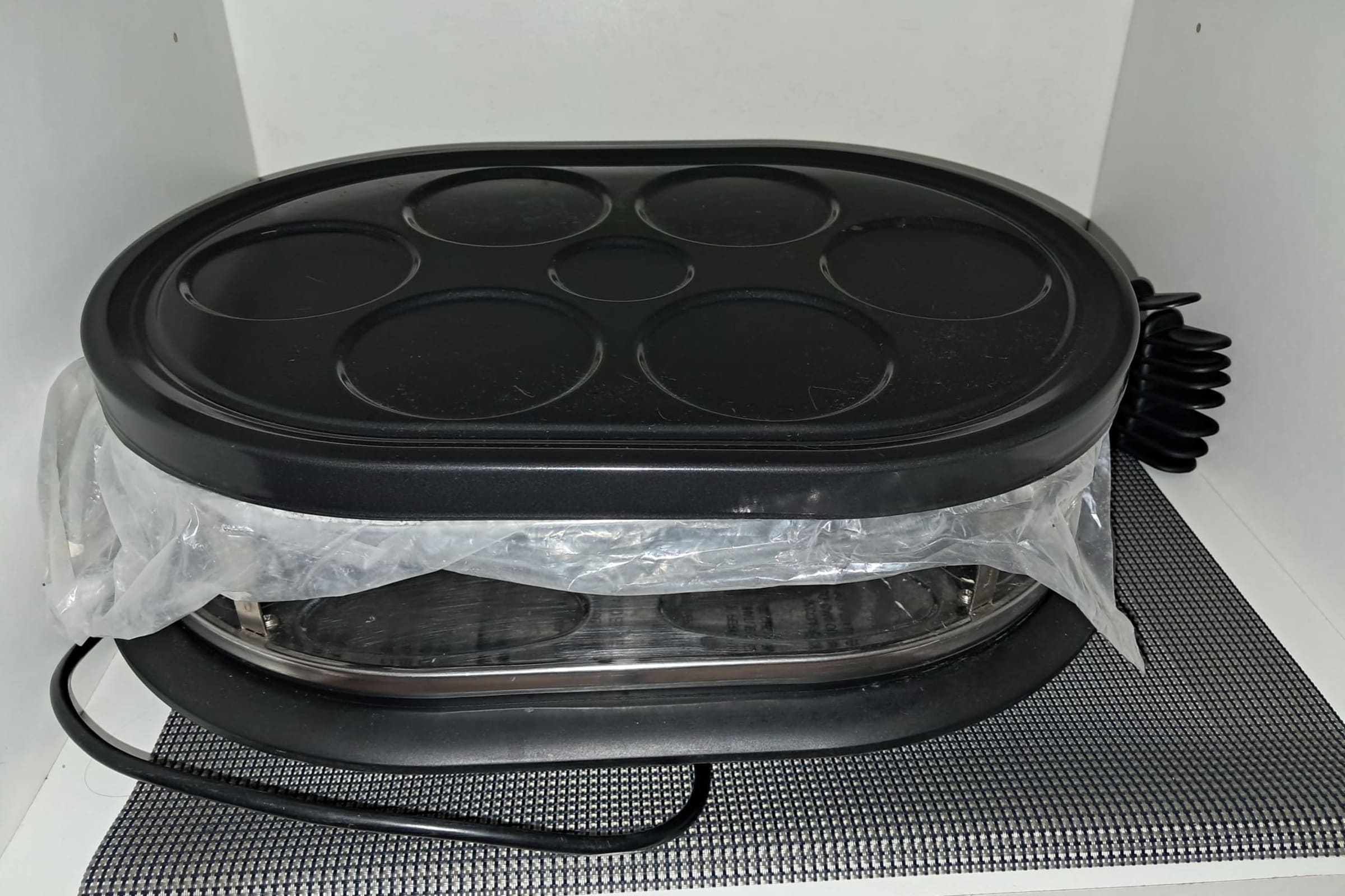 A kitchen equipped with a refrigerator, hob, extractor hood, oven, microwave, Nespresso coffee machine, and a raclette/crepes maker.