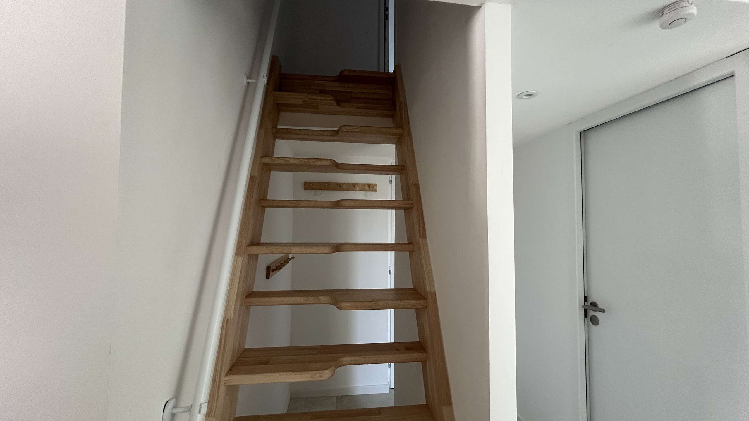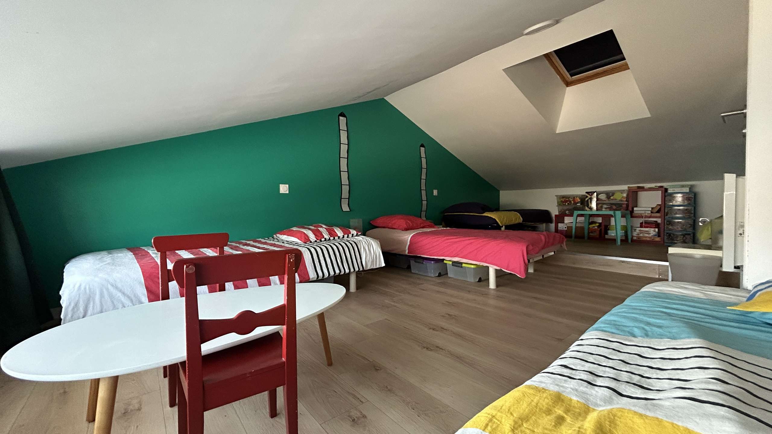 Upstairs: an attic bedroom with five single beds with access via a Japanese staircase (not very suitable for people with mobility problems).