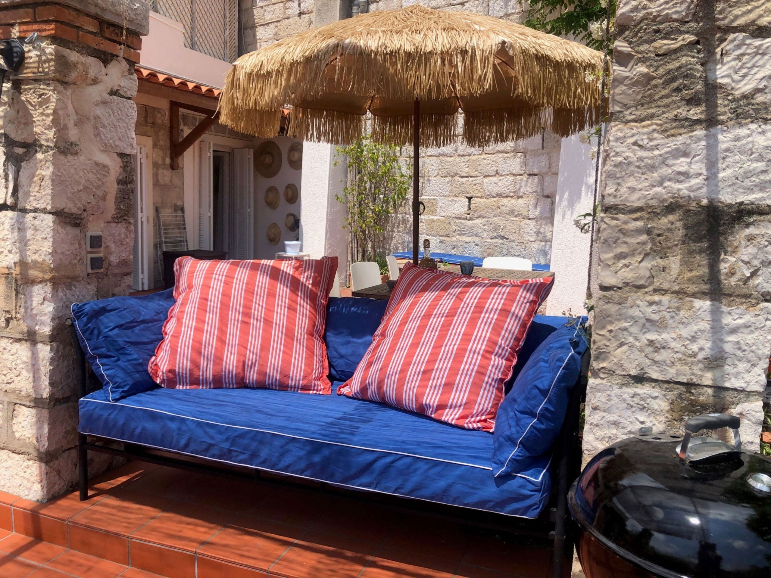 Small aperitif area with outdoor sofa under the pergola facing the bay. Free parking space in the street in front of the property.