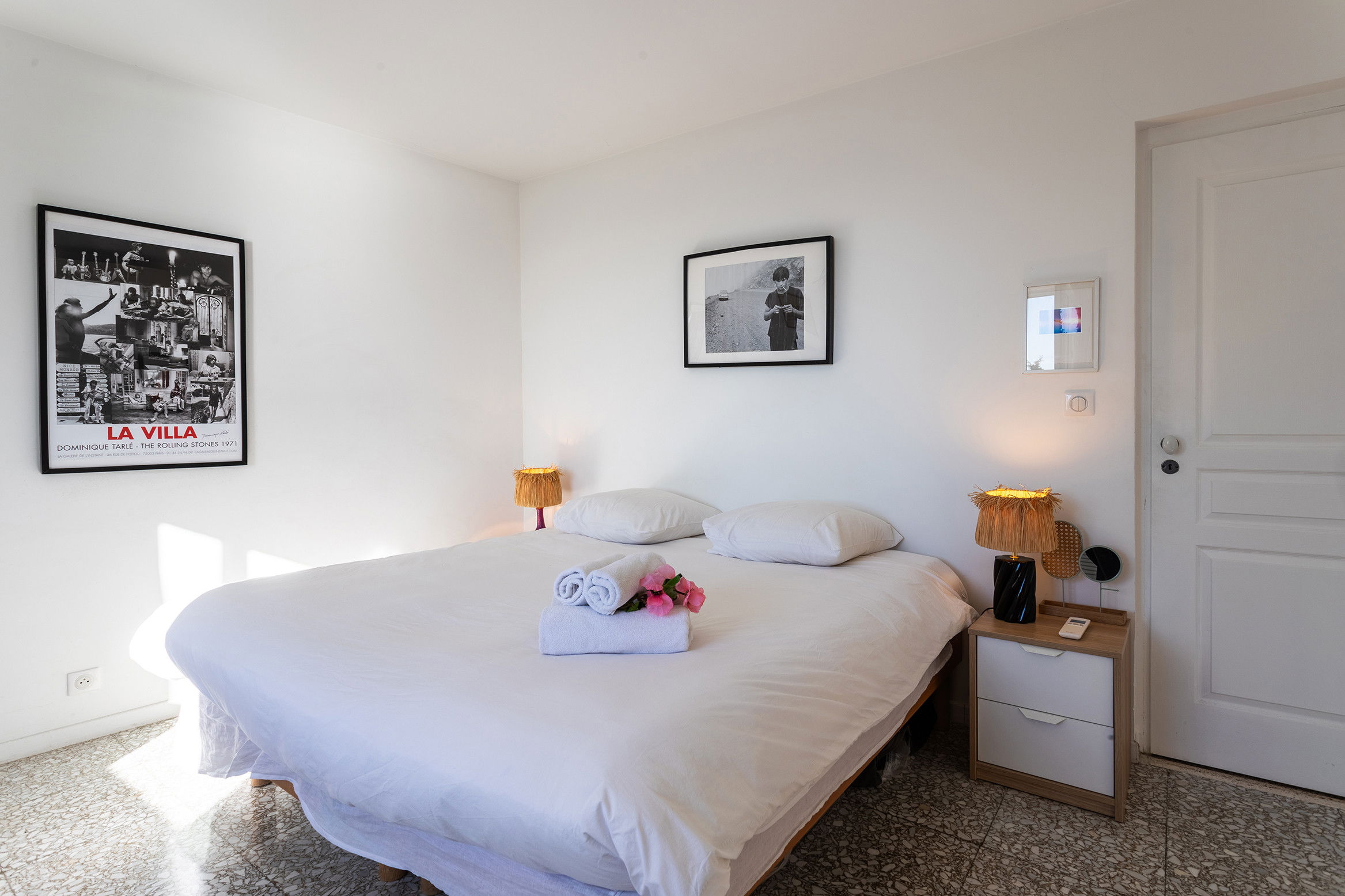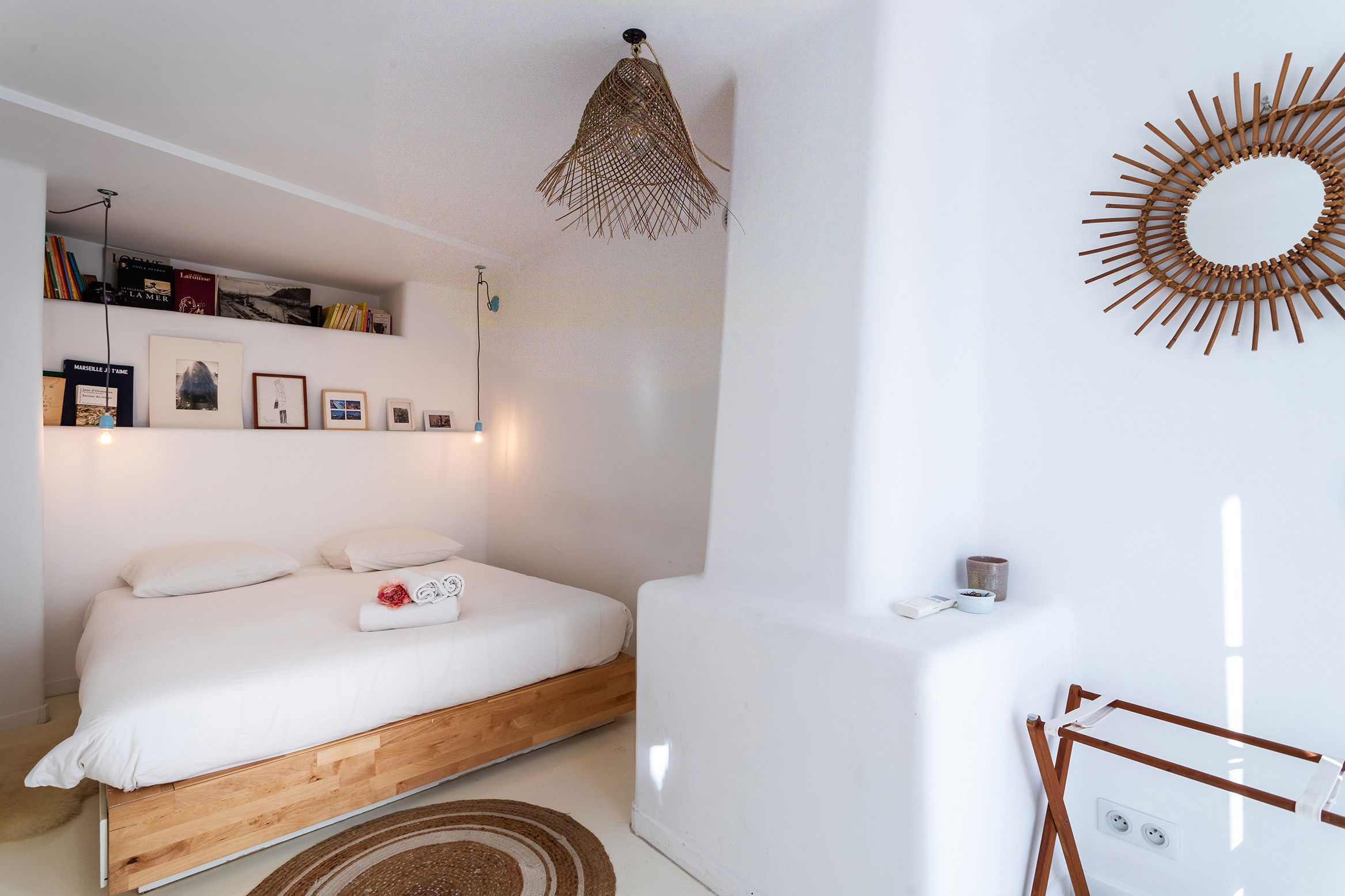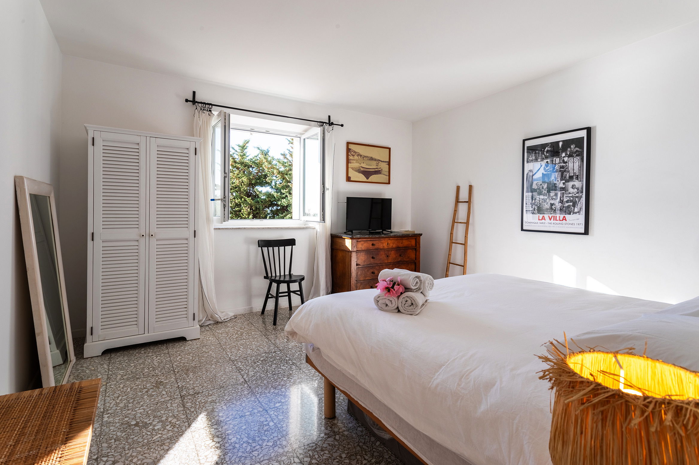 The bedroom with a 180*200 cm bed, bedside tables and a wardrobe. Window opening to the outside and offering a superb view of the sea and bay.